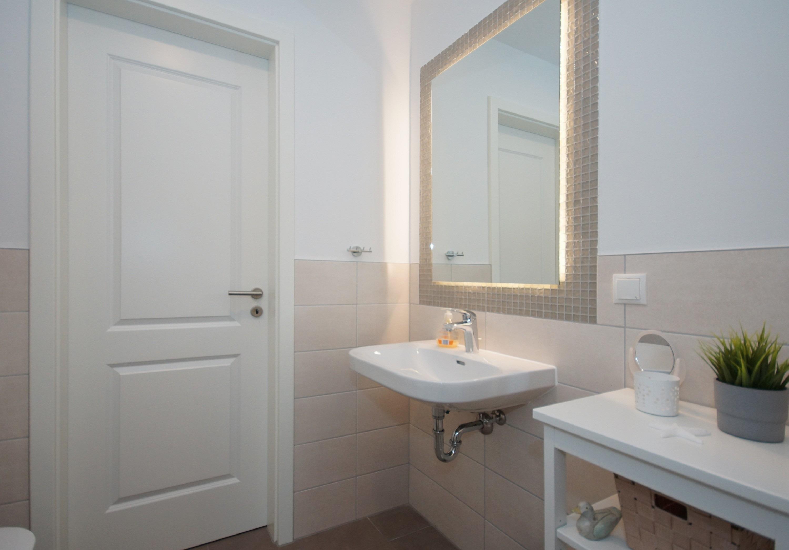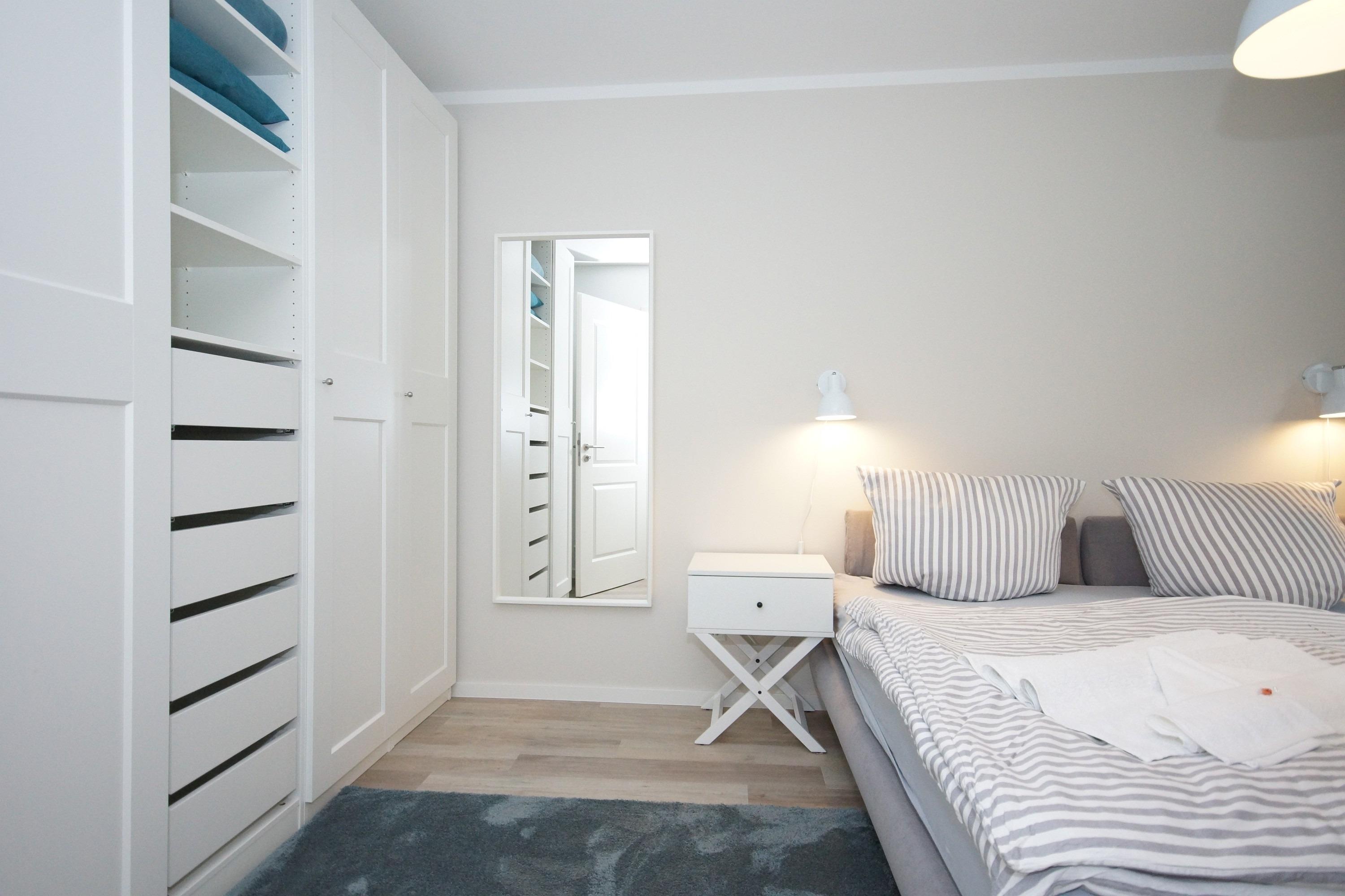 Neben einem Tageslicht-Badezimmer mit flacher Dusche, steht Ihnen auch ein zusätzliches Gäste-WC zur Verfügung. Die Ferienwohnung verfügt über 2 ruhige Schlafzimmer. In beiden finden Sie ein bequemes Boxspring-Doppelbett (180 x 200 cm).