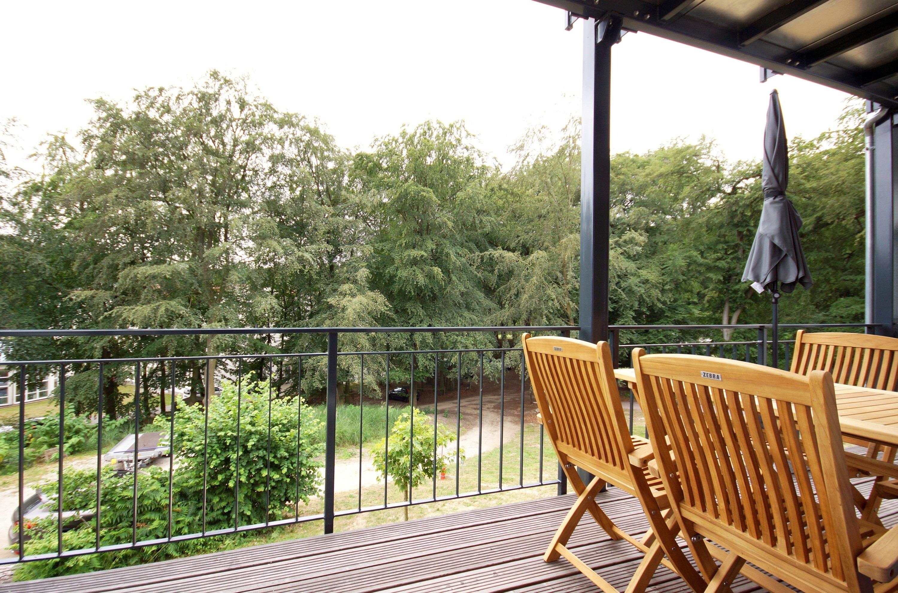 Auf dem weitläufigen Süd-Balkon genießen Sie auf ausgewählten Gartenmöbeln sonnige Stunden mit Blick ins Grüne.