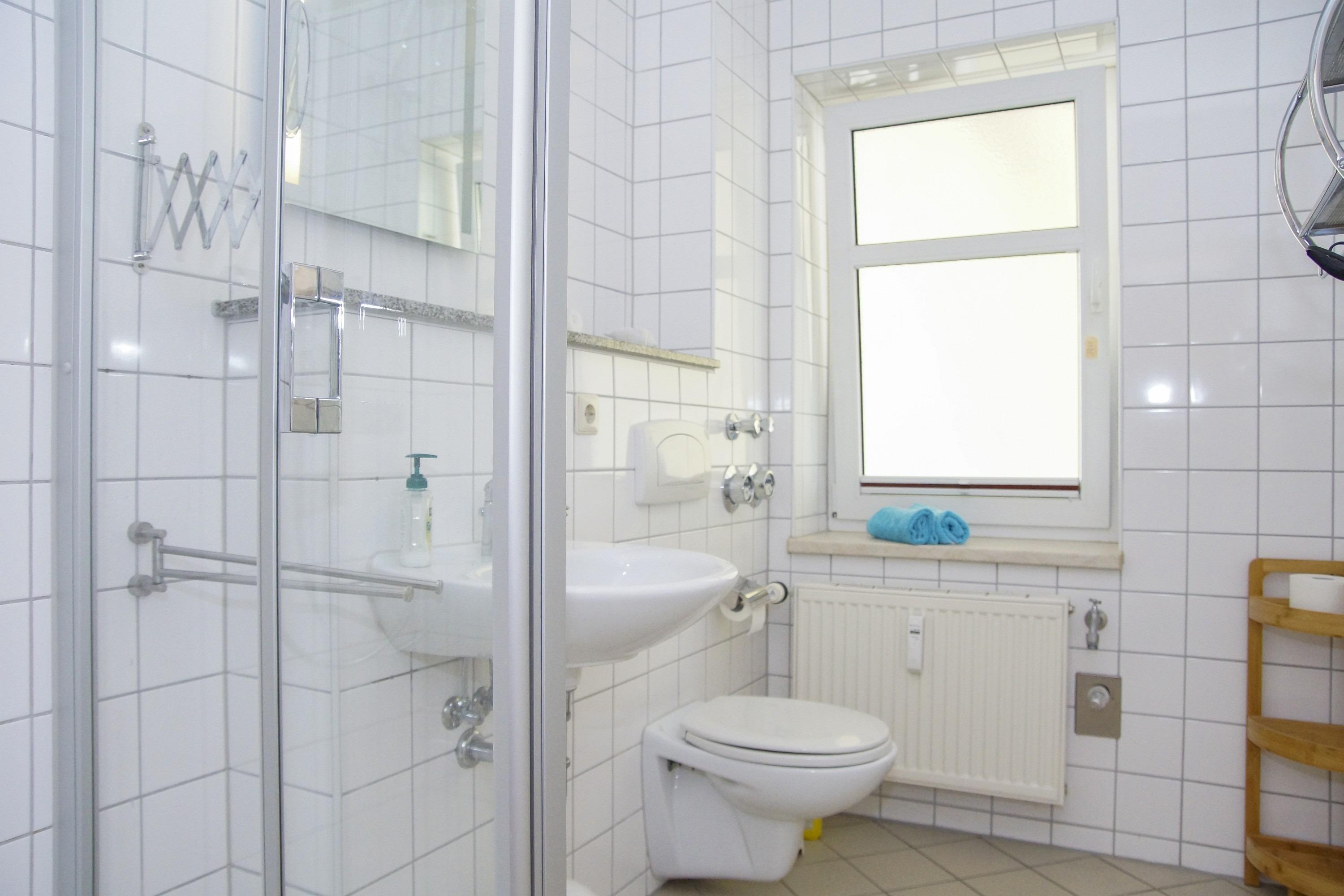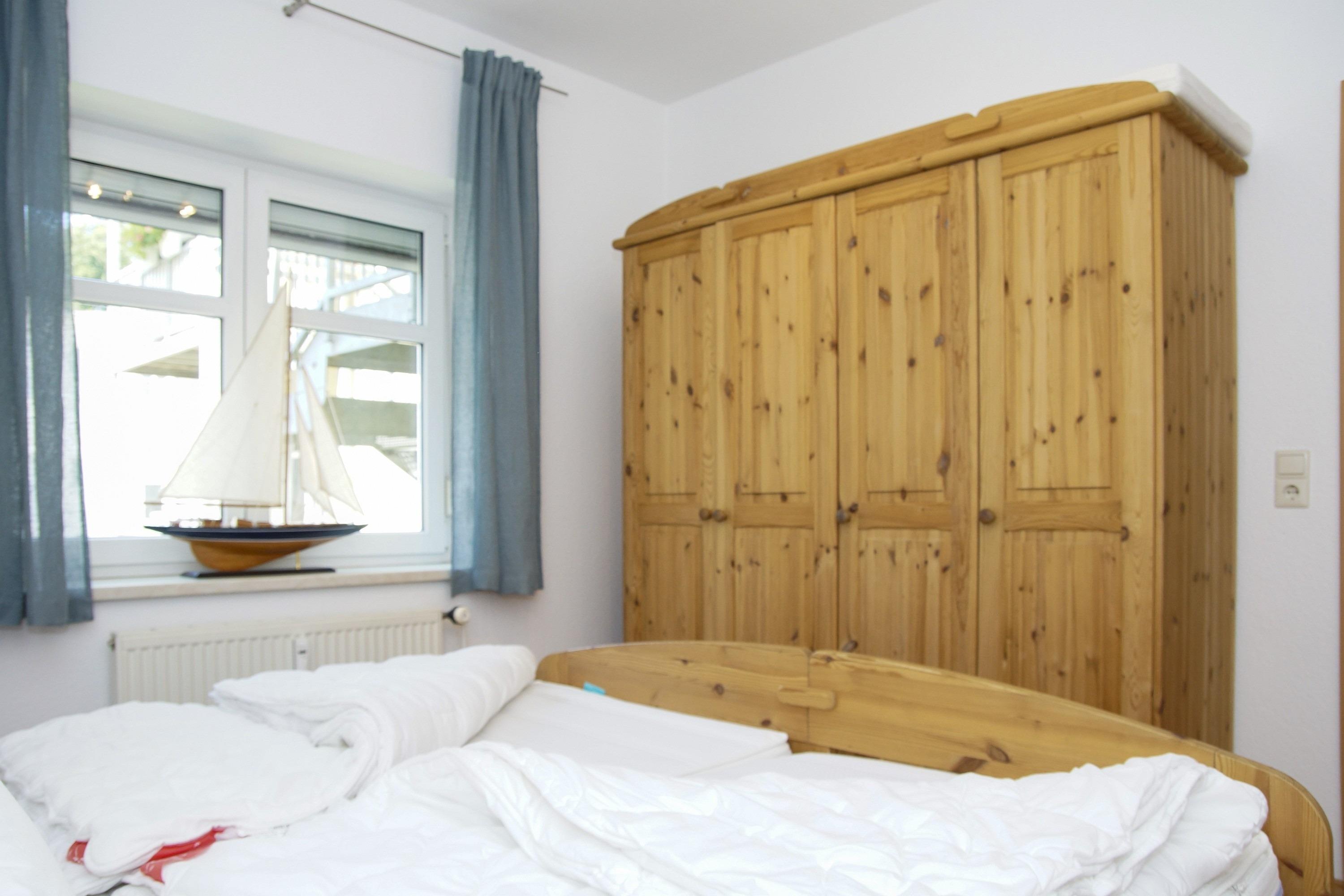 Im Schlafbereich befindet sich neben einem großen Kleiderschrank auch ein komfortables Doppelbett. Das Tageslicht-Badezimmer ist mit einer Dusche und einem WC ausgestattet.