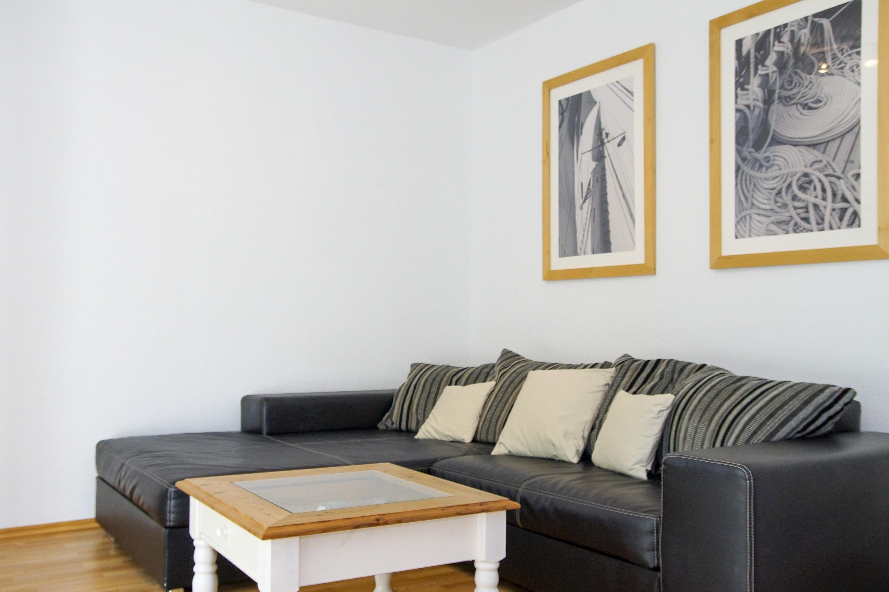 Das modern eingerichtete Wohnzimmer mit TV und Schlafcouch bietet Ihnen nicht nur Zugang zum sonnigen Balkon, sondern auch einen hellen Essbereich.