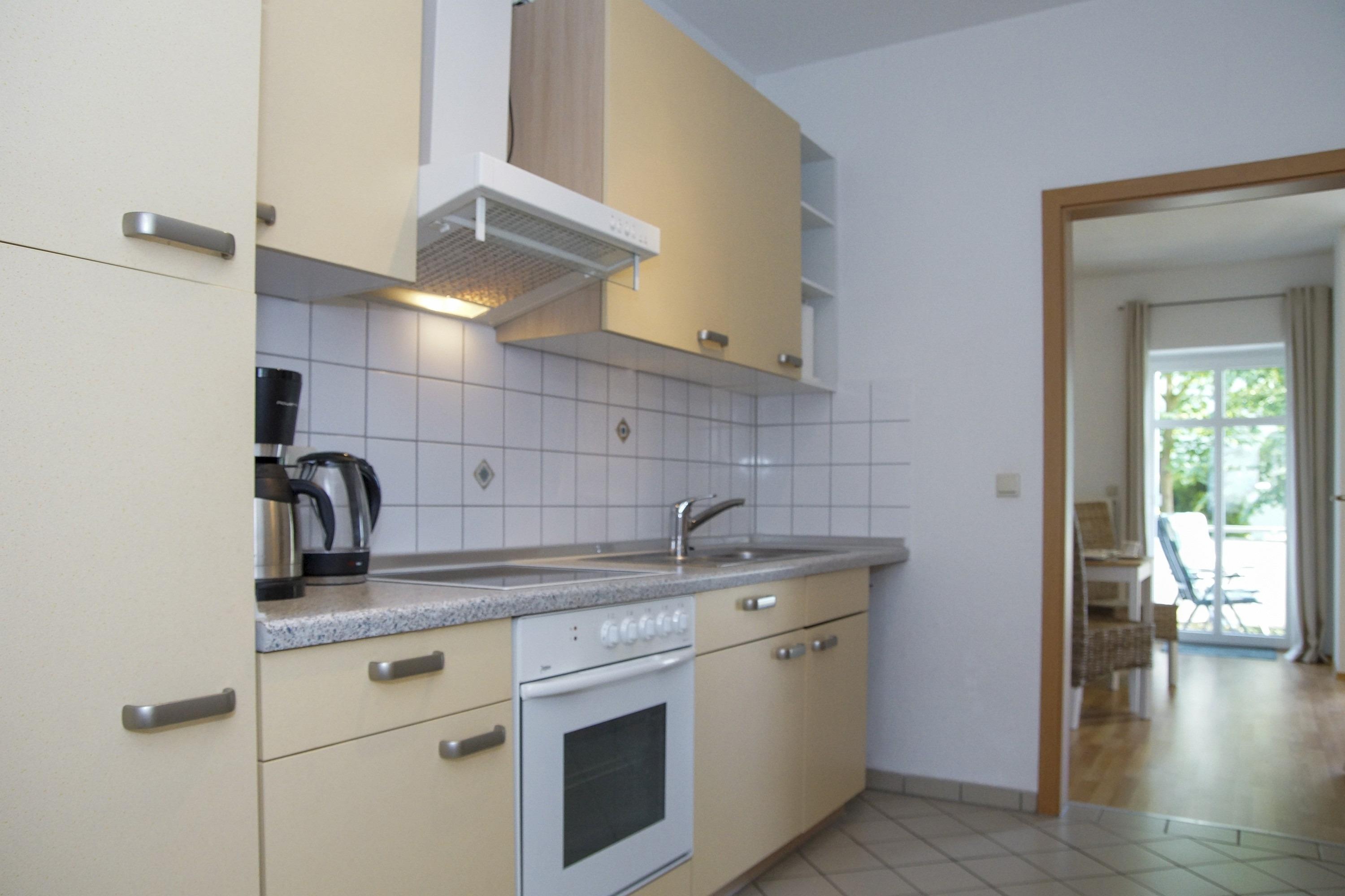 Die Küchenzeile ist mit allem ausgestattet, was es für das tägliche Leben braucht; einen Kühlschrank, einen 4-Platten-Herd, eine Mikrowelle und allerlei Küchenkleingeräte (Kaffeemaschine, Wasserkocher...).