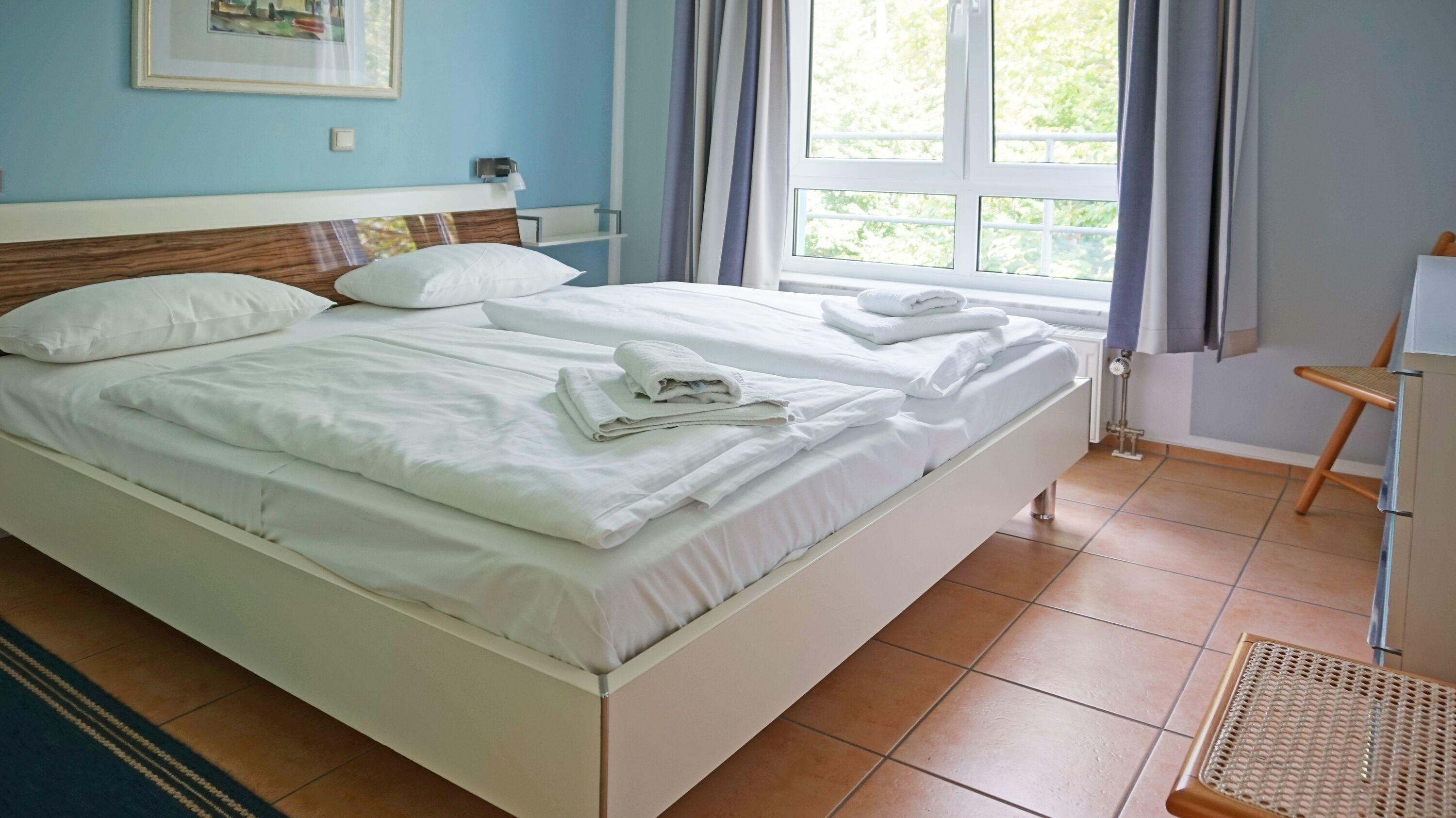 Der Schlafbereich ist mit einem großen Doppelbett (180 x 200) ausgestattet. Nebenan befindet sich ein großer, begehbarer Kleiderschrank für Ihre Lieblingsstücke.