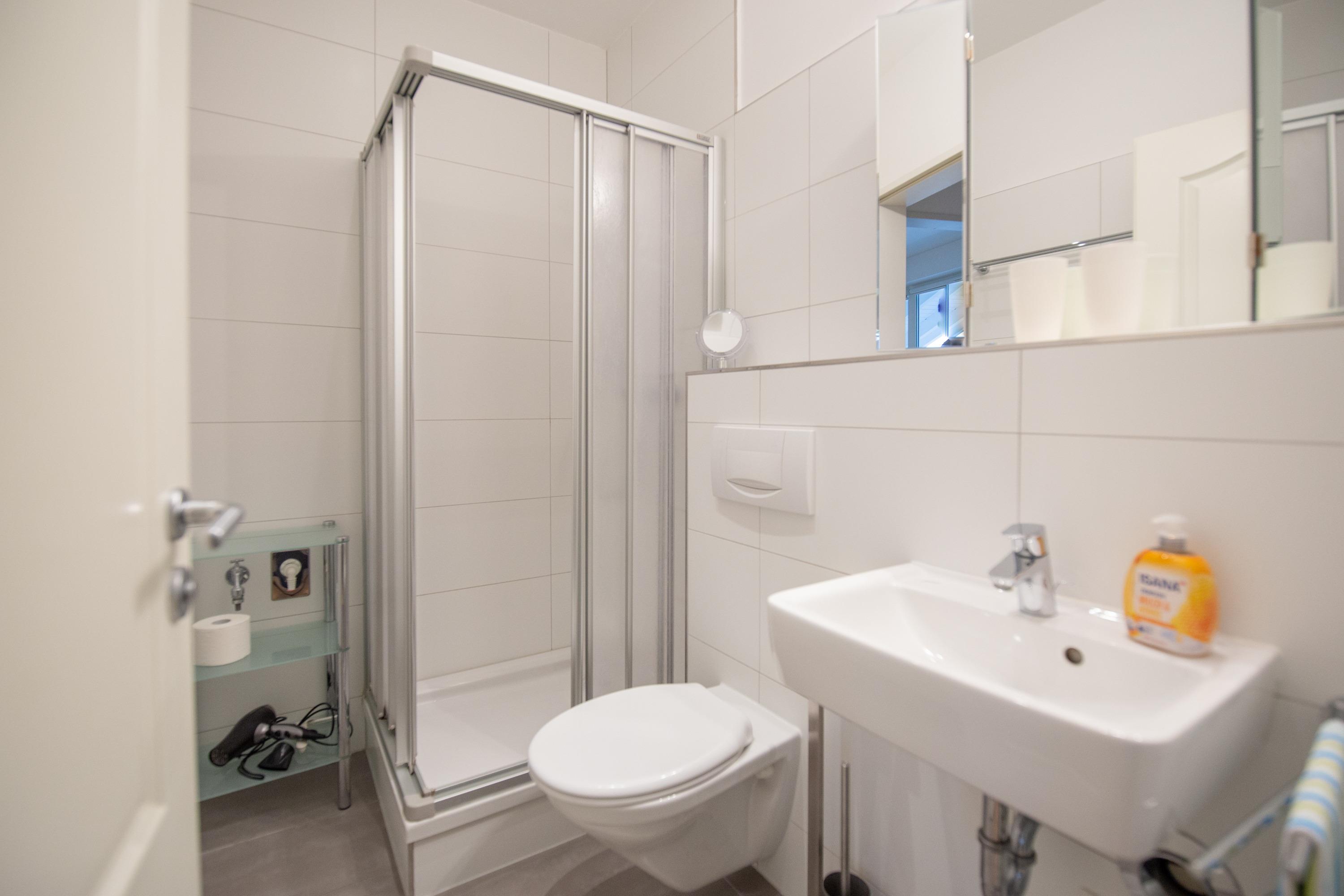 Das hell erleuchtete Badezimmer verfügt über eine Dusche und ein WC.