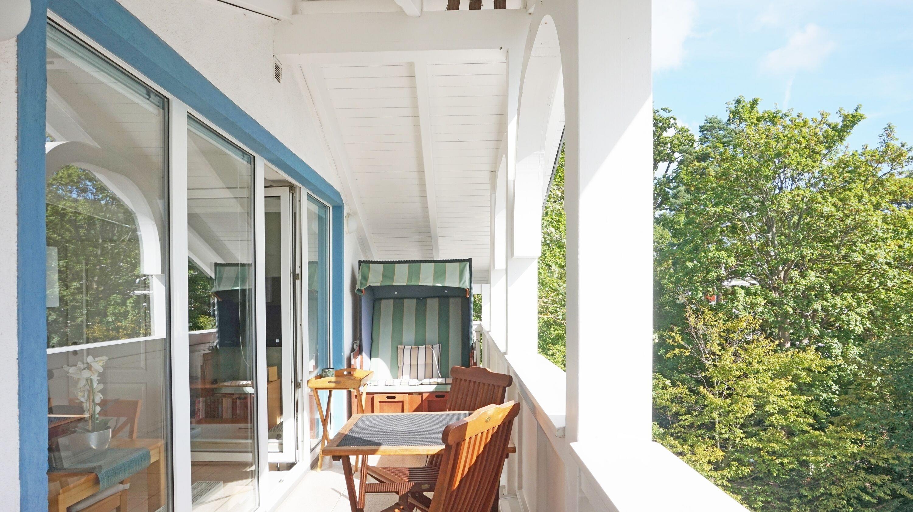 Von hier aus erreichen Sie auch den großen, überdachten Balkon. Komfortable Gartenmöbel mit entsprechenden Auflagen und ein eigener Strandkorb stehen Ihnen beispielsweise für ein sonniges Frühstück zur Verfügung.