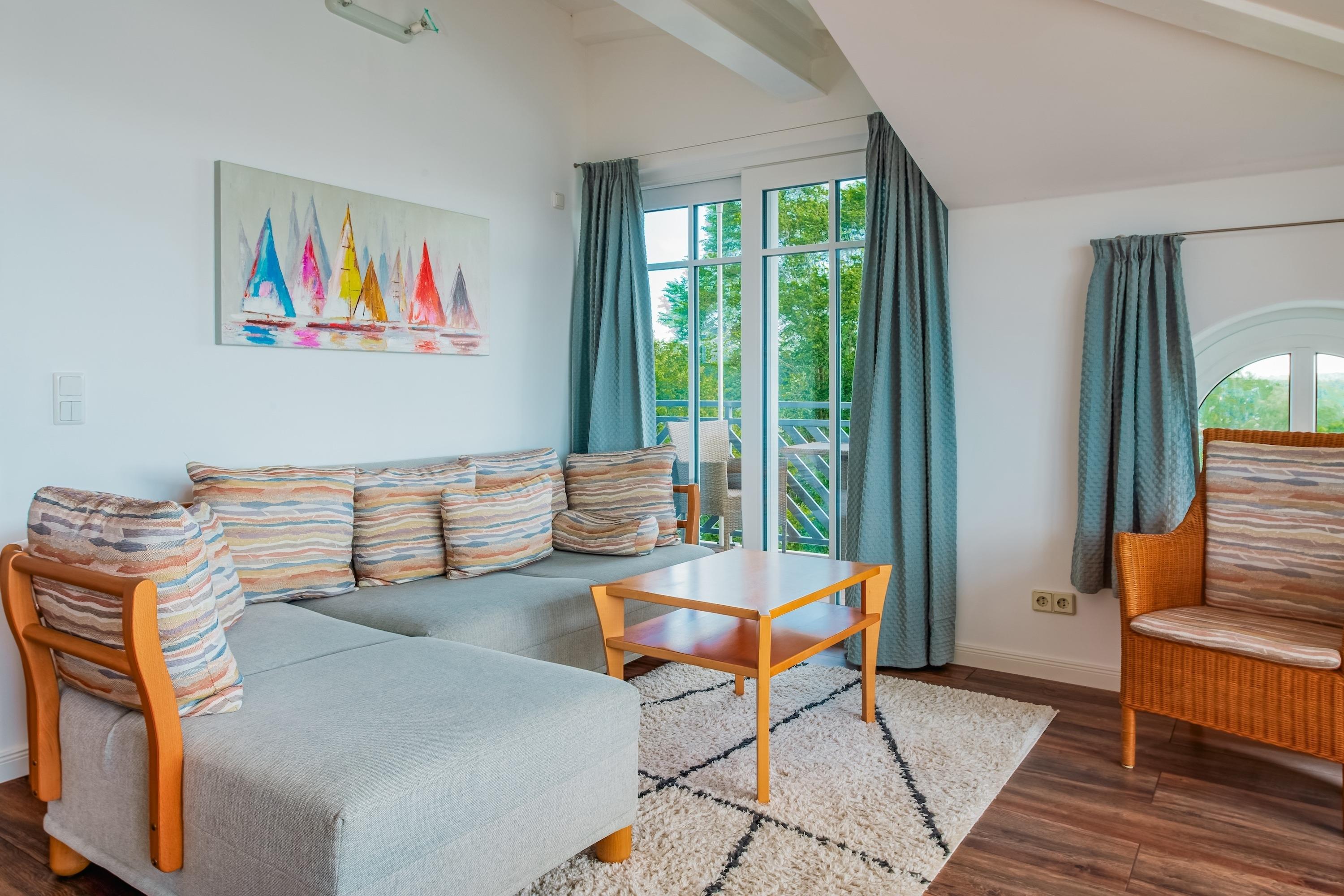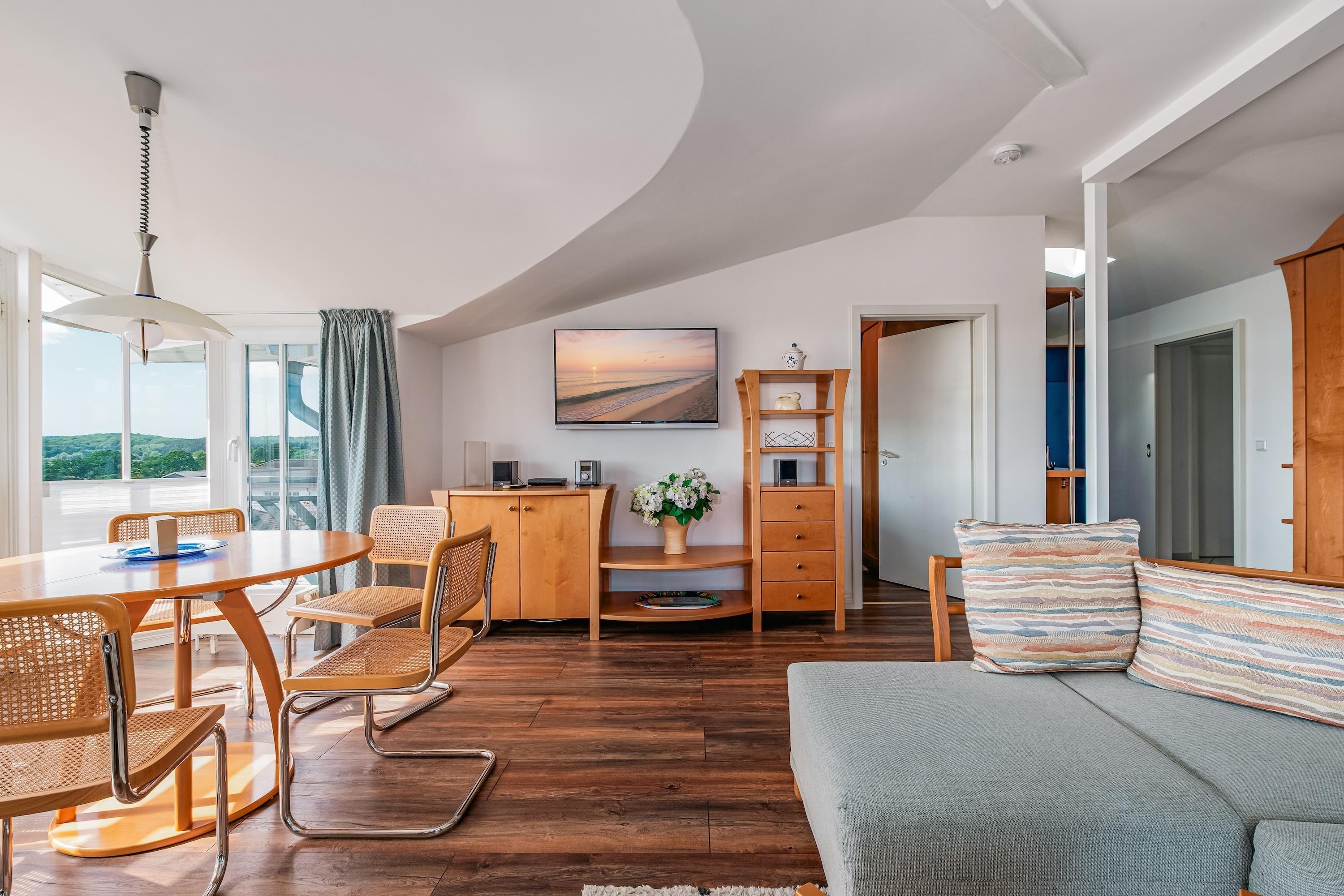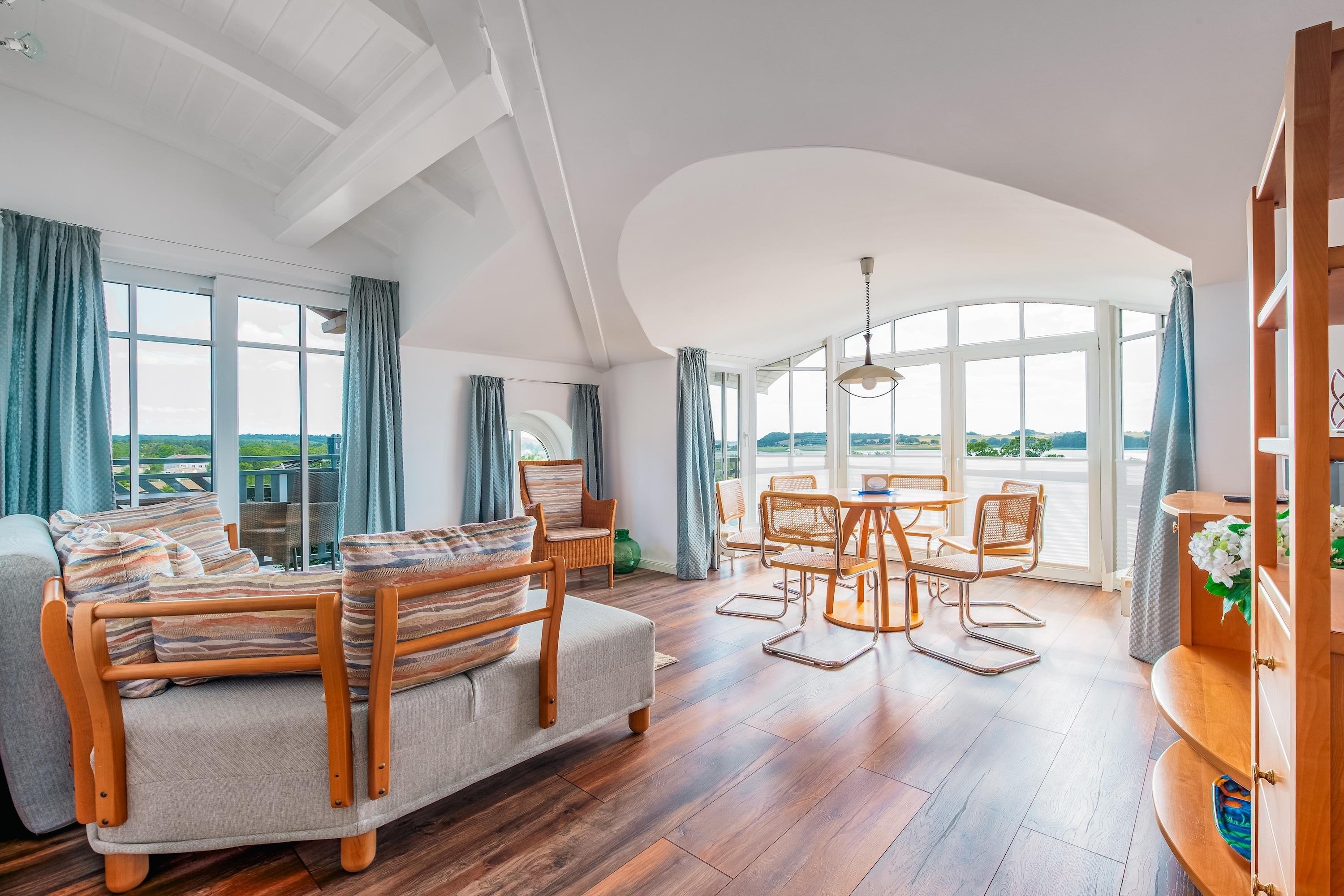 Das Herzstück der Wohnung ist das helle Wohnzimmer mit Blick auf den glitzernden Selliner See – ein Ort zum Entspannen, Genießen und Ankommen. Ob gemeinsames Frühstück am Esstisch oder ein gutes Glas Wein auf dem Sofa – hier beginnt Urlaub bei jedem Atemzug.