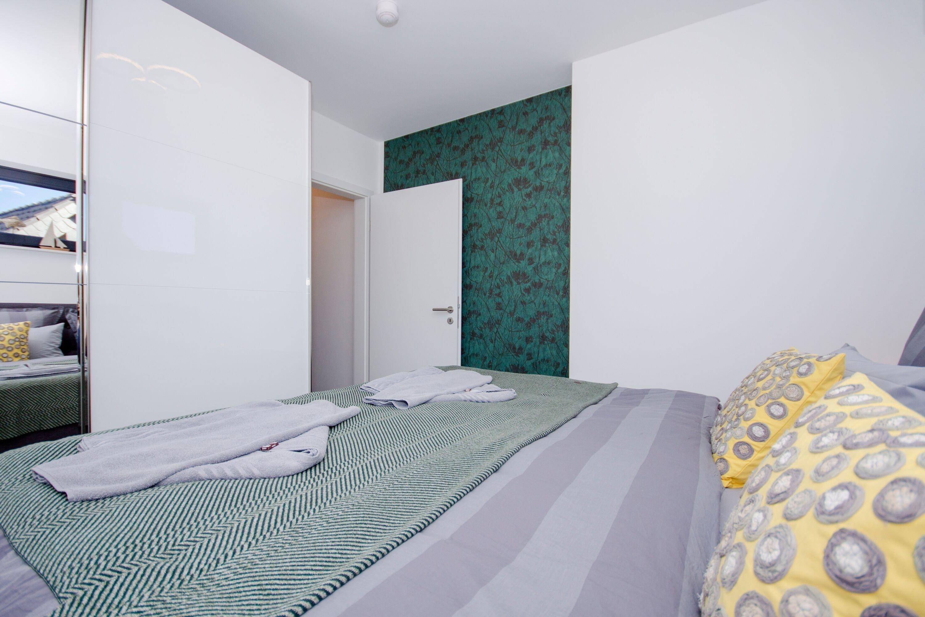 Das eine von zweien Schlafzimmern verfügt über ein großes Boxspringbett mit Komfortschaumtopper und einen großen Kleiderschrank zur Aufbewahrung Ihrer Lieblingskleidungsstücke. In dem zweiten, separaten Schlafzimmer stehen Ihnen ein gemütliches Doppelbett mit Zugang zum großen Balkon zur Verfügung. Auf der 180x200 cm großen Liegefläche finden 2 Personen einen erholsamen Schlaf. In diesem zusätzlichen Zimmer steht außerdem ein Flachbild-TV zur Verfügung. Das WLAN ist in der gesamten Unterkunft kostenfrei.