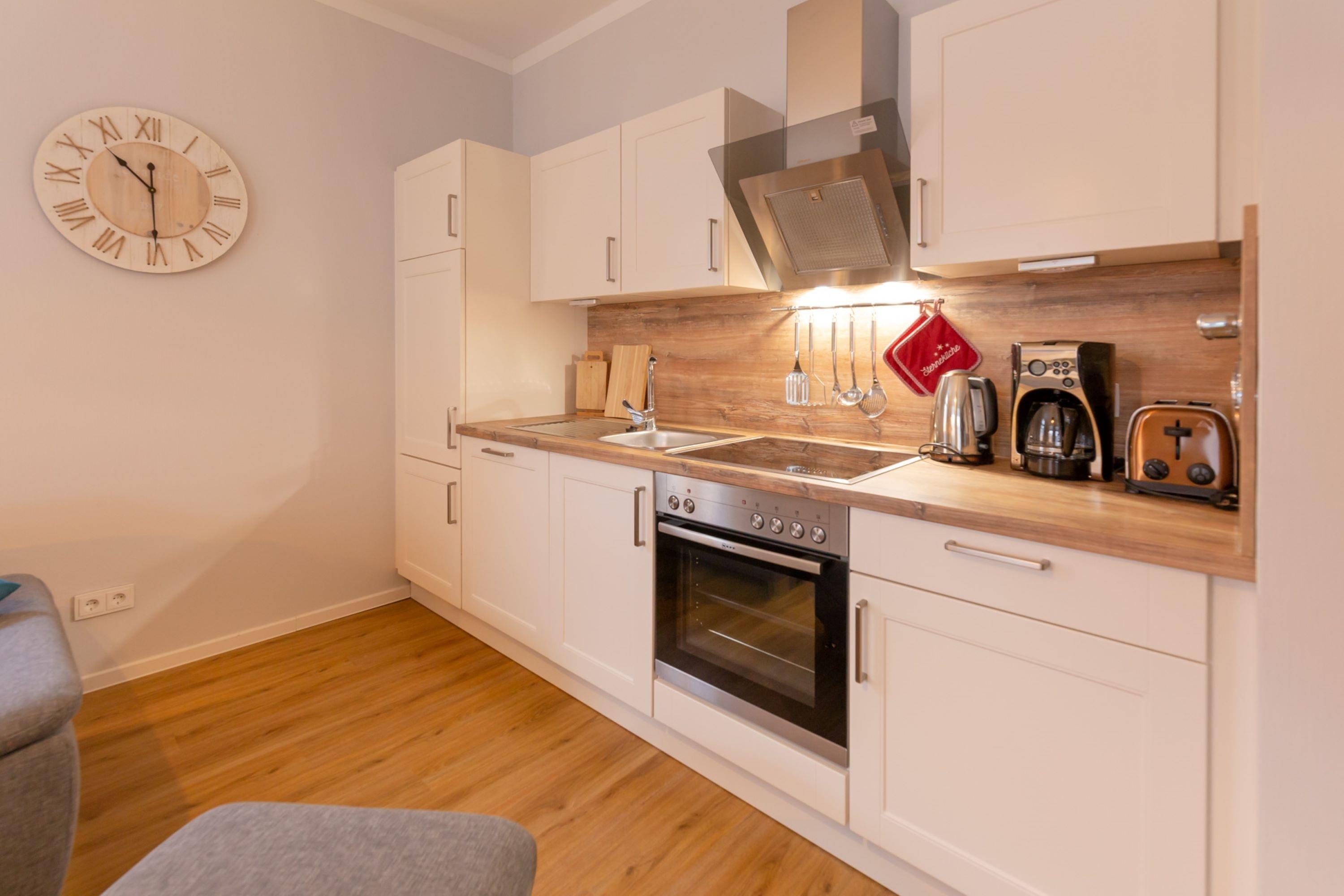 Die offene Küche ist bestens ausgestattet. Neben einem Kühlschrank mit Gefrierfach, einer Spülmaschine, einem Herd und einem Backofen finden Sie hier auch allerlei Küchenkleingeräte.