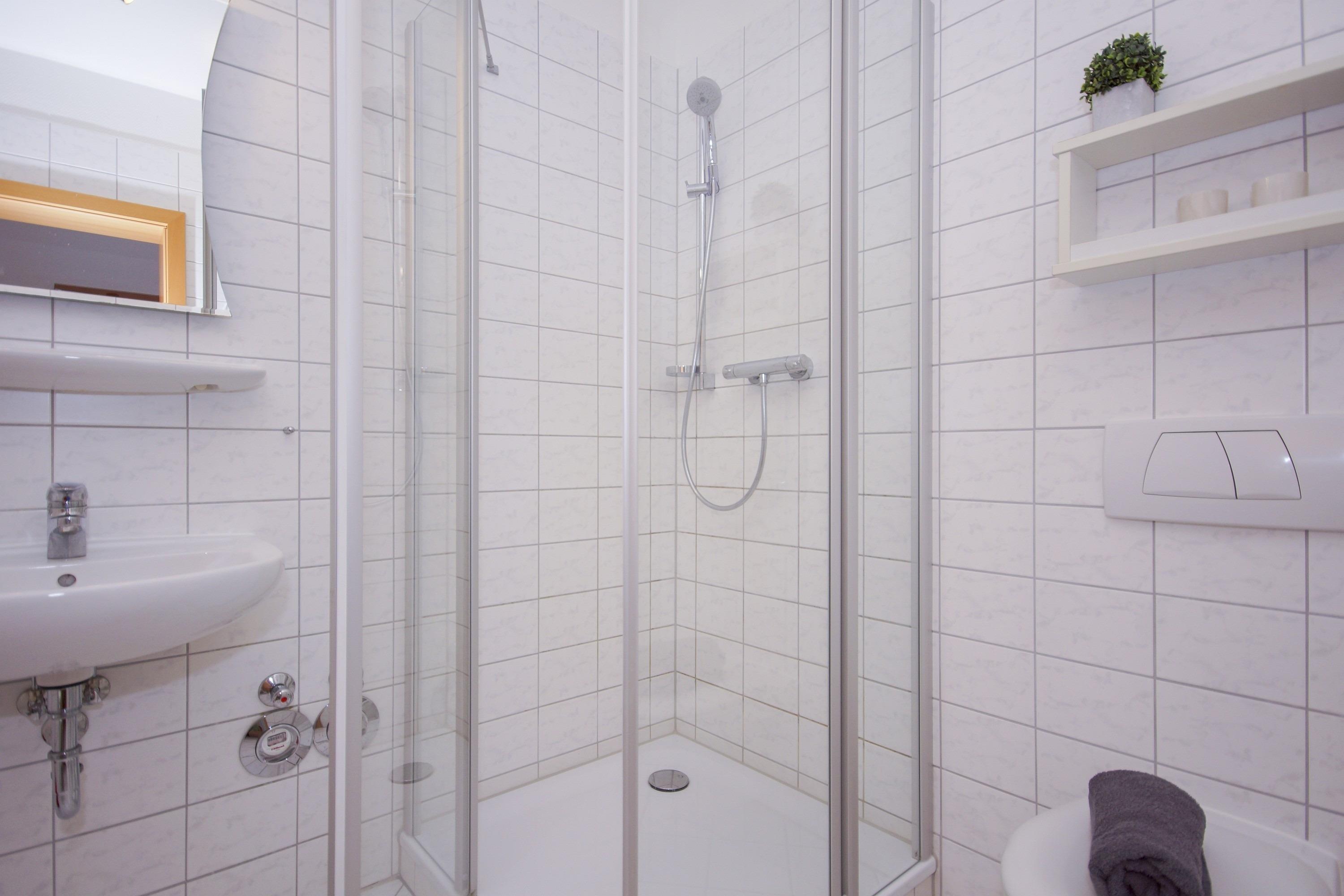 Im Badezimmer befindet sich eine hochwertige Dusche, ein WC und ein Waschbecken mit entsprechendem Spiegel.