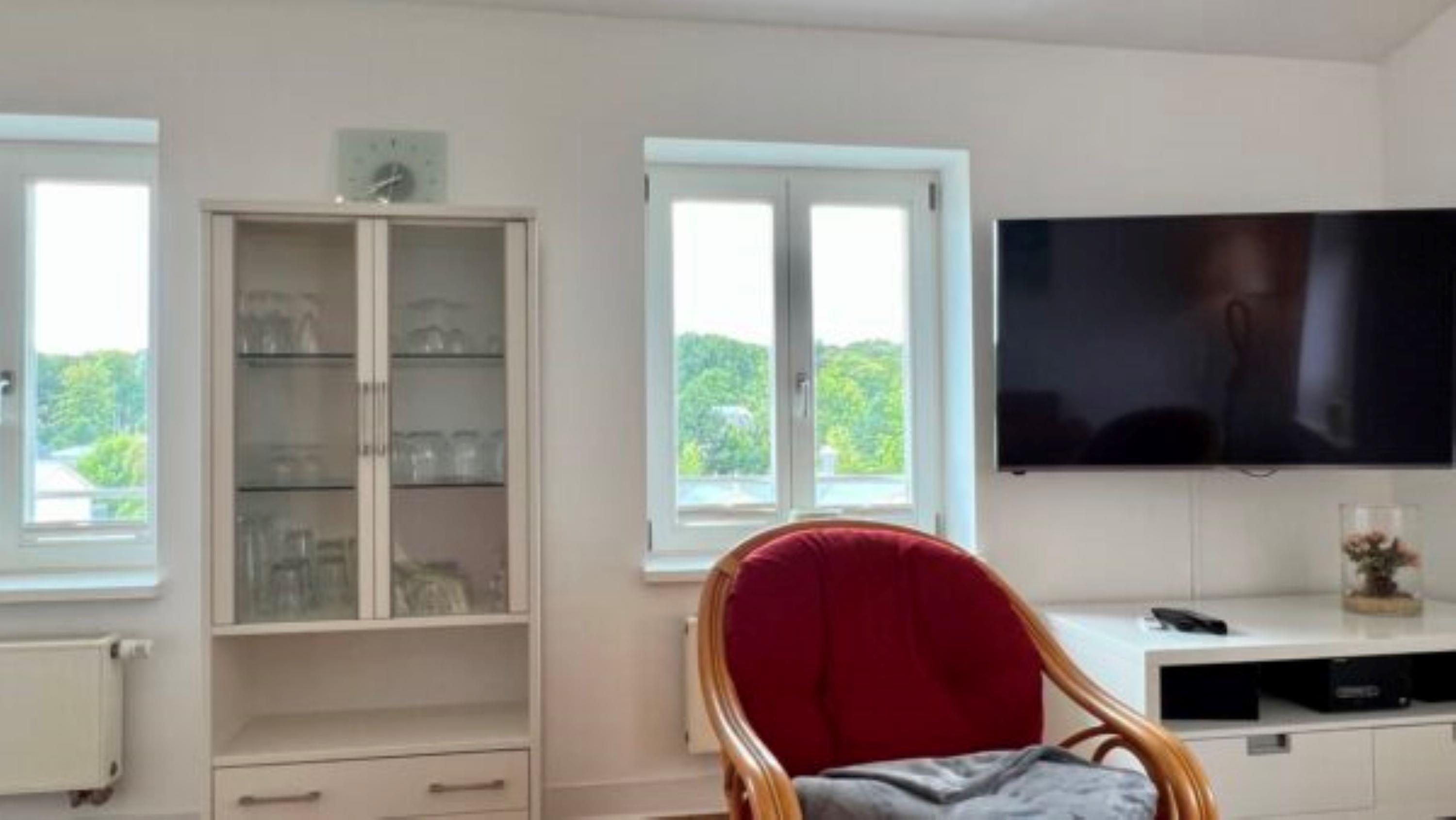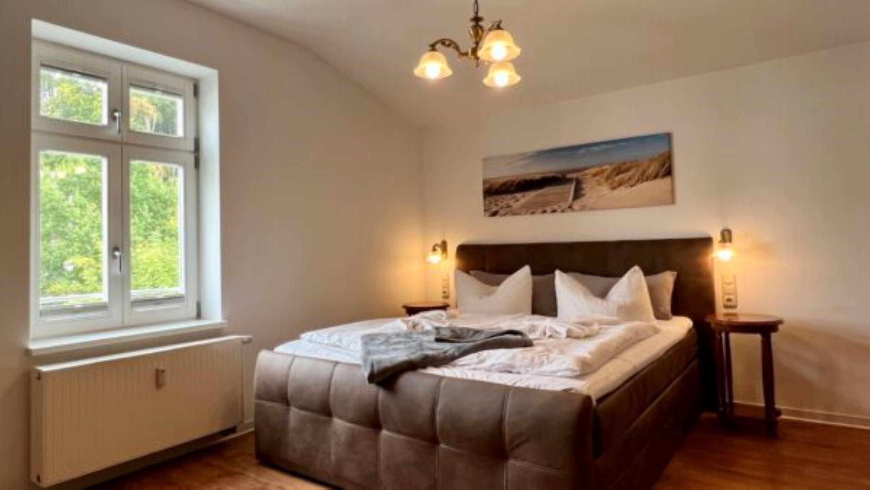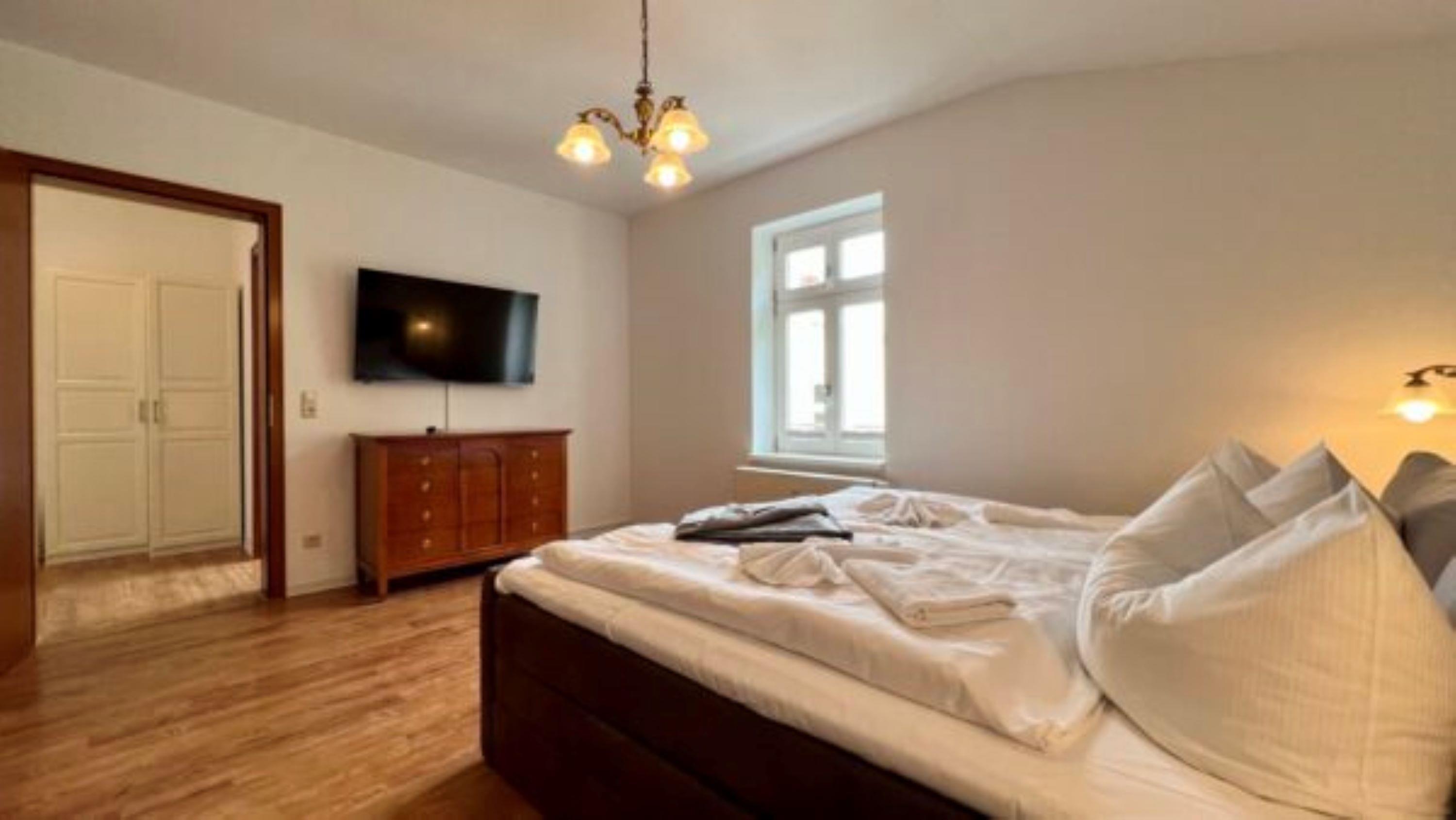 Die helle Wohnung 21 in der Villa Sonneck sorgt durch die drei separaten Schlafbereiche für genügend Privatsphäre im Familienurlaub. Eines der drei Schlafzimmer ist mit einem Boxspringbett (180 x 200 cm), einem TV und einem großzügigen Kleiderschrank ausgestattet, der zweite Schlafbereich bietet ebenso ein Boxspringbett (180 x 200 cm). Im dritten Schlafbereich befindet sich ein Einzelbett (Boxspringbett, 90 x 200cm) und ein kleiner Nachttisch. Ein separater TV ist in 2 der Schlafzimmer vorhanden.