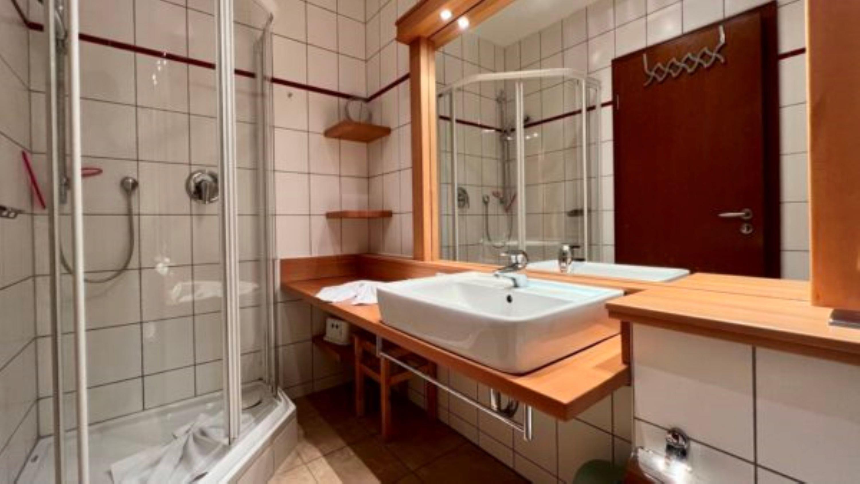 Die beiden Bäder bieten Ihnen jeweils eine Dusche, ein WC und einen Waschtisch mit Waschbecken und Spiegel.