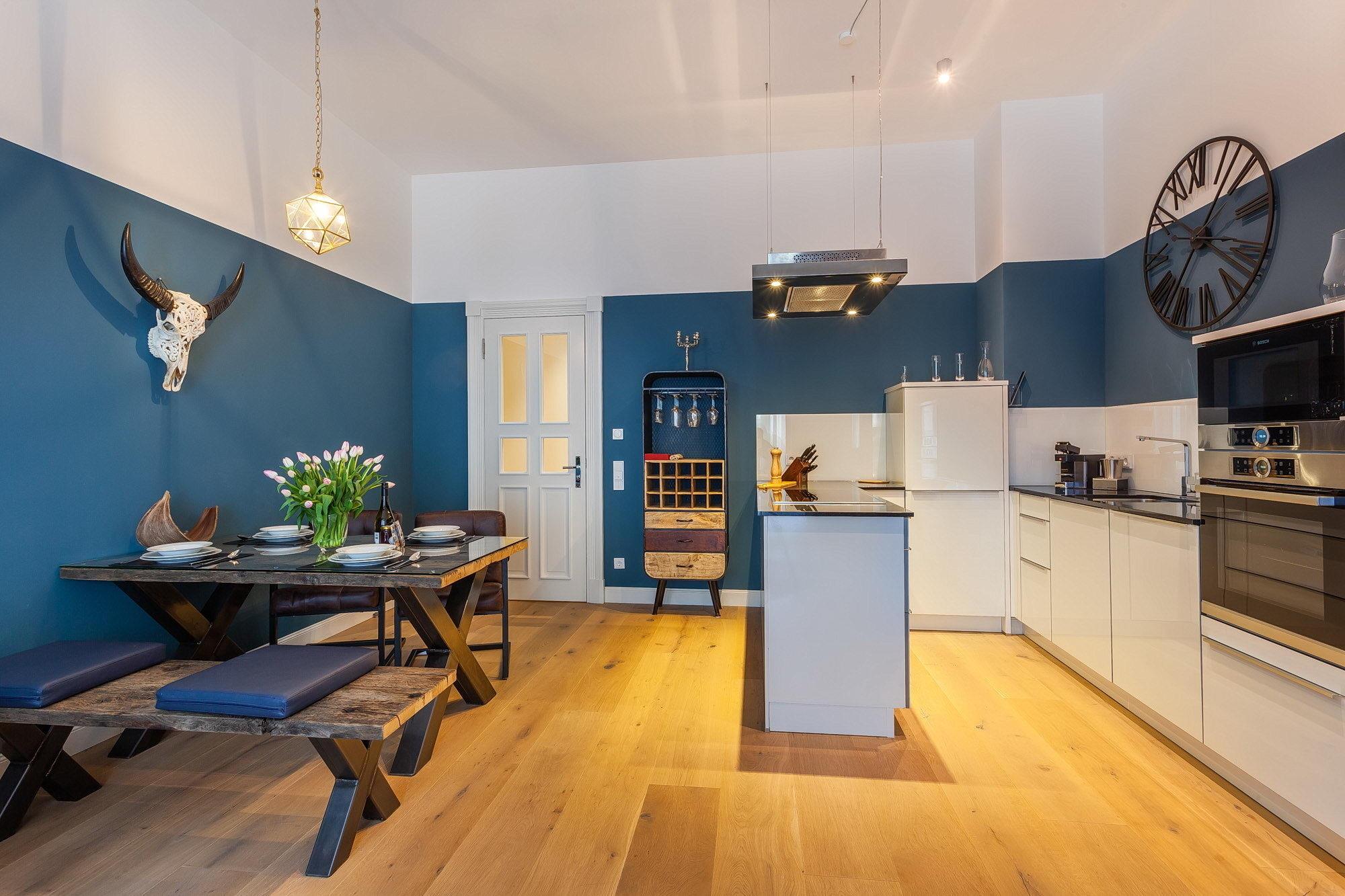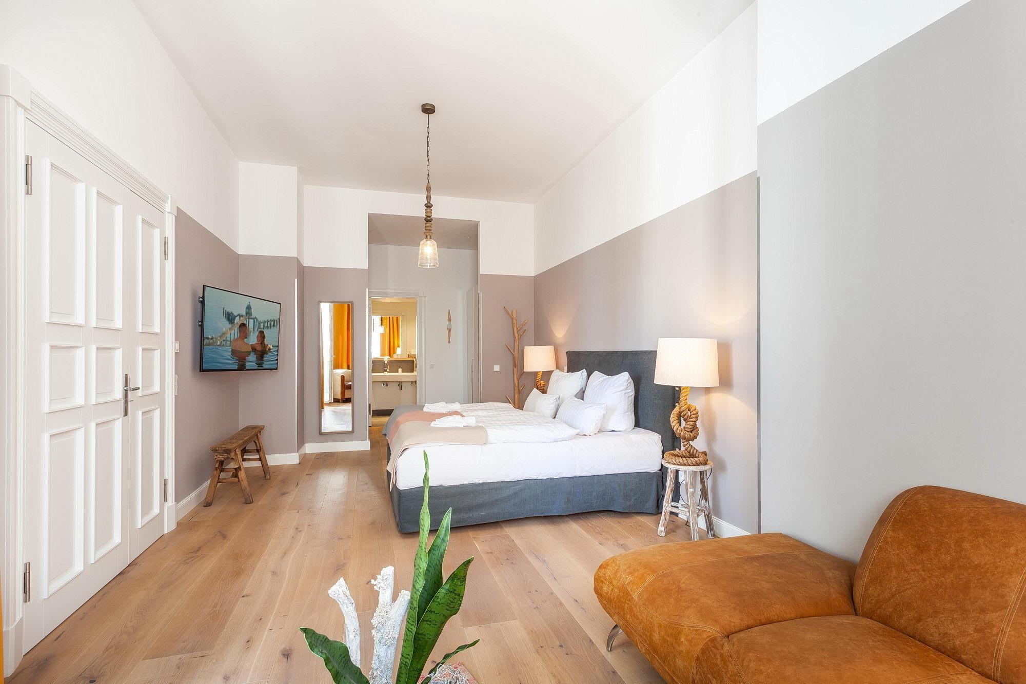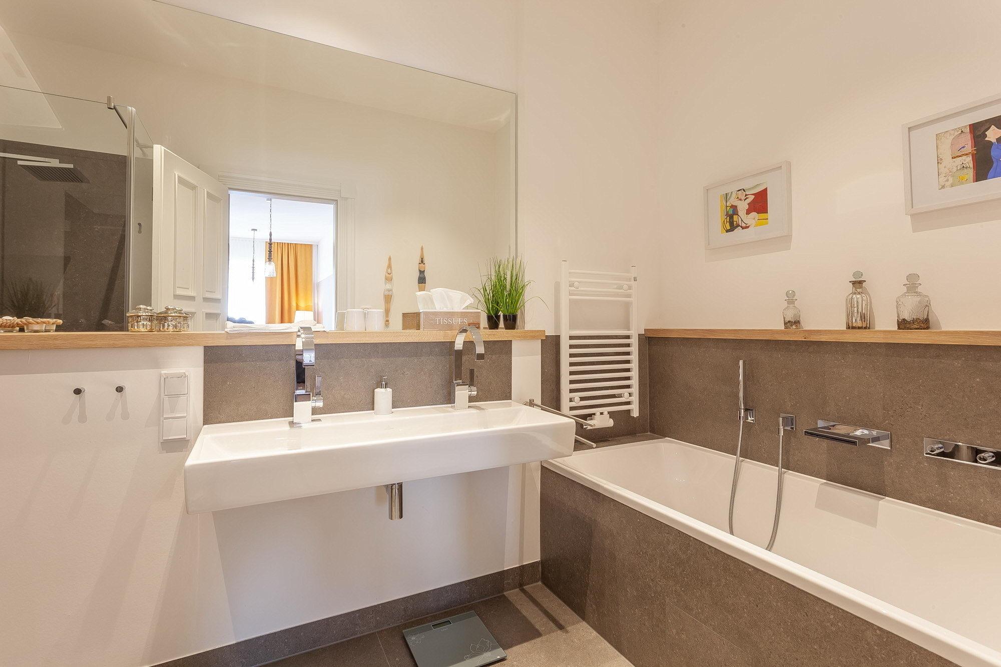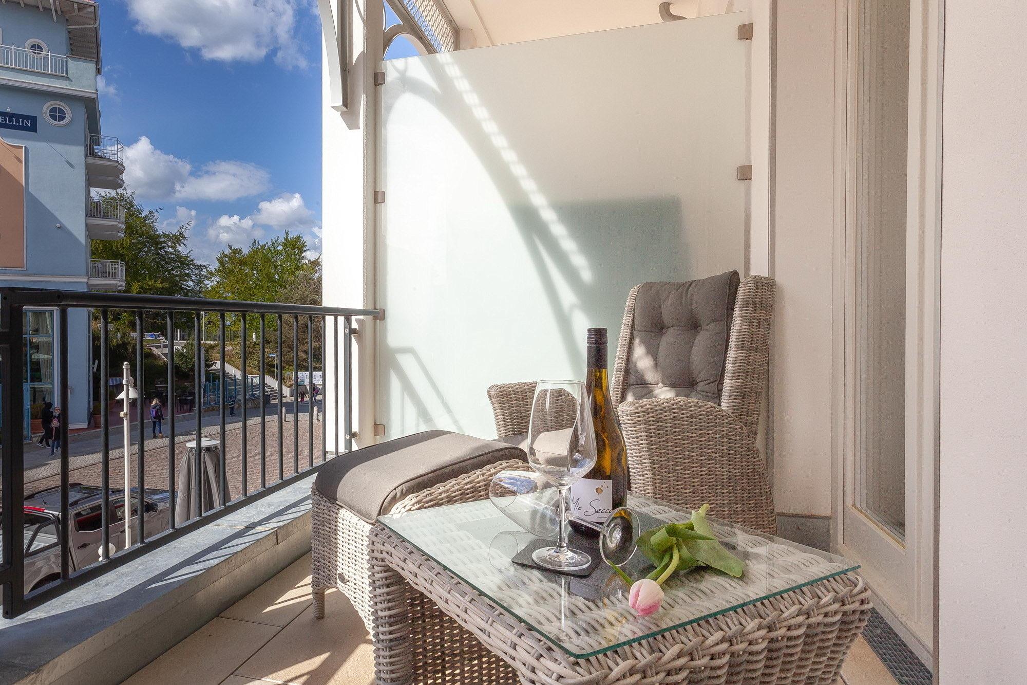 Die Ferienwohnung "[at] HOME" verspricht viel. Es lädt durch seine überdachte Loggia, bequemen Gartenmöbel und einem traumhaften seitlichen Meerblick zum Verweilen ein. Das 90 qm große Appartement überzeugt durch den offenen Wohnbereich und eine hochwertige Einbauküche. Das Schlafzimmer lädt mit seinem 180x200 cm großen Boxspringbett zum Träumen ein. Hier besteht die Möglichkeit einer Aufbettung zur dritten Person durch ein separates Boxbett (90x200 cm). Selbstverständlich lässt das angrenzende Badezimmer mit bodentiefer Dusche und Badewanne keine Wünsche offen.