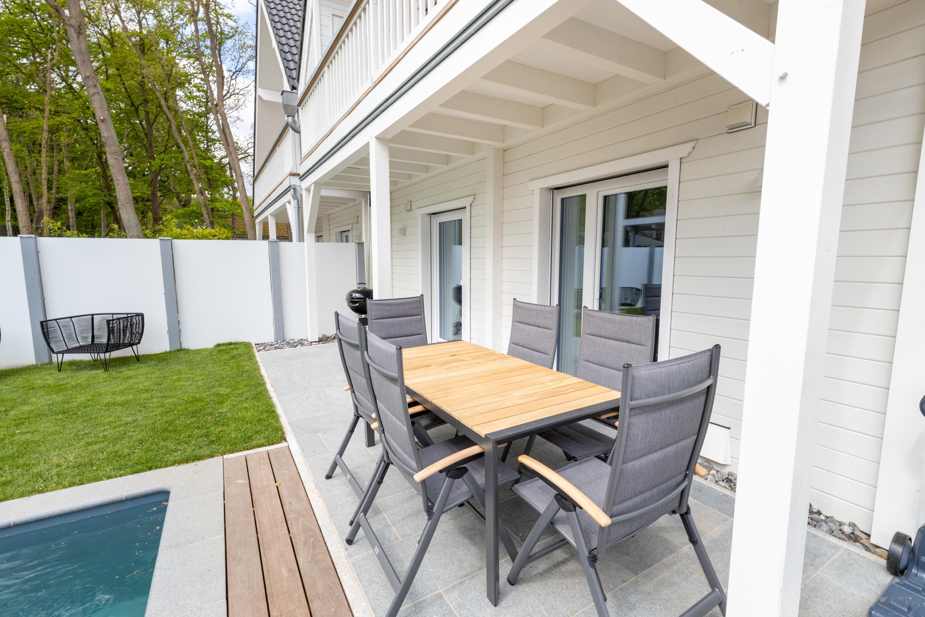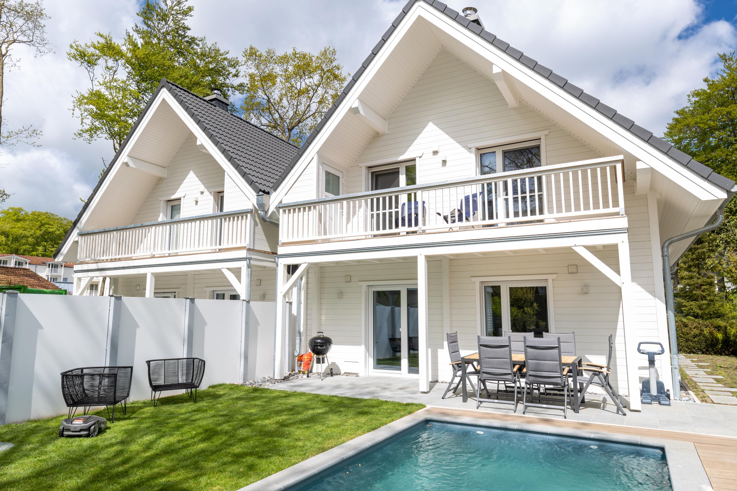 Seit Mai 2022 begrüßt dieses luxuriöse Domizil seine Gäste im Ostseebad Sellin. Über den großzügigen Eingangsbereich betreten Sie dieses rund 150qm große Domizil. Im Erdgeschoss befindet sich 1 Badezimmer, sowie der sehr großzügige und äußerst gemütliche Wohn-, Essbereich des Hauses. Die offene Küche lädt Sie herzlich dazu ein, zusammen mit der ganzen Familie zu kochen. Der tolle Essbereich bietet ausreichend Platz für 6 Personen und einen direkten Zugang zur Terrasse am Pool (mit Sauna). Der Wohnbereich lädt Sie auf dem gemütlichen Lounge-Sofa zum verweilen und zu schönen Stunden am Kamin ein. Im Obergeschoss des Hauses befinden sich die 3 Schlafzimmer und ein großzügiges Badezimmer. Aus 2 der 3 Schlafzimmer haben Sie einen direkten Zugang zum Balkon. Dieses bietet einen hervorragenden Weitblick über das Ostseebad Sellin. Herzstück des Hauses ist der tolle Außenpool mit dazugehöriger Sauna. So ergibt sich eine tolle Relax-, und Wohlfühlmöglichkeit für jede Jahreszeit.