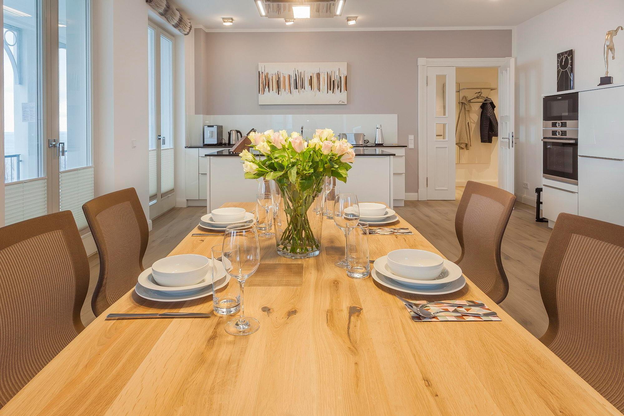 Absoluter Mittelpunkt Ihrer exklusiven Ferienwohnung ist der Wohn- und Essbereich mit seinen großen Fensterfronten, der Meerblick-Loggia inkl. Wintergarten, dem Elektrokamin mit täuschend echt aussehendem Flammenbild und einer Ausstattung, die wohl nichts zu wünschen übrig lässt. Bequeme Couchmöbel laden vor dem riesigen 55 Zoll Fernseher zum Relaxen ein, natürlich mit Funktionen wie Apple TV, Deezer und Netflix. Der elegante Küchenblock von LEICHT ist mit Markengeräten von Bosch, dem passenden Kochgeschirr und edlem Porzellan ausgestattet, so dass Sie sich nach Herzenslust selbst bekochen können, wenn Sie nicht gerade im hauseigenen Restaurant des FIRST oder in einem der netten Lokale in der Nachbarschaft speisen mögen.