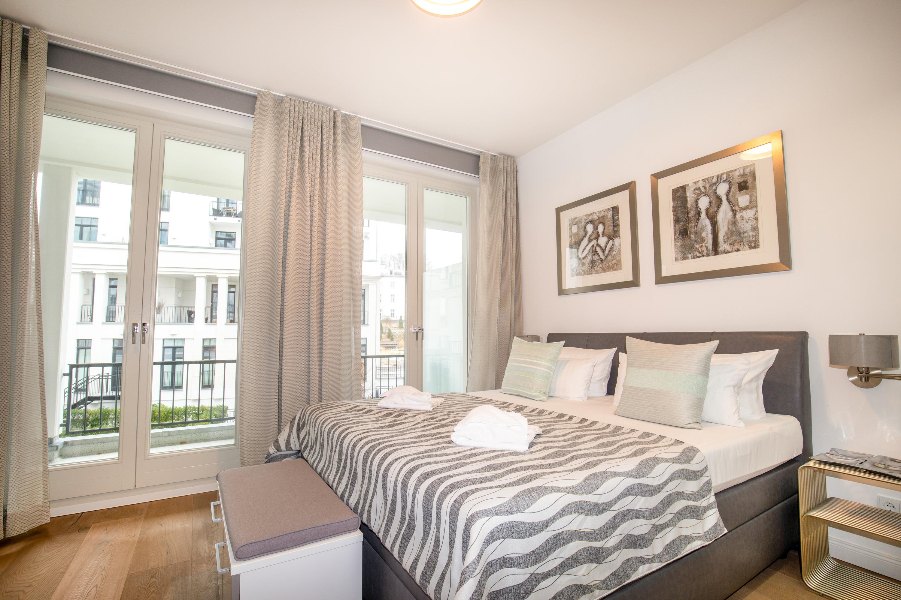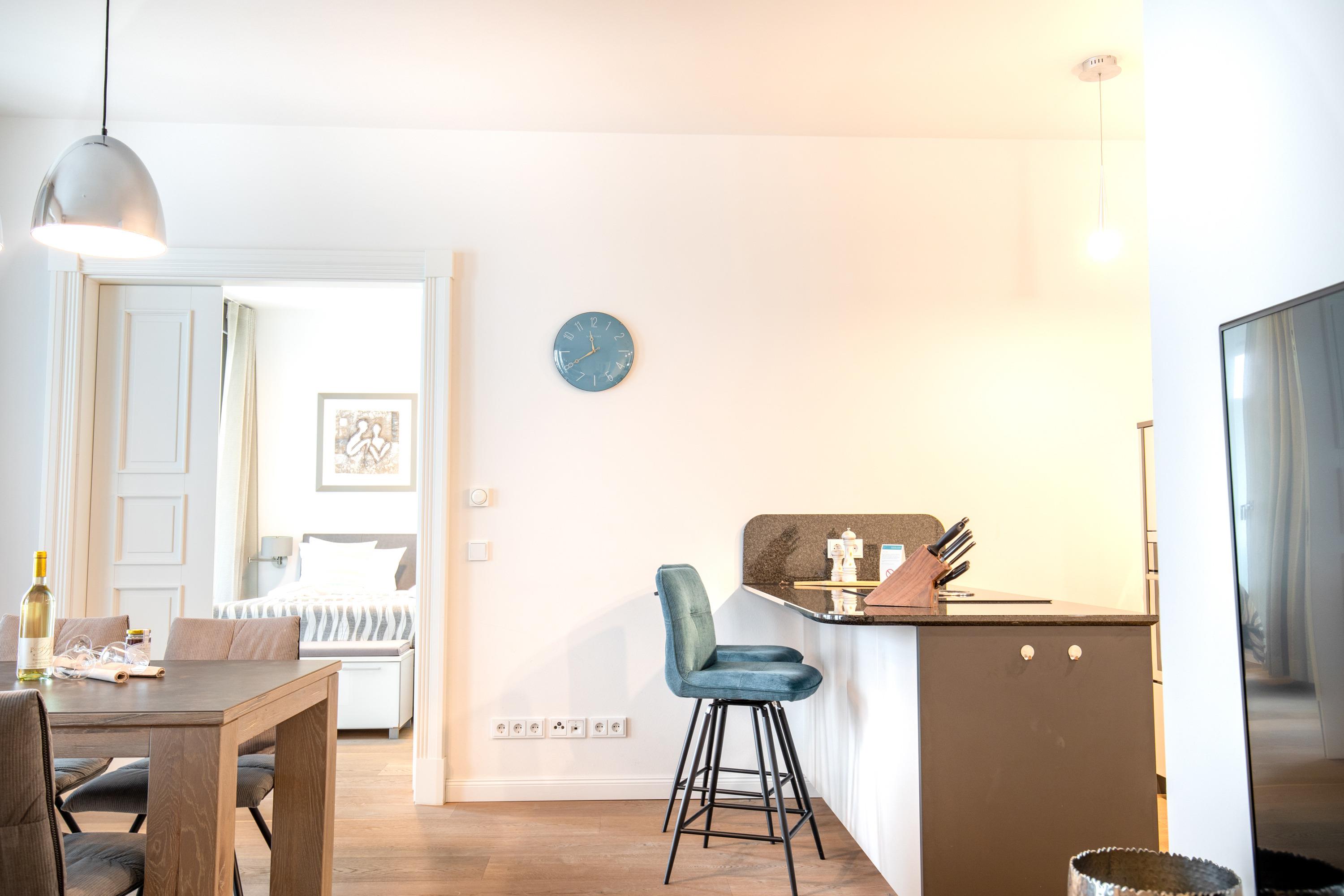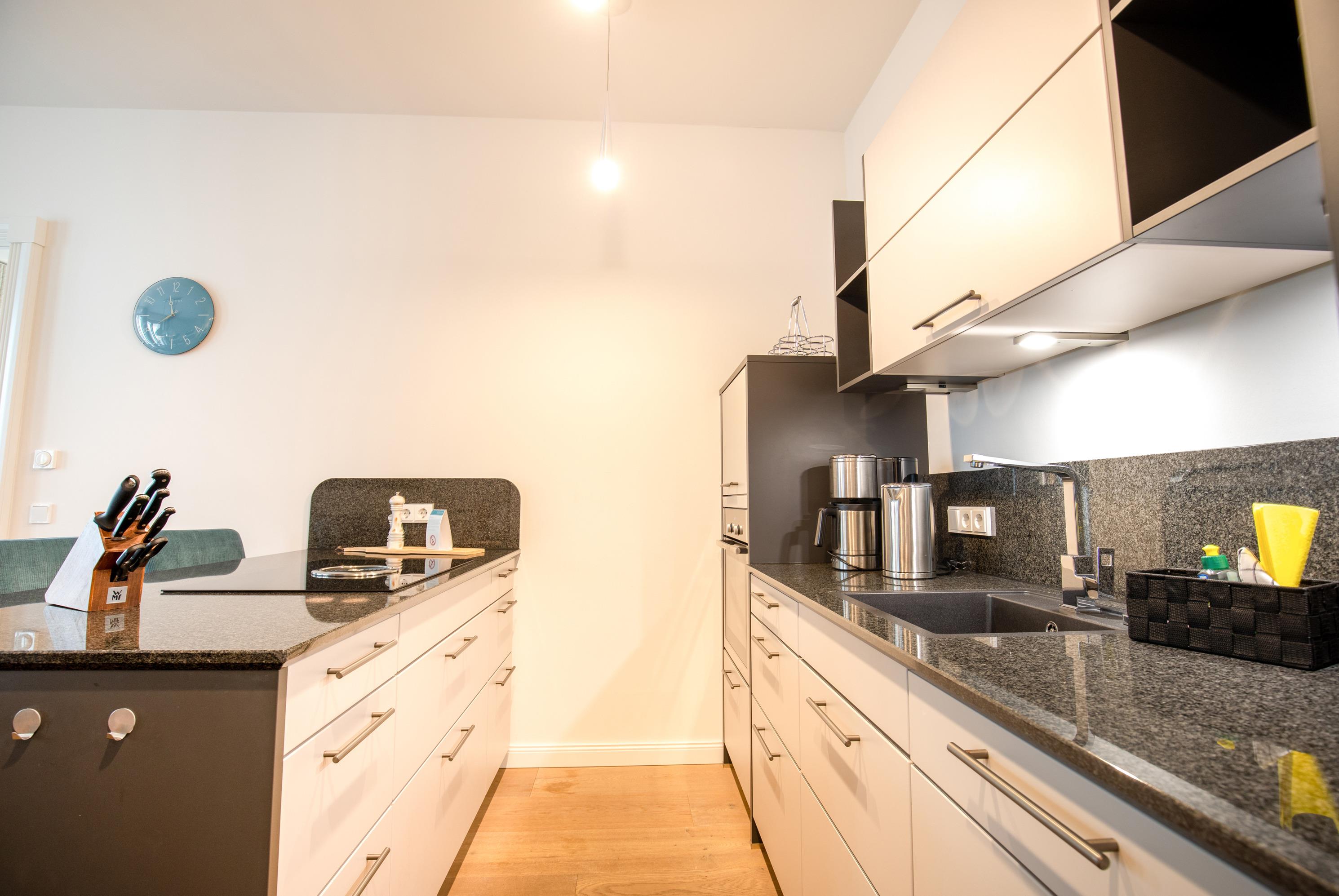 Die Ferienwohnung FIRST Strandperle befindet sich im 2. Stock des Hauses FIRST Sellin und bietet auf rund 75m² [nbsp]Wohnfläche Platz für maximal 4 Personen. Sie verfügt über ein Schlafzimmer und einem Badezimmer, wodurch hier Platz für die ganze Familie vorhanden ist. Zur Ausstattung gehört ein Tiefgaragenstellplatz, um Ihr Auto sicher unterzubringen. Die modern eingerichtete Küchenzeile ist mit einer Spülmaschine ausgestattet und verfügt über ein hochwertiges BORA Kochfeld.