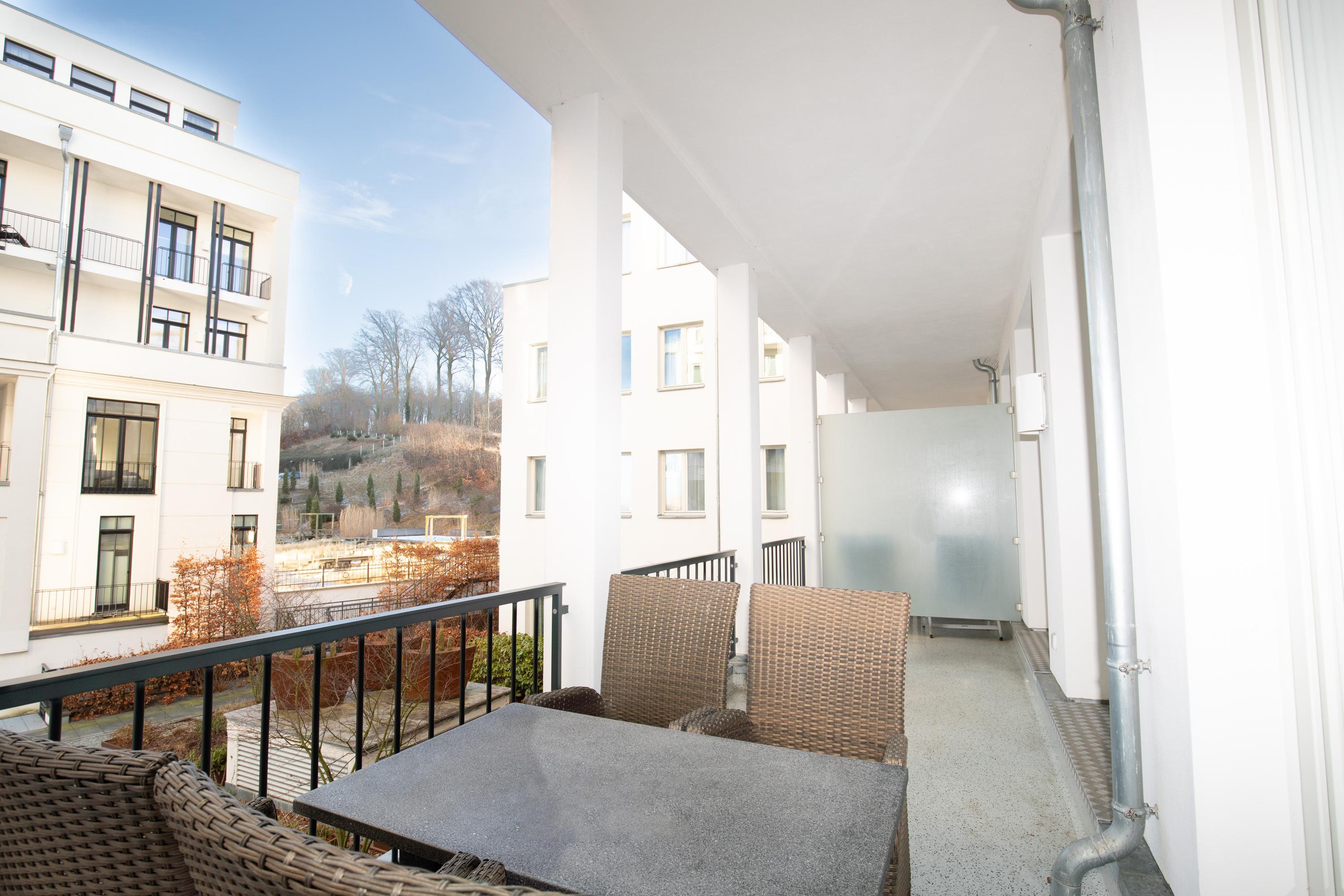 Vom Balkon aus können Sie den herrlichen Blick in den angelegten Garten des Hauses und auf dessen Außenpool genießen. Die frische Seeluft lässt sich in vollen Zügen einatmen. In der Sommersaison können Sie den bereits erwähnten Außenpool nutzen, um sich an heißen Tagen abzukühlen. Dieser steht zusätzlich zum ganzjährig geöffneten Indoor-Infinitypool zur Verfügung.
