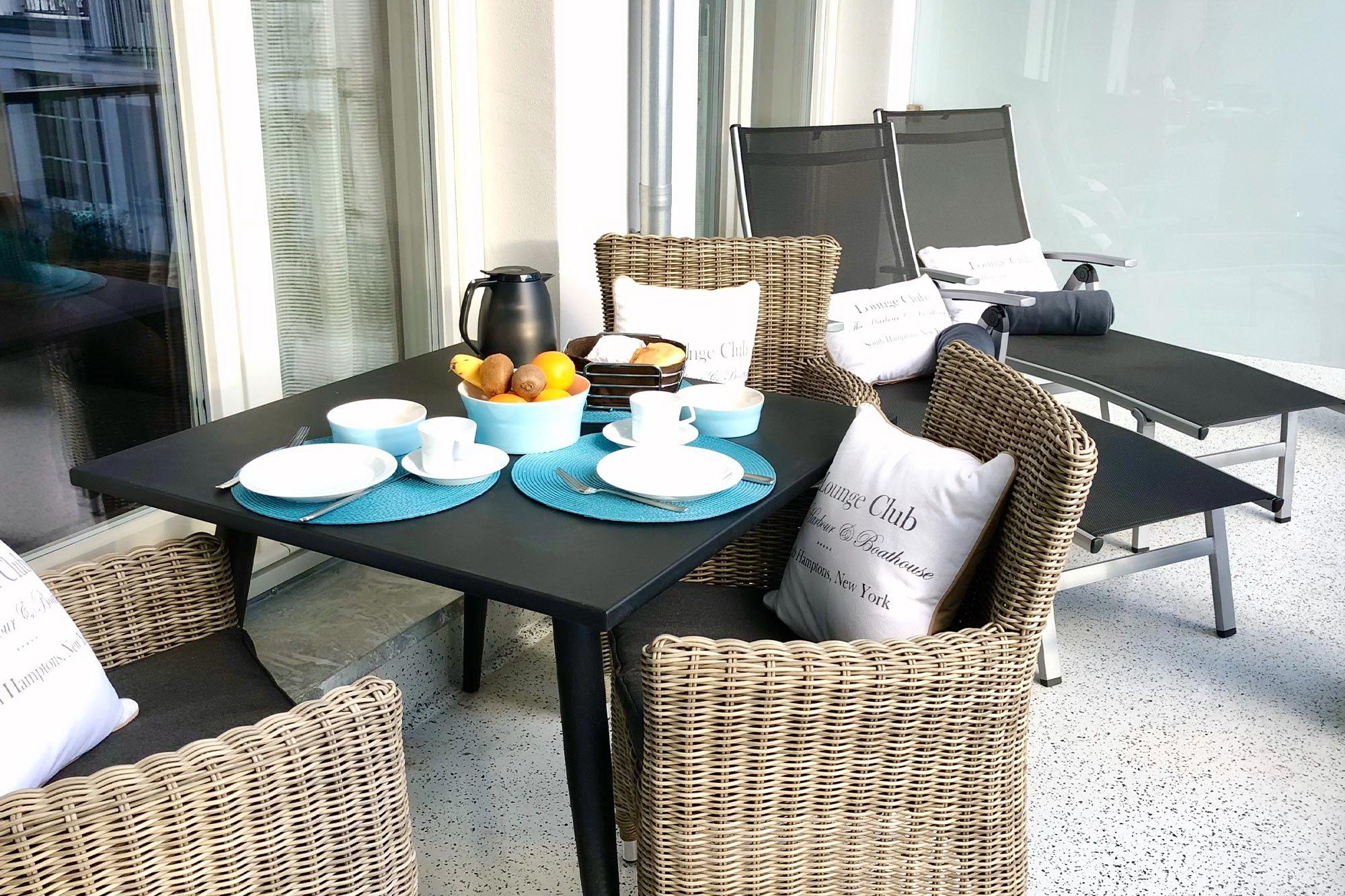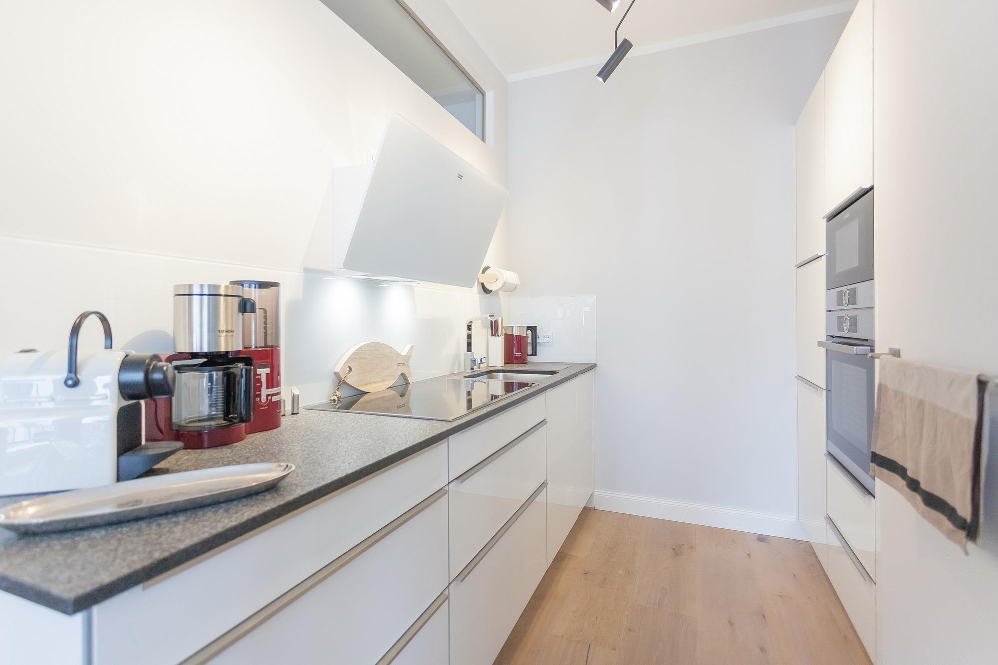 Wohin man auch schaut, überall spürt und sieht man den Wert der verwendeten baulichen Materialien, die Eleganz des Mobiliars und den erlesenen Geschmack, den die Wohnungseigentümer bei der Auswahl der Dekorationen und Accessoires bewiesen haben. Das Wohnzimmer besticht mit einem großformatigen Curved-Smart-TV, einer Bose Sound Touch-Anlage mit W-LAN und Bluetooth zum Streamen Ihrer Lieblingsmusik, einer PS4-Playstation, einem gemütlichen Ecksofa mit Schlaffunktion und Extra-Topper sowie einer Tischgruppe mit bequemen Polster-Stühlen. Die geschickt integrierte Küche mit ihrer Arbeitsplatte aus edlem Naturstein verfügt über einen Induktionsherd, einen Backofen in Augenhöhe, Geschirrspüler, Mikrowelle, Gefrierfach, eine Kaffee- und eine Espresso-Maschine, dazu einen Toaster, Wasser- und Eierkocher sowie Kochgeschirr und -Utensilien von WMF.
