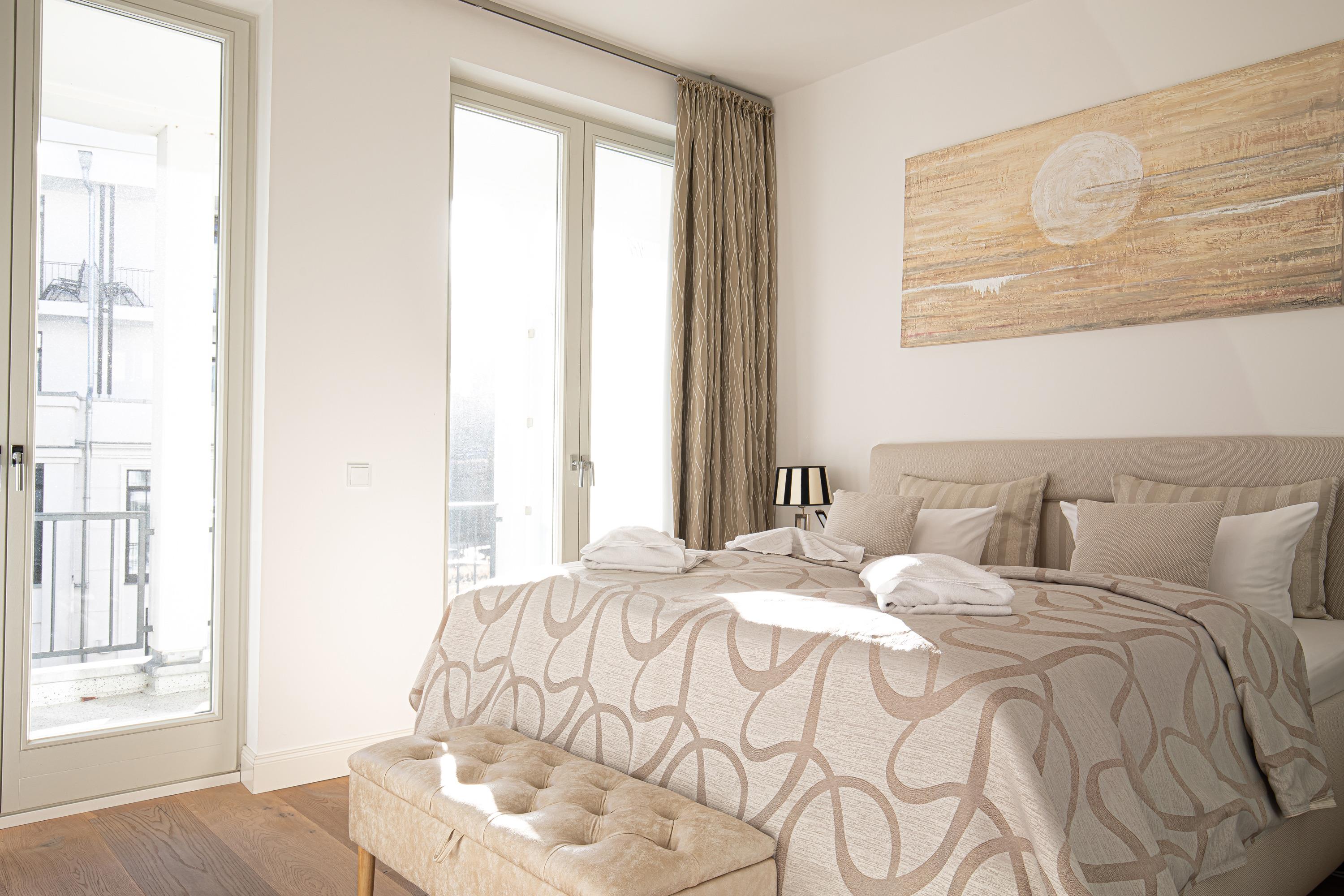 Die Ferienwohnung FIRST - Wolke 7 befindet sich im 3. Stock des Hauses FIRST Sellin und bietet auf rund 75m² [nbsp]Wohnfläche Platz für maximal 4 Personen. Sie verfügt über ein Schlafzimmer und 2 Badezimmer (Gäste-WC), wodurch hier Platz für die ganze Familie vorhanden ist. Zur Ausstattung gehört ein Tiefgaragenstellplatz, um Ihr Auto sicher unterzubringen. Die modern eingerichtete Küchenzeile ist mit einer Spülmaschine ausgestattet und verfügt über eine hochwertige Ausstattung.