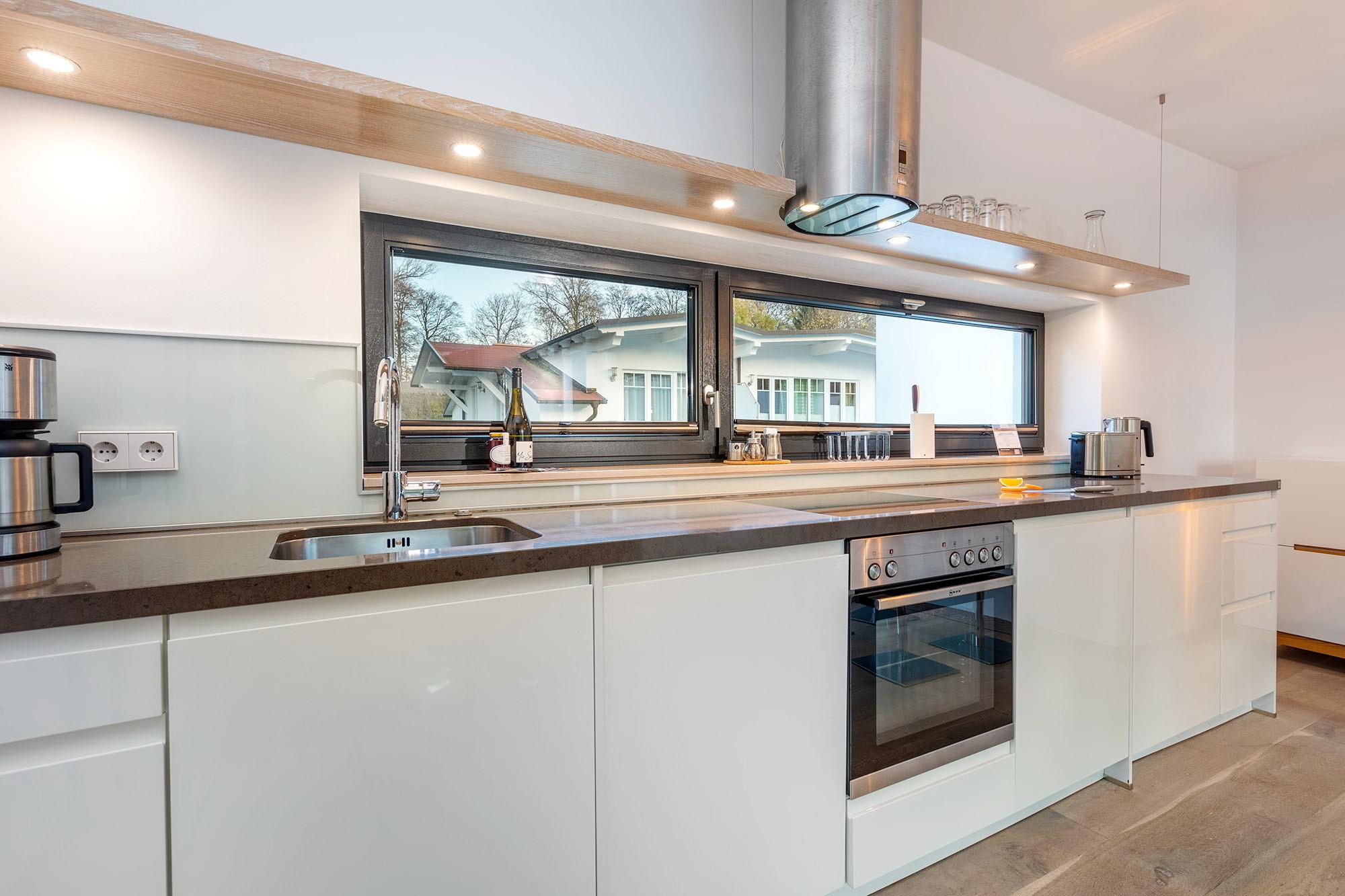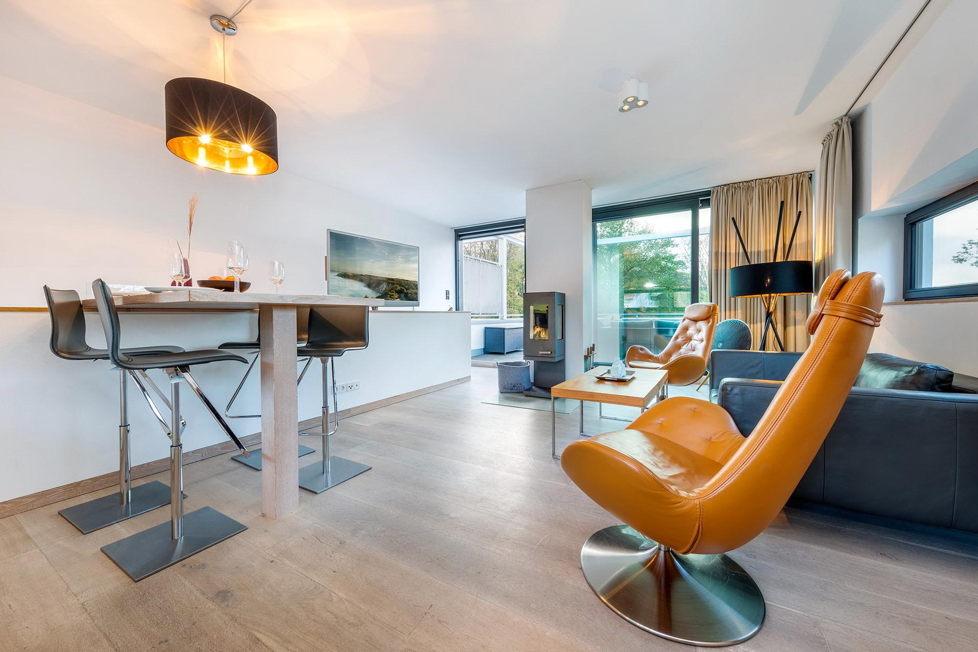 Das 3-Raum-Penthouse Wellenreiter erstreckt sich über das erste Obergeschoss und das Dachgeschoss der Strandvilla und erfüllt auf 93 Quadratmetern Wohnfläche alle Urlaubsträume von bis zu vier Personen. Hochwertige Leder- und Eichenmöbel, pointierte Dekorationen und modernste Unterhaltungselektronik zaubern ein Ambiente der Spitzenklasse. Eines der vielen Highlights ist dabei ganz sicher der geräumige Wohn- und Essbereich mit seiner integrierten Designerküche, deren exklusive Ausstattung Funktionalität und Komfort in vollkommener Weise verbindet.