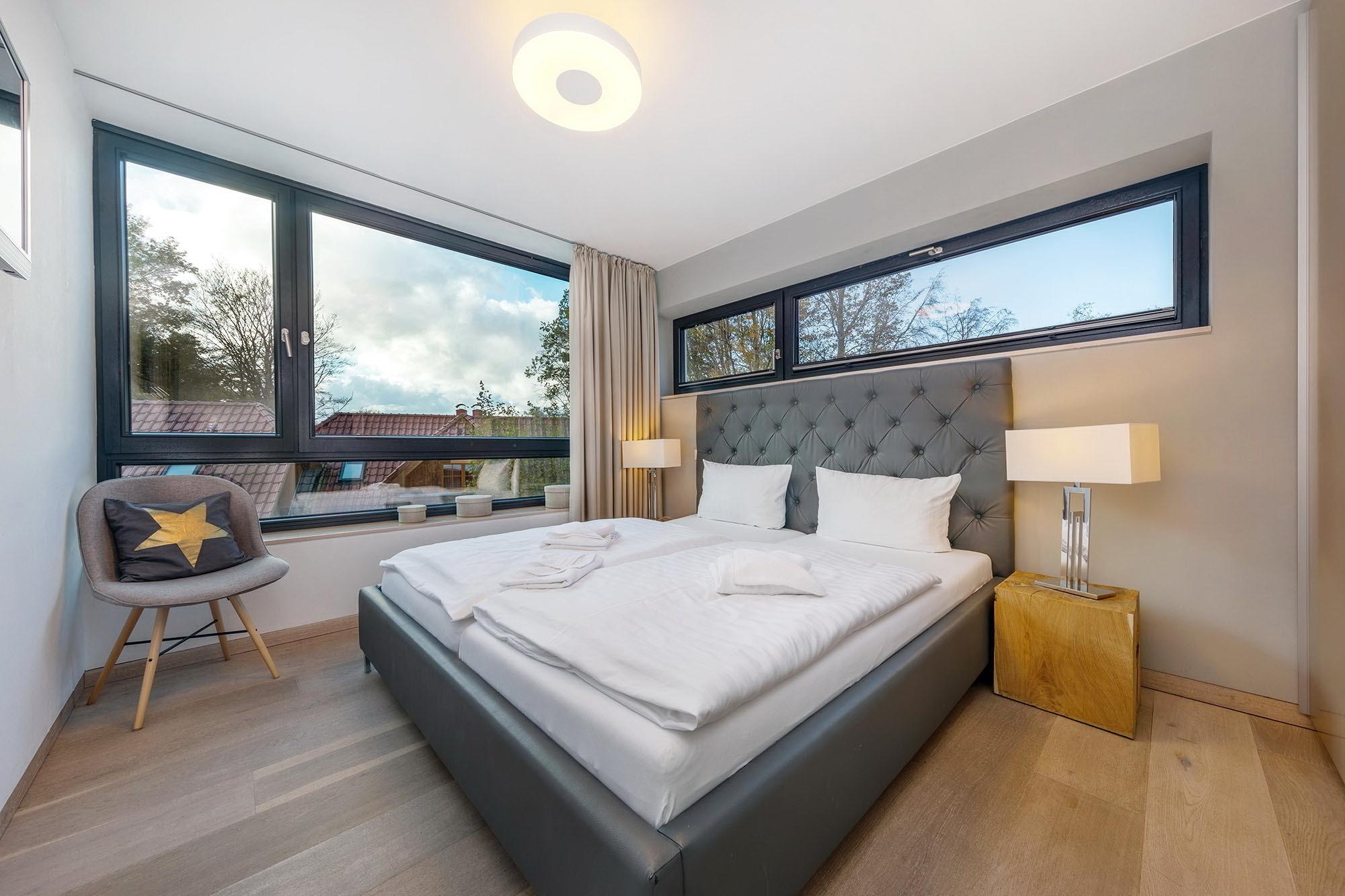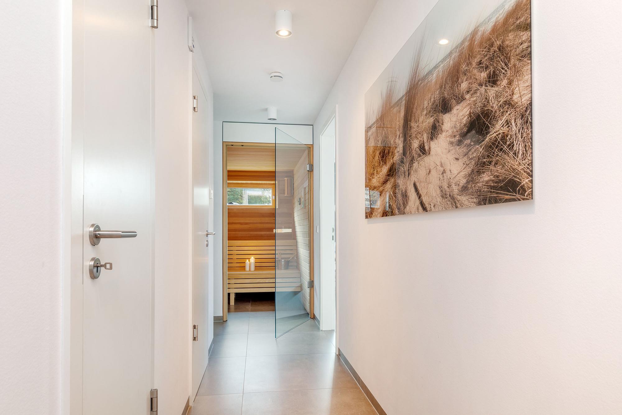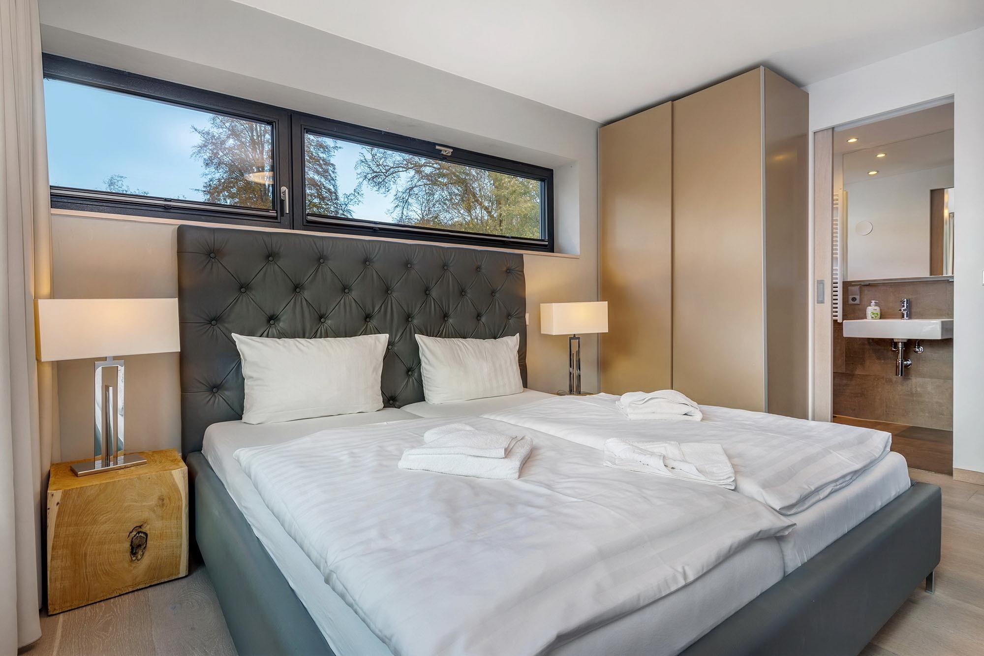 Auf der großen, nach Südwesten ausgerichteten Dachterrasse laden unter dem vollautomatischen Sonnensegel bequeme Sitzmöbel und ein BBQ-Grill zum gemütlichen Verweilen ein. Darunter warten im ersten Obergeschoss zwei elegant eingerichtete Schlafzimmer und exklusive Ensuite-Bäder darauf, von Ihnen entdeckt zu werden. Hier befindet sich auch die finnische Farblicht-Sauna, die Sie jederzeit für Ihr individuelles Verwöhnprogramm nutzen können. Die im gesamten Appartement vorhandene Fußbodenheizung sorgt für ein angenehmes Raumklima und unterstützt Ihre Entspannung zusätzlich.