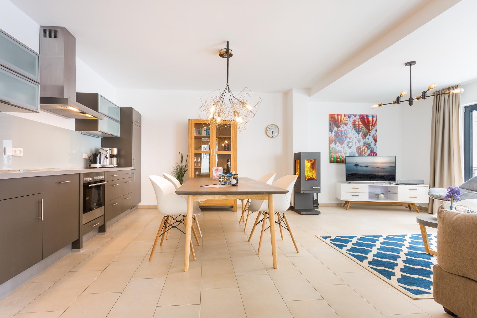 Im geräumigen Wohn- und Esszimmer trifft man sich gern zum gemeinsamen Kochen, Fernsehen oder Spielen. Die bequemen Möbel, der moderne 32“ Kabel-Fernseher, die Mini-Stereoanlage, kostenfreies W-LAN und die hochwertig ausgestattete Markenküche machen es leicht, sich hier wohl zu fühlen.