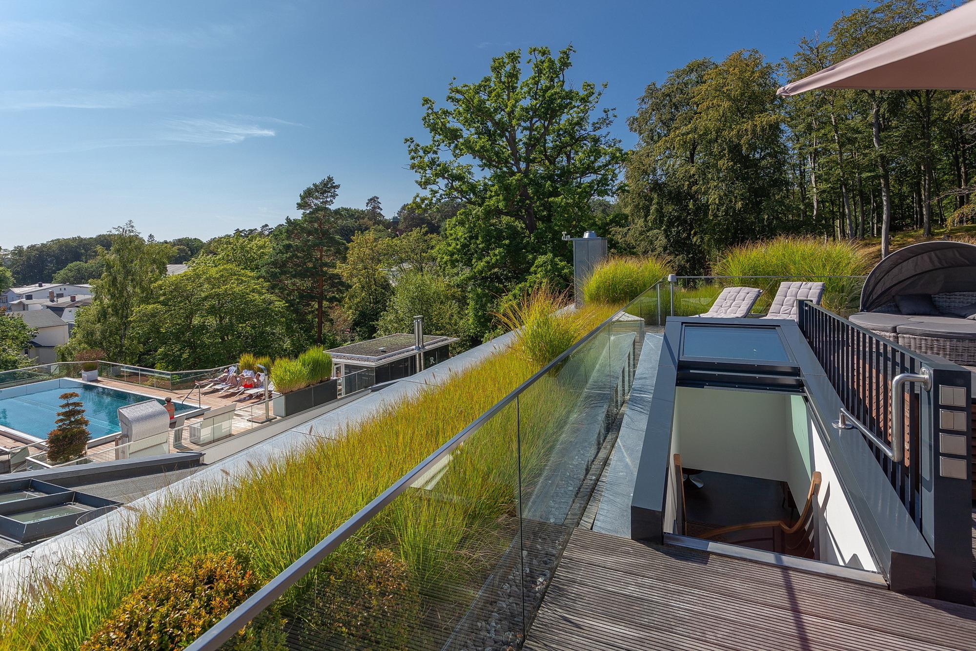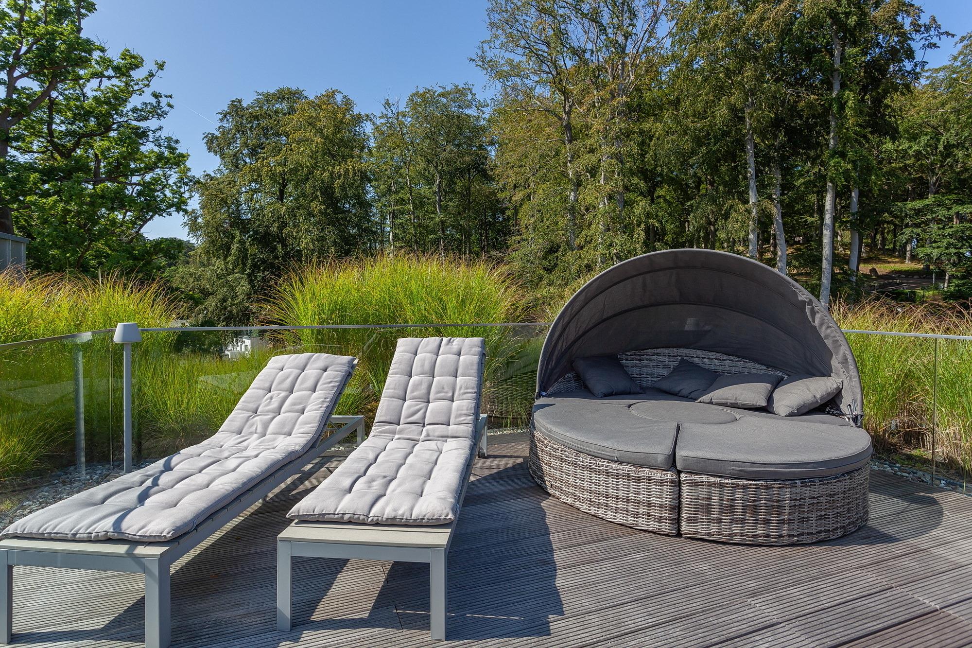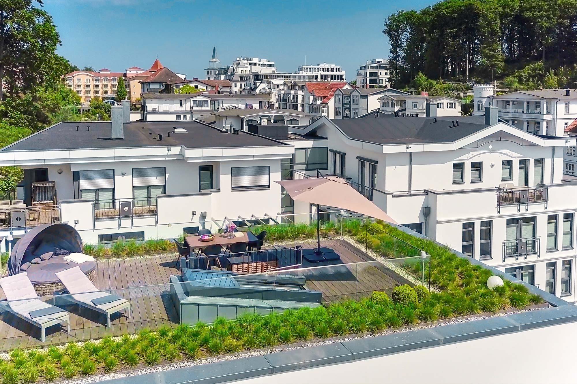 Das Penthouse unter dem Dach der Villa Baltic im Ostseebad Sellin bietet Ihnen und Ihrer Familie auf 150 Quadratmetern Wohnfläche und drei Etagen ein Urlaubsambiente der Extraklasse. Schon auf den ersten Blick begeistern die hochwertigen, perfekt aufeinander abgestimmten Möbel und das überaus harmonische Farbkonzept. Bodentiefe Fenster unterstreichen den von gebeizter Eiche, edlem Glas und poliertem Beton geprägten Loft-Charakter Ihres Urlaubsdomizils. Eine Treppe führt hinauf und man kann es kaum erwarten, in einem der bequemen Lounge-Sessel auf der stolzen 60 Quadratmeter großen und von Dünengras gesäumten Dachterrasse Platz zu nehmen, um die Sonne und den weiten Ausblick über Sellin und den Selliner See bis zu den sanften Hügeln des Umlandes zu genießen. Ja, so lässt es sich leben! Und bis zum Hauptstrand mit der berühmten Seebrücke sind es über die Wilhelmstraße nur rund 150 Meter Fußweg - besser geht es kaum.