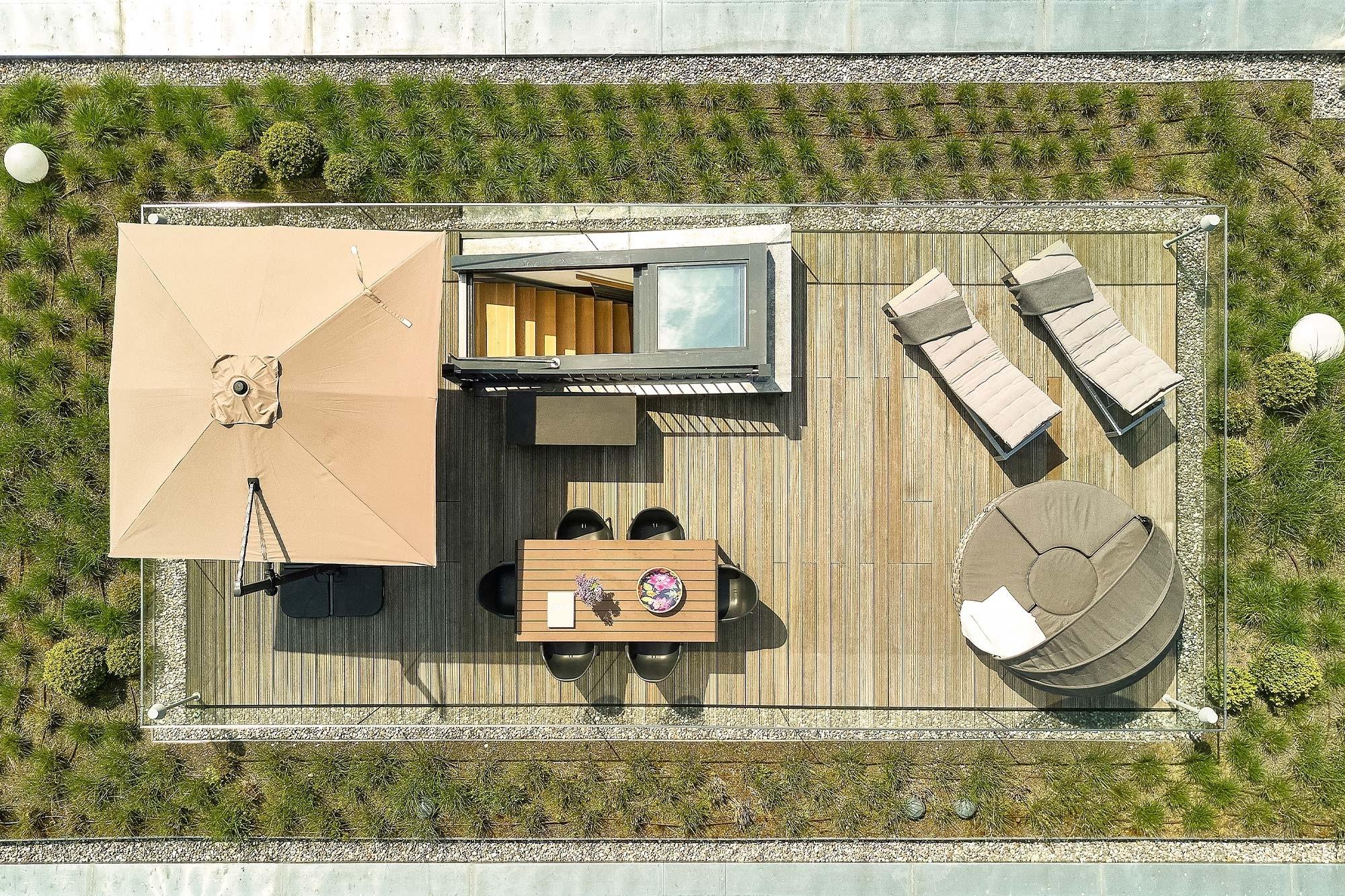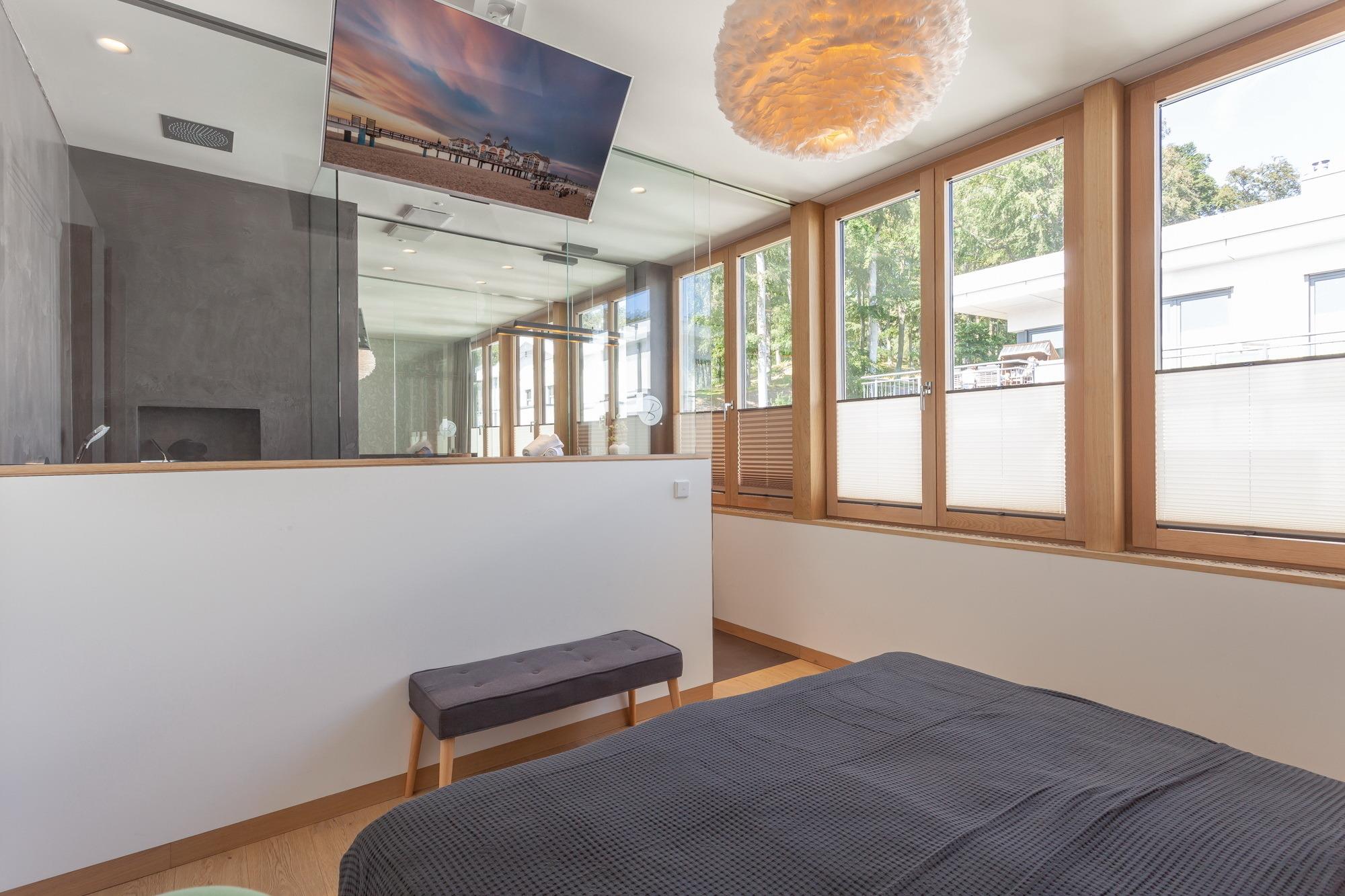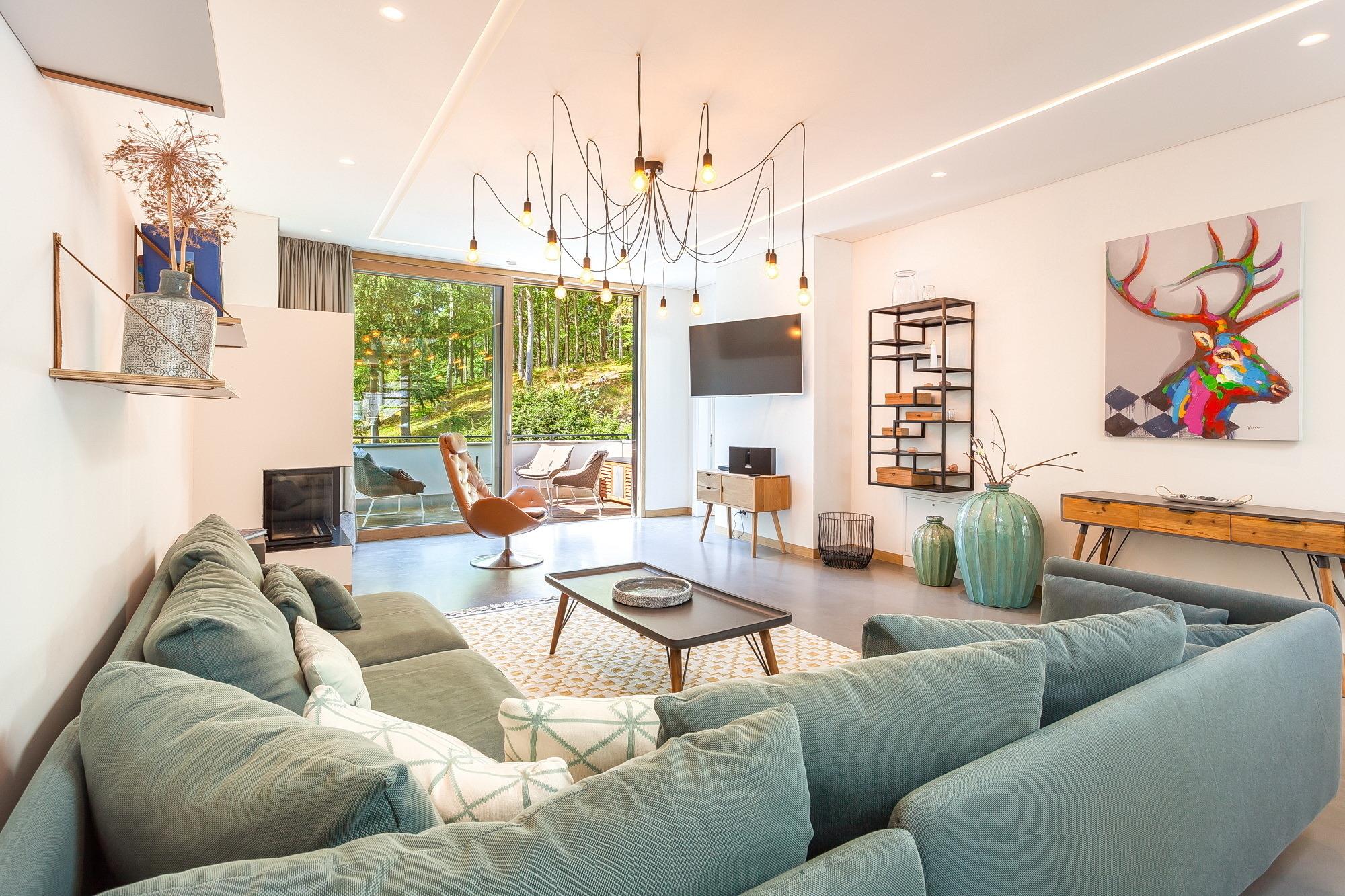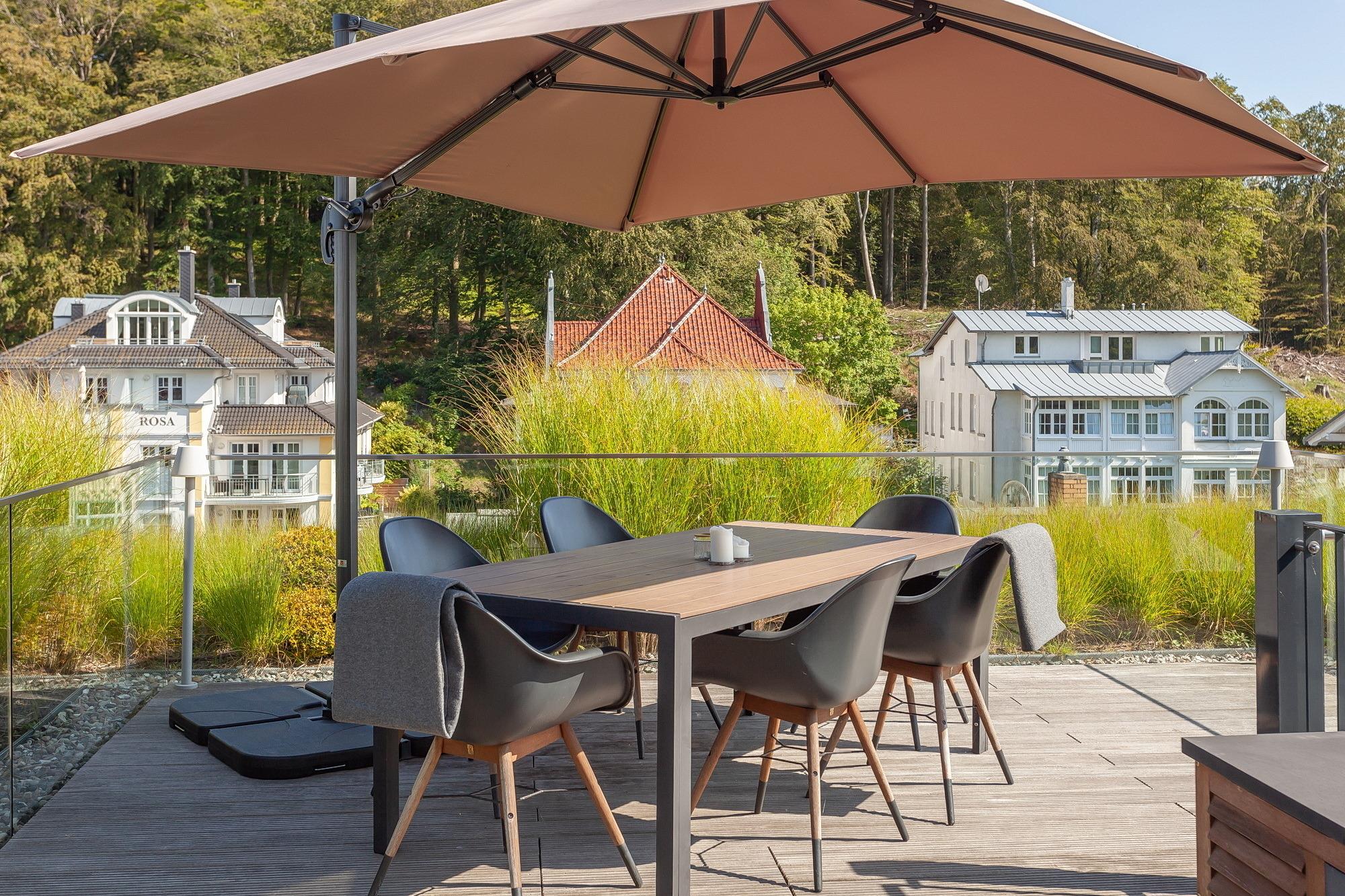 Das Penthouse unter dem Dach der Villa Baltic im Ostseebad Sellin bietet Ihnen und Ihrer Familie auf 150 Quadratmetern Wohnfläche und drei Etagen ein Urlaubsambiente der Extraklasse. Schon auf den ersten Blick begeistern die hochwertigen, perfekt aufeinander abgestimmten Möbel und das überaus harmonische Farbkonzept. Bodentiefe Fenster unterstreichen den von gebeizter Eiche, edlem Glas und poliertem Beton geprägten Loft-Charakter Ihres Urlaubsdomizils. Eine Treppe führt hinauf und man kann es kaum erwarten, in einem der bequemen Lounge-Sessel auf der stolzen 60 Quadratmeter großen und von Dünengras gesäumten Dachterrasse Platz zu nehmen, um die Sonne und den weiten Ausblick über Sellin und den Selliner See bis zu den sanften Hügeln des Umlandes zu genießen. Ja, so lässt es sich leben! Und bis zum Hauptstrand mit der berühmten Seebrücke sind es über die Wilhelmstraße nur rund 150 Meter Fußweg - besser geht es kaum.