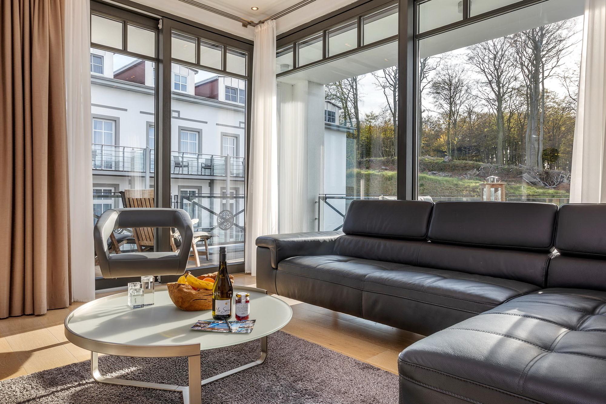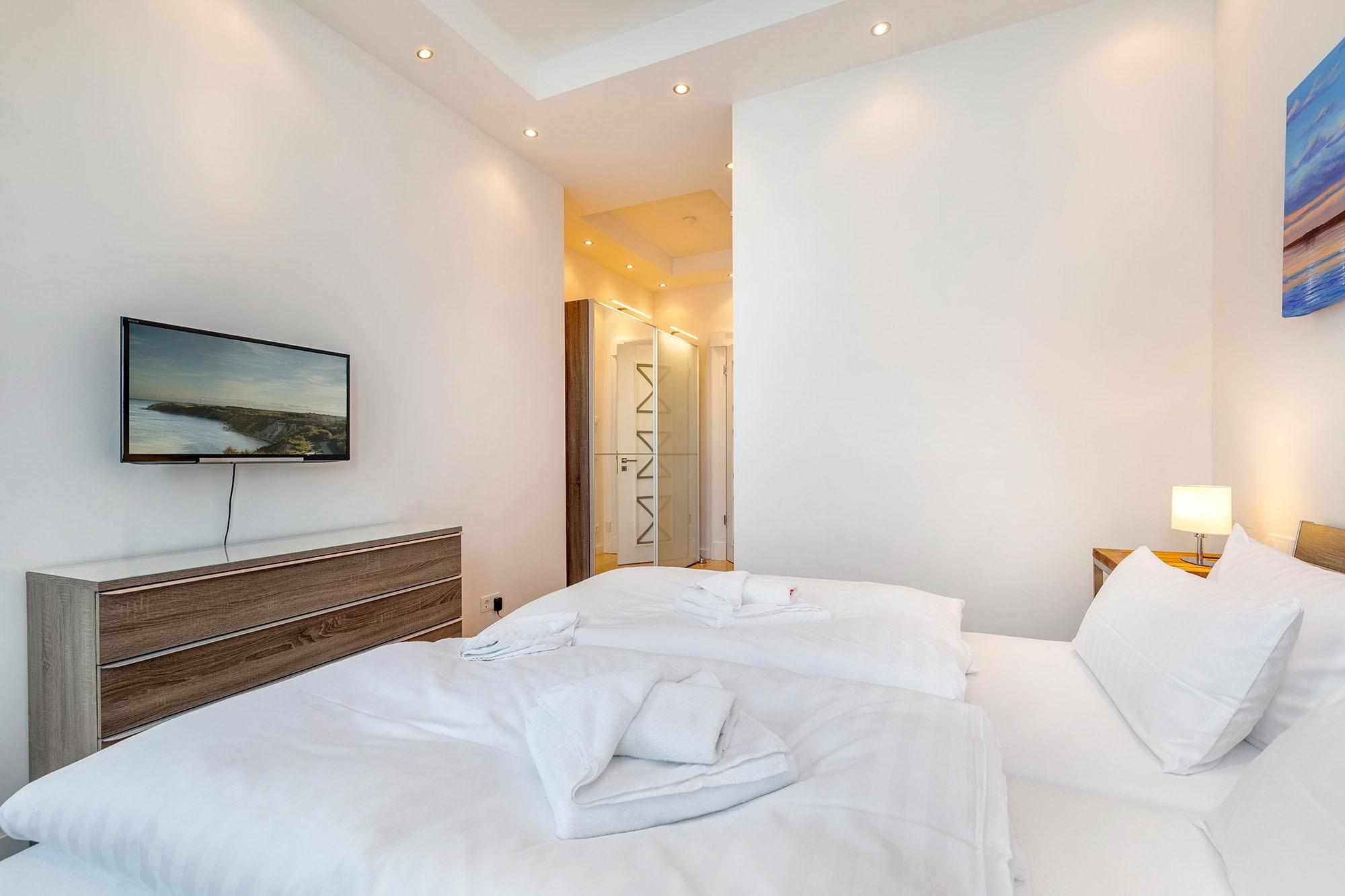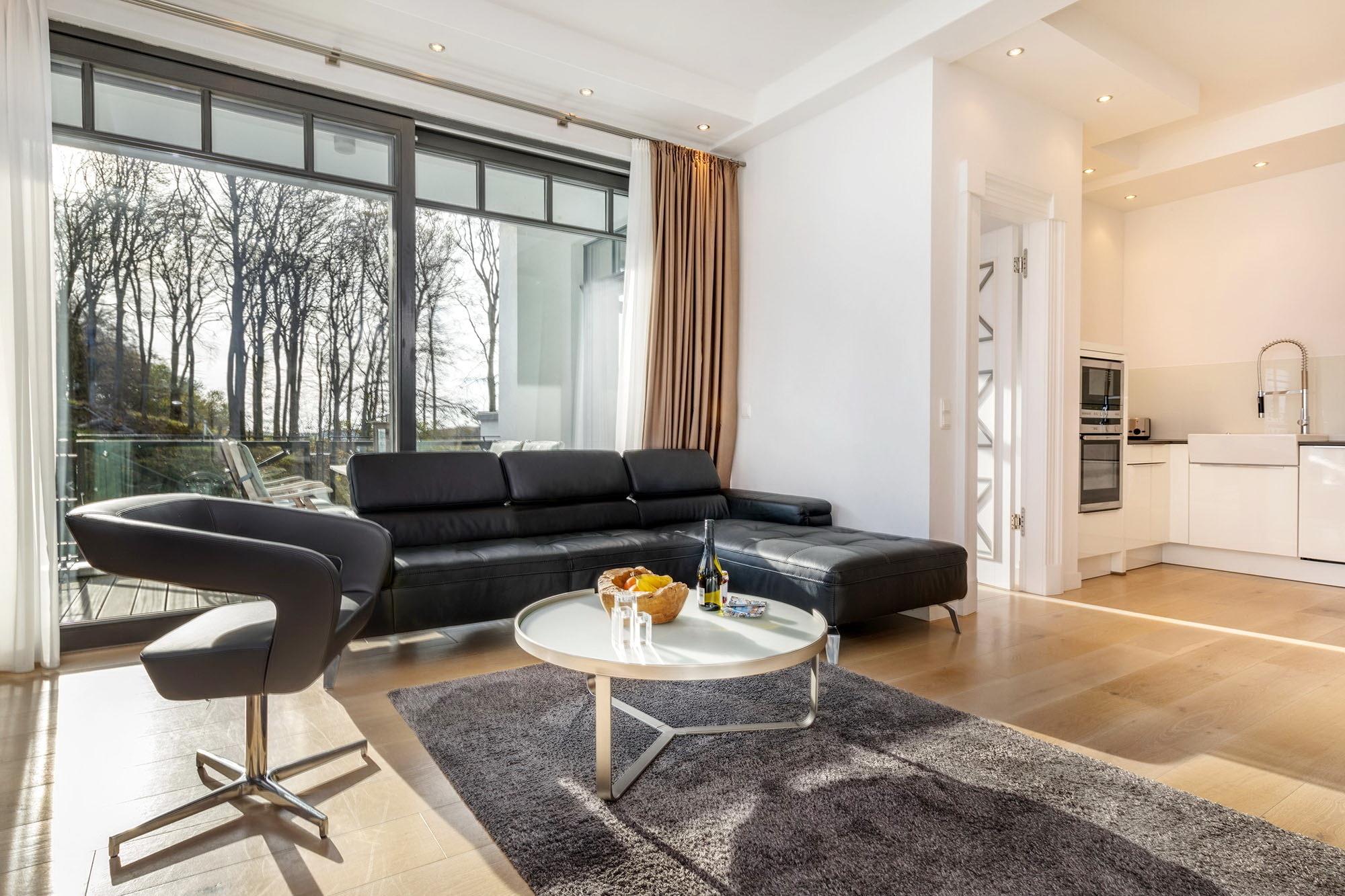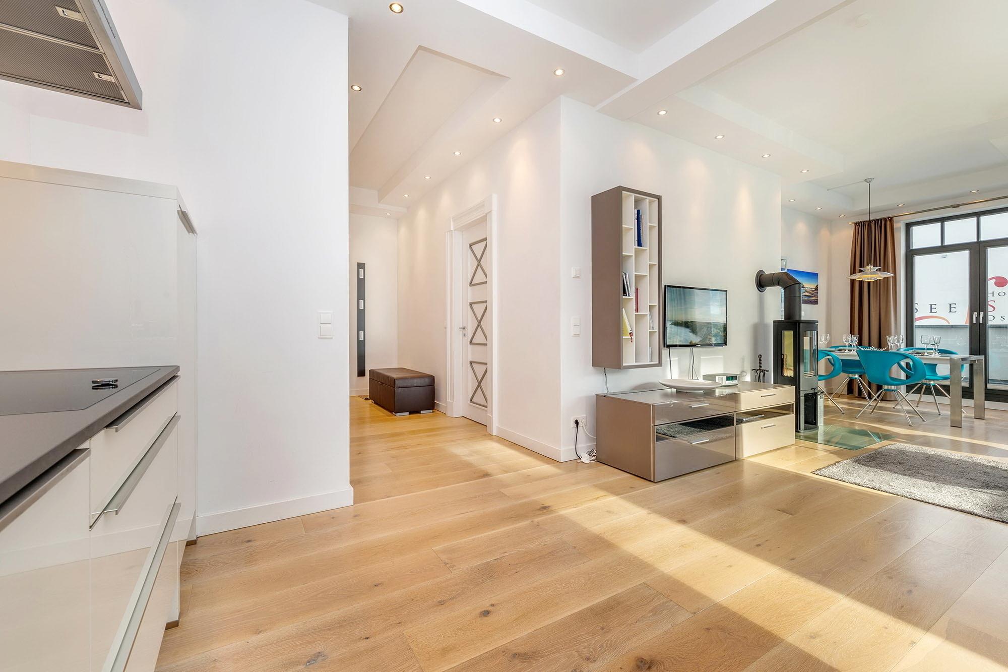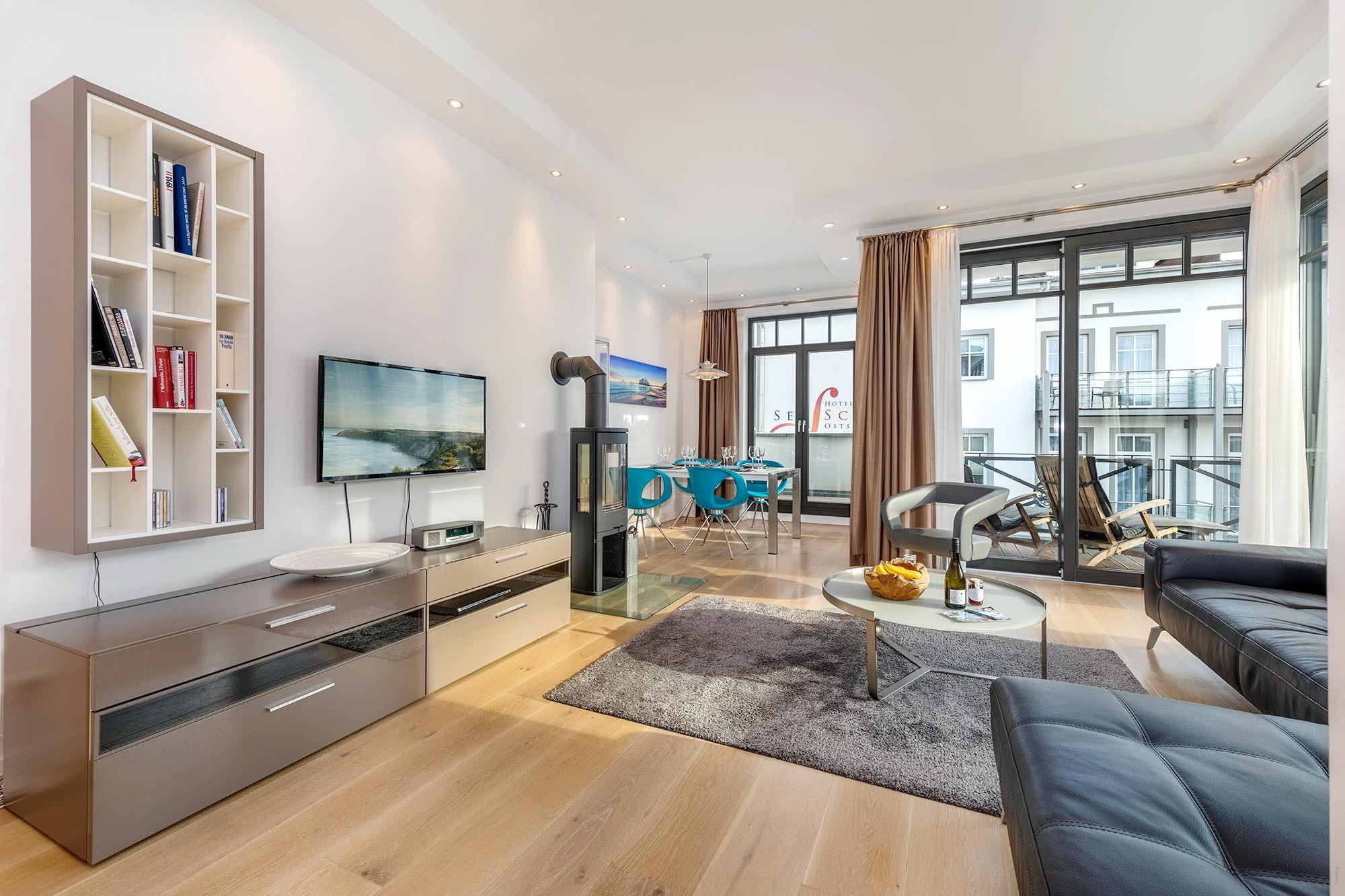 Herrlich lichtdurchflutet dank der bodentiefen Fenster lädt der kombinierte Wohn- und Essbereich zum Entspannen und Genießen ein. Das sorgfältig ausgewählte und äußerst hochwertige Mobiliar besticht durch funktionale Eleganz. Ein Kamin sorgt für zünftige Romantik, die flächendeckende Fußbodenheizung für ein angenehmes Raumklima zu jeder Jahreszeit. Schnell ist auch der großzügige Süd-Balkon entdeckt. Lassen Sie sich die frische Ostseebrise um die Nase wehen und genießen Sie den seitlichen Blick aufs Meer sowie auf den Pool auf der windgeschützten Landseite. Zwei große Schlafzimmer mit bequemen Doppelbetten und eleganten Ensuite-Bädern stehen Ihnen zur Verfügung. Die geräumigen Duschen sind ebenerdig.