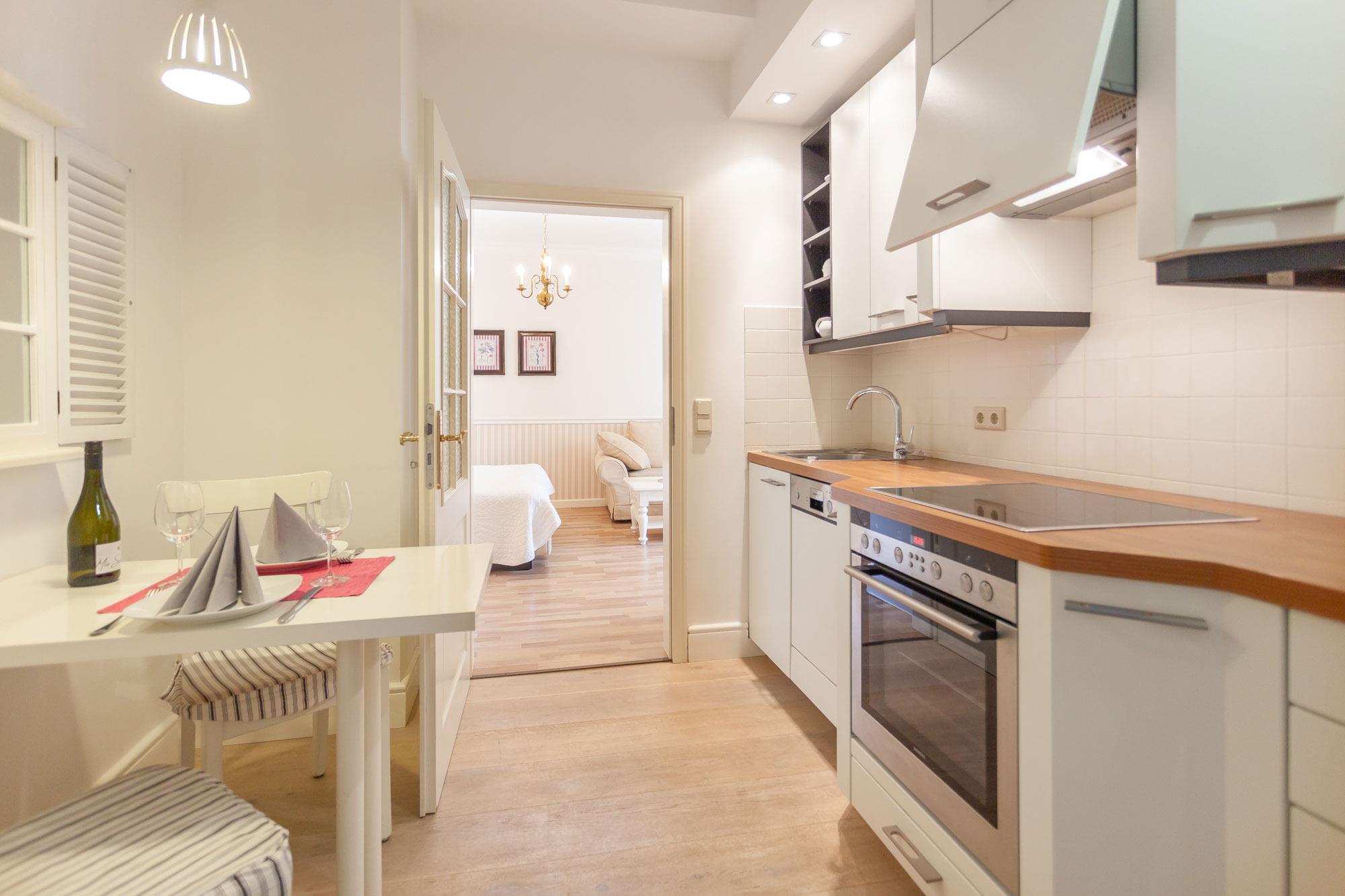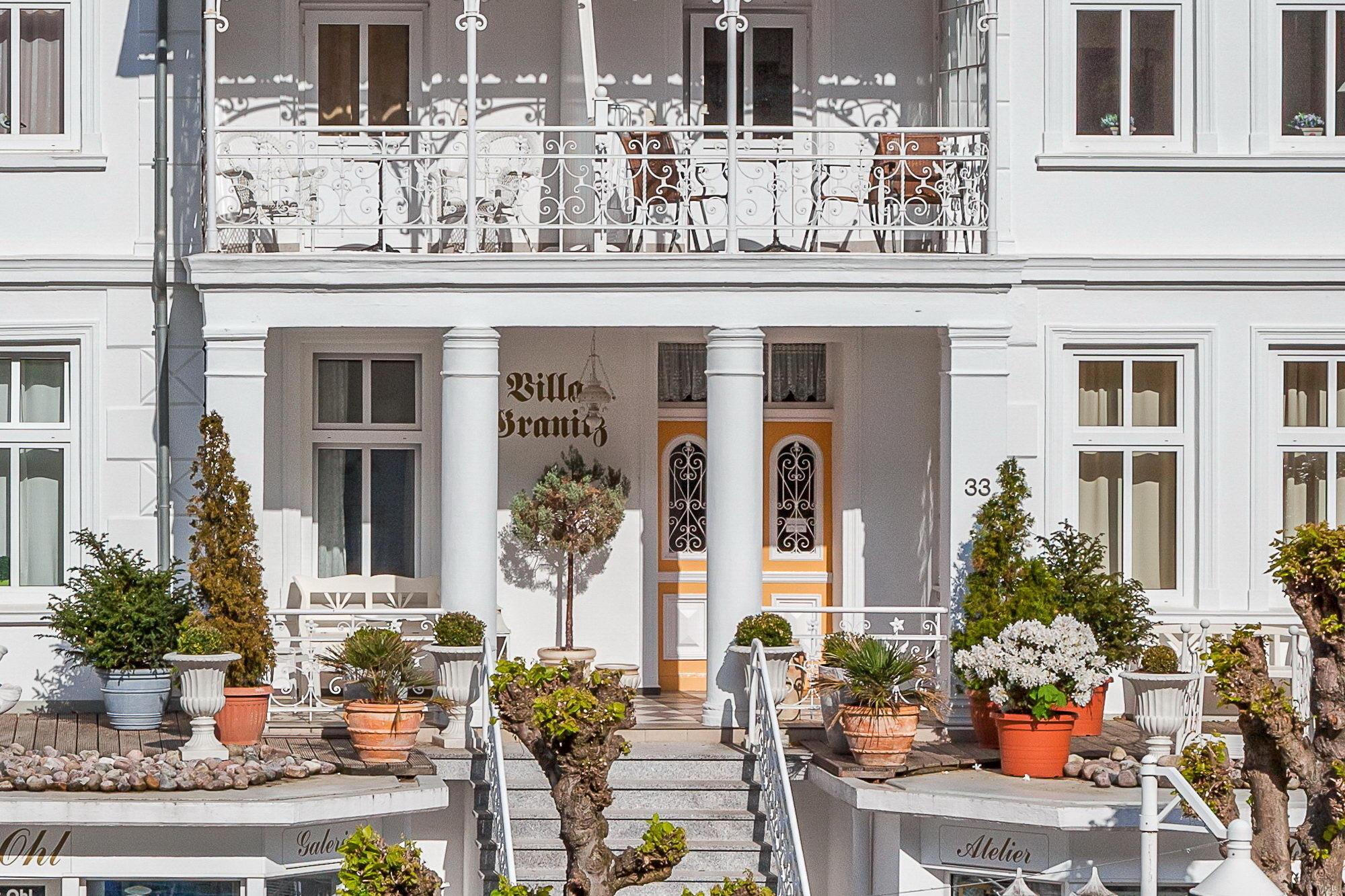 Elegante Gemütlichkeit pur strahlt die Ferienwohnung Nr. 5 in der Villa Granitz aus. Kuschelige 35 Quadratmeter groß, bietet sie hinter der schmucken Fassade der alten Bäderstilvilla für maximal zwei Personen allen Urlaubskomfort der Moderne. Umgeben von einem angenehmen Farbkonzept finden sich im kombinierten Wohn- und Schlafraum ein großes Doppelbett, eine stilvolle Sitzgarnitur und natürlich auch ein Flachbild-TV. Hier lässt es sich wohlfühlen und die Zweisamkeit genießen! Sogar Kochen wird zur Freude, denn die hochwertige Markenküche lässt mit ihrer kompletten Ausstattung keine Wünsche offen. Ein Bad mit Dusche und WC sowie ein möblierter Balkon gehören selbstverständlich ebenfalls dazu. Willkommen in diesem Urlaubs-Kleinod, nur wenige Schritte vom Selliner Hauptstrand und der Seebrücke entfernt!