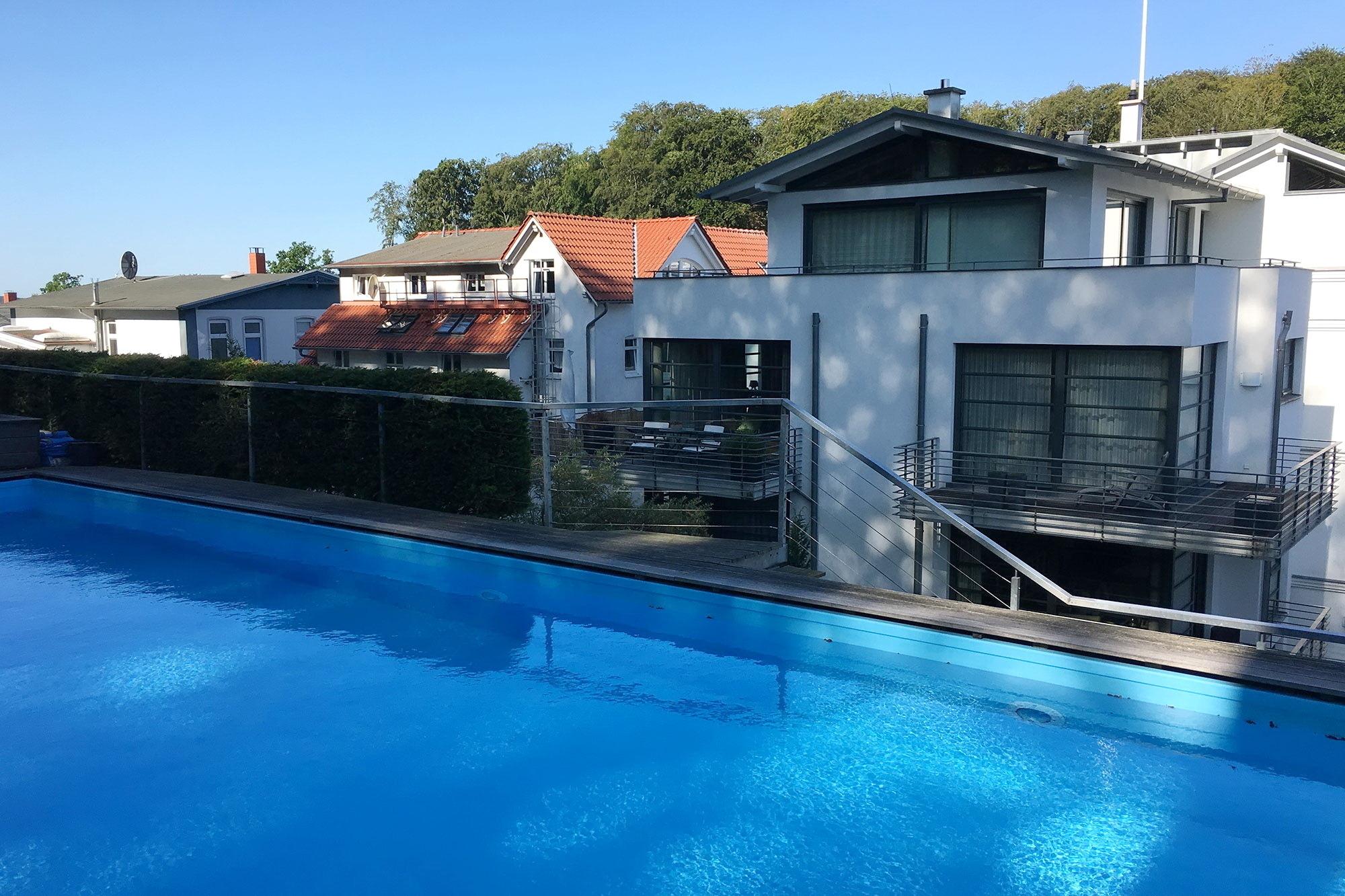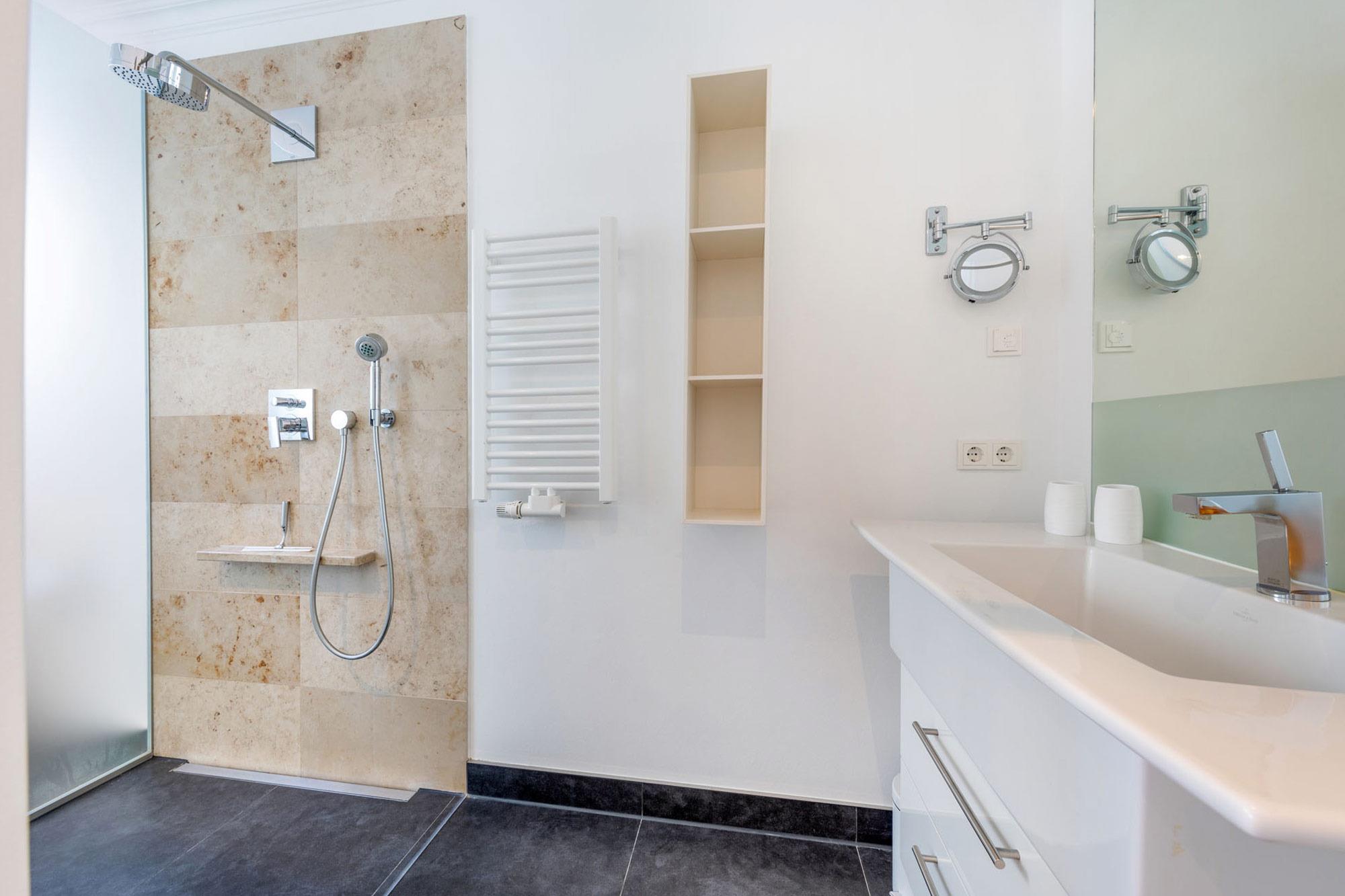 Die beiden Schlafzimmer überzeugen mit ihren luxuriösen Boxspring-Doppelbetten, Kleiderschränken und den 32 Zoll LED Fernsehern (inkl. Netflix) und strahlen eine elegante Behaglichkeit aus. Vom ersten Schlafzimmer (Richtung Osten) genießen Sie einen herrlichen Blick auf den solar beheizten Aussenpool und dem seitlichen Blick auf die Wilhelmstraße. Dem Schlafzimmer angeschlossen befinden sich jeweils ein Ensuite-Bad, welches mit hochwertiger Keramik von Villeroy [&] Boch und Amaturen von Grohe Axor ausgestattet ist. Dies gibt den Ensuite-Bädern eine definierte Ästhetik und lässt keine Wünsche offen.