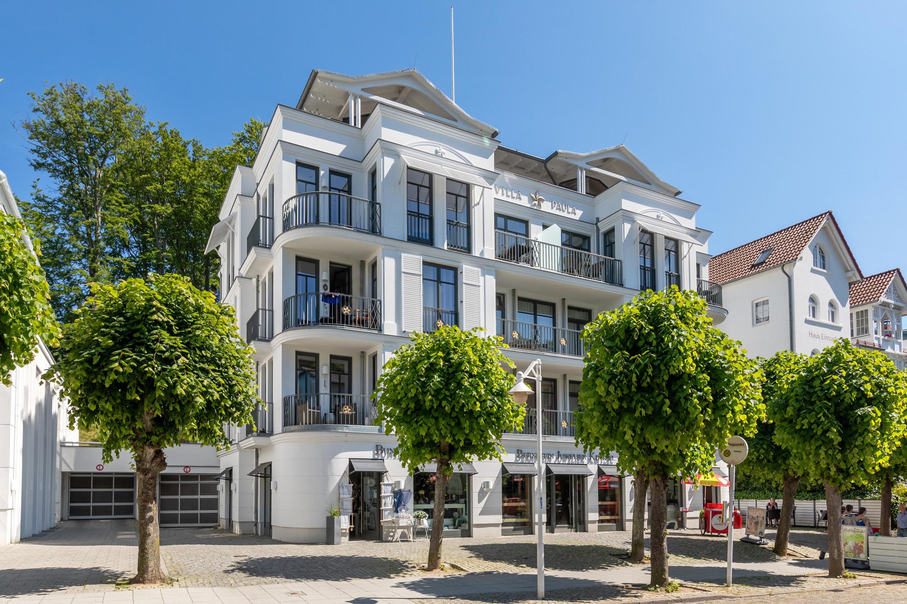 Wir freuen uns, Ihnen diese Mitte 2023 frisch renovierte Wohnung in bester Lage von Sellin anbieten zu können. Dieses tolle Domizil wurde mit viel Liebe zum Detail für Ihren perfekten Urlaub geschaffen. Bequem per Aufzug erreichen Sie aus der Tiefgarage das "Promenadendeck" im 1. Obergeschoss der Villa Paula. Auf insgesamt 2 Etagen erstrecken sich ein Eingangsbereich, ein Gäste-WC, ein Schlafzimmer mit Bad en Suite, ein großer Wohn-, Essbereich, sowie 2 tolle Balkone mit seitlichem Meerblick. Zusätzlich steht allen Gästen des Hauses ein kostenfreier Pool (saisonbedingt) zur Verfügung. Durch die hochwertige Schlafcouch im Wohnbereich können wir Ihnen dieses Domizil für bis zu 4 Personen anbieten.