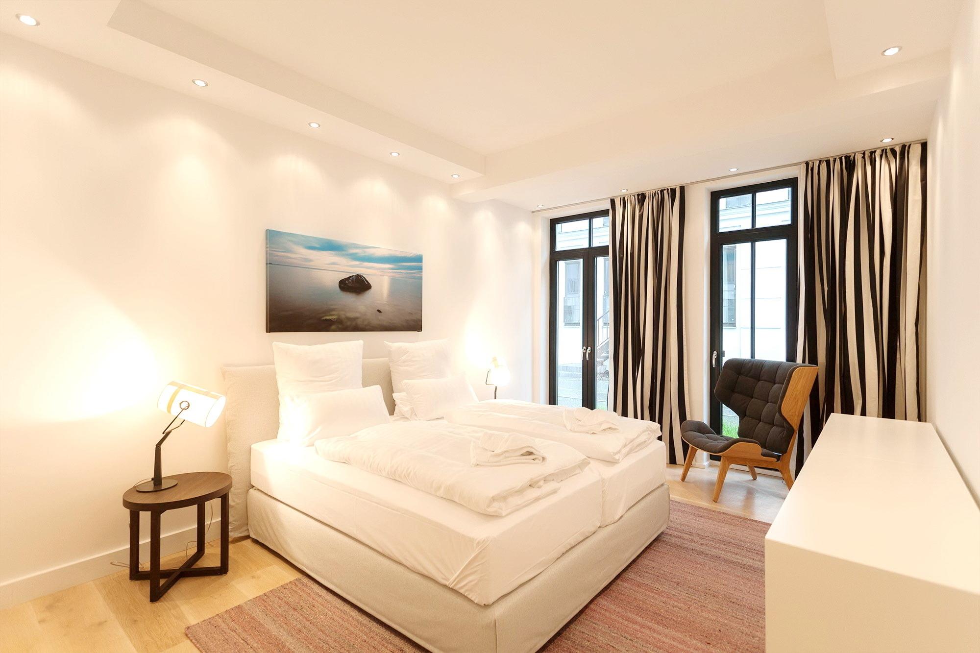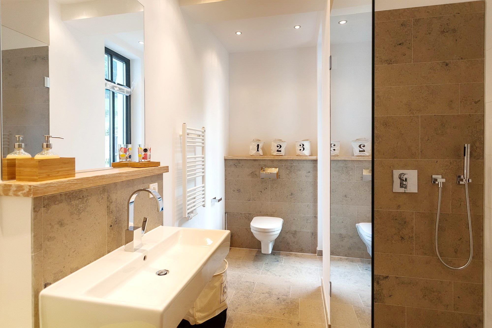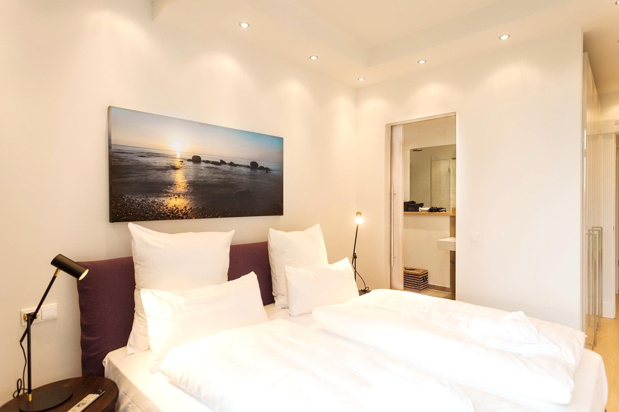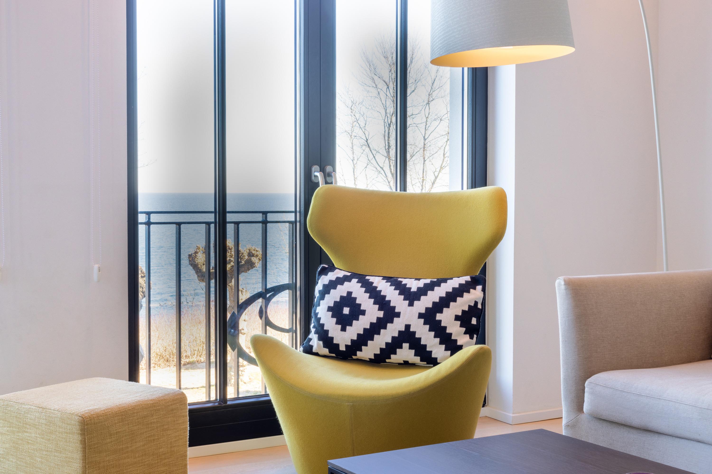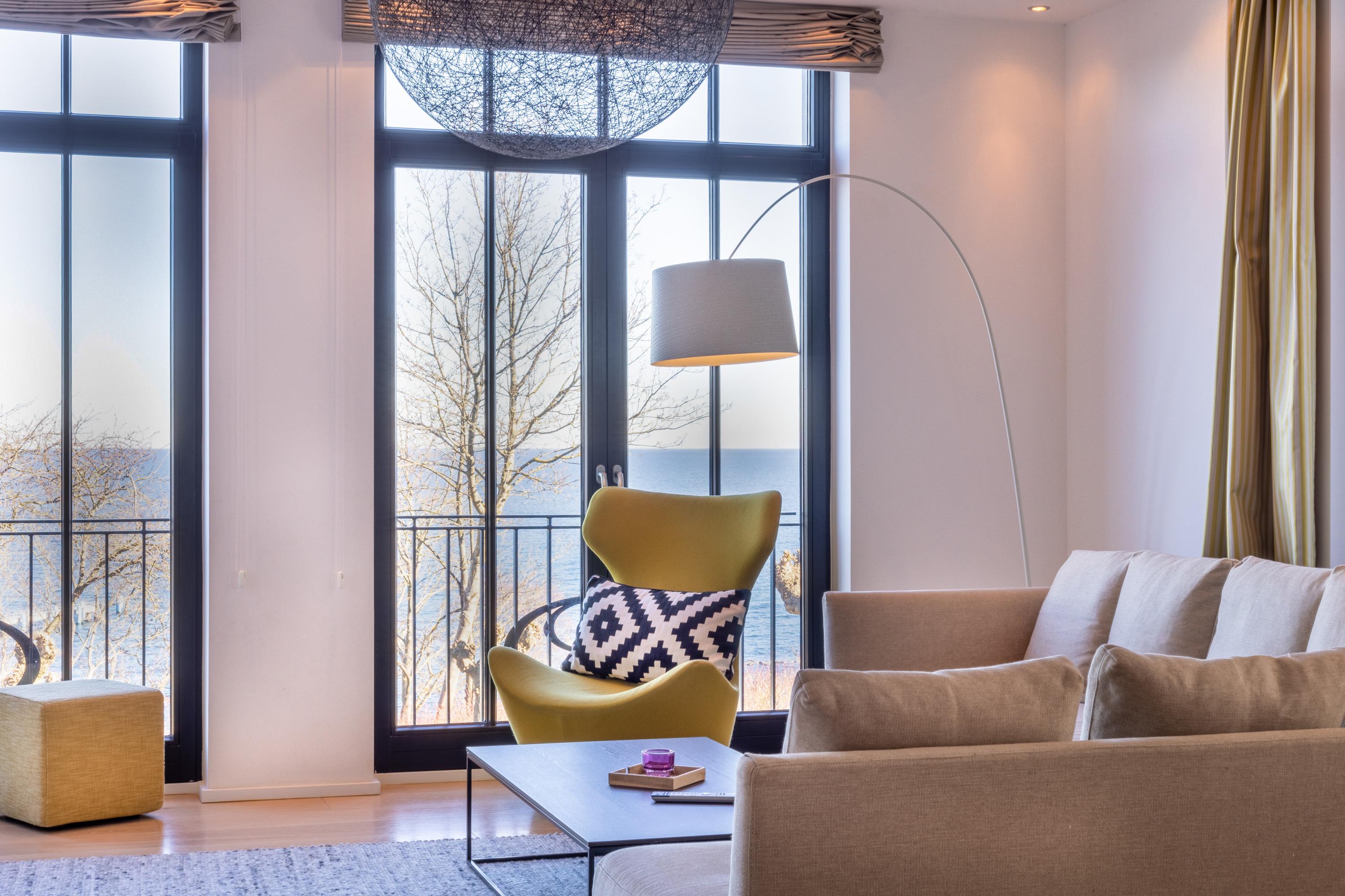 Ihr riesiger, fast 70 Quadratmeter großer Wohn- und Essbereich mit Terrassen befindet sich im ersten Obergeschoss der Villa Philine. Ob trautes Kuscheln vor dem Kaminfeuer, spannende Fernsehabende oder Duelle am wohnungseigenen Kickertisch, relaxter Musikgenuss oder genussvolles Kochen – für all Ihre Wünsche und Ideen wurde vorgesorgt. All das natürlich begleitet vom immer wieder aufs Neue faszinierenden Blick aufs Meer. Ein paar Treppenstufen tiefer finden Sie Ihre drei Schlafzimmer mit bequemen Doppelbetten von SCHRAMM, Loewe-TV und angeschlossenen Ensuite-Bädern, ausgestattet mit edlen Manufakturfliesen aus Naturstein, feinster Keramik sowie ebenerdigen Duschen bzw. Badewanne. Im Erdgeschoss befindet sich zudem Ihre private Sauna, in der Sie sich nach einem erlebnisreichen Tag auf der Insel Rügen entspannen und wärmen können.