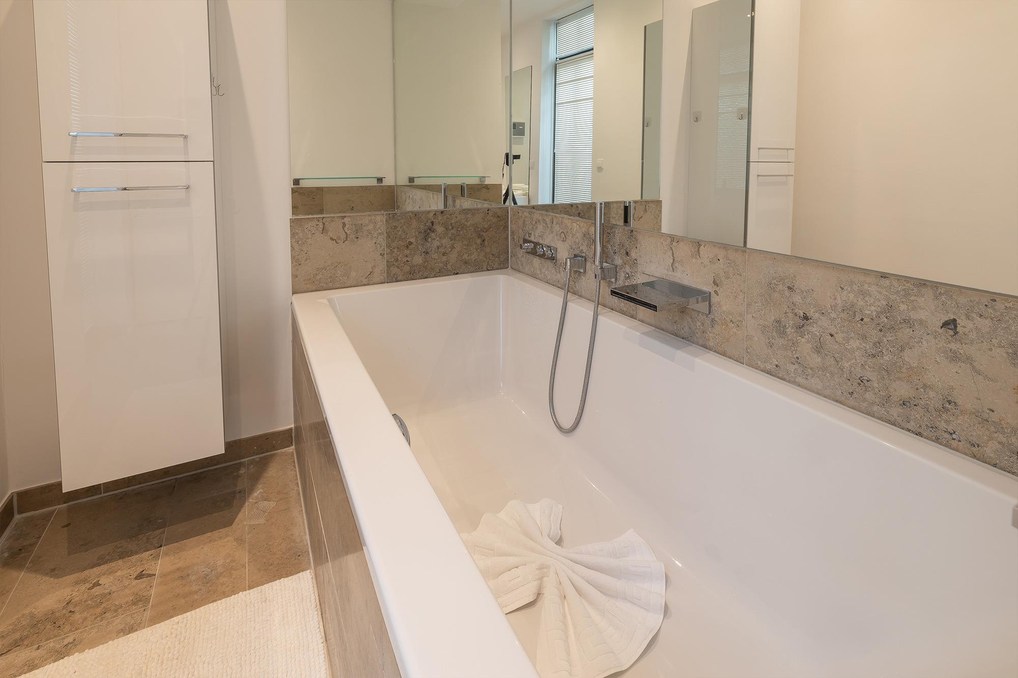Die Wohnfläche von 196 qm erstreckt sich auf über zwei Etage. Im Erdgeschoss befinden sich ein Schlafzimmer mit einem Bad en suite und ein Kinderzimmer mit einem Ensuite Bad.