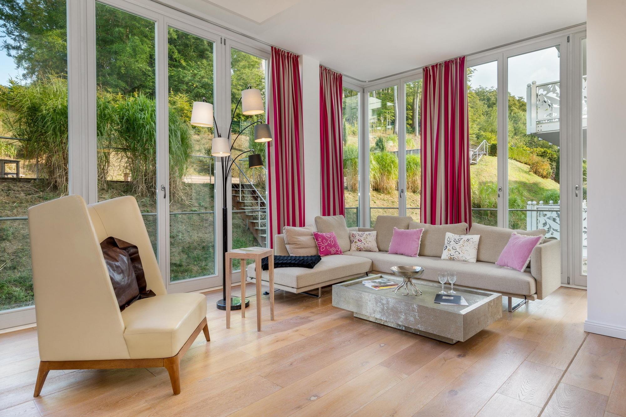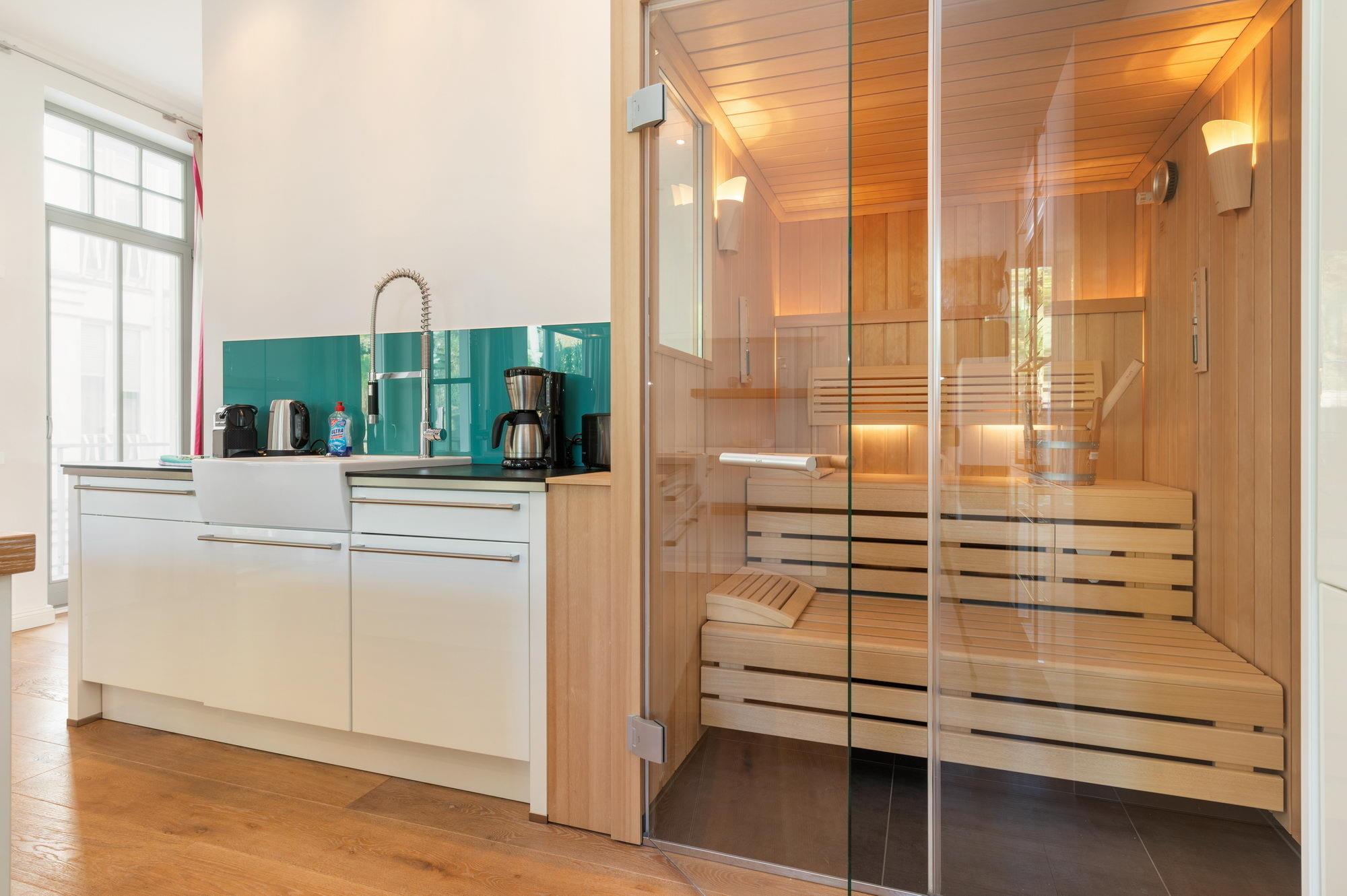 Sie betreten Ihr Urlaubsdomizil im zweiten Obergeschoss, bequem zu erreichen mit dem hauseigenen Lift. Lassen Sie sich von der angenehmen Helligkeit, der exklusiven Dielung aus gekälkter Eiche und dem stylischen Interieur begeistern. Durch die raumhohen Fenster und von der Terrasse aus können Sie zwar nicht das Meer sehen, dafür eröffnet sich Ihnen aber ein schöner Blick auf das Grün des Buchenhains hinter dem Haus mit dem Zugang zum hauseigenen Außenpool, der in der Sommersaison zum erfrischenden Bad einlädt. Gerade das großzügige Wohnzimmer mit der integrierten Luxusküche, dem repräsentativen Kamin, den bequemen Couchmöbeln und dem großformatigen Flatscreen-TV ist ein Highlight. Ungewöhnlich und dabei höchst interessant auch die Lösung der Innenarchitekten, von der wohnungseigenen Sauna einen Blick ins Wohnzimmer zu ermöglichen.