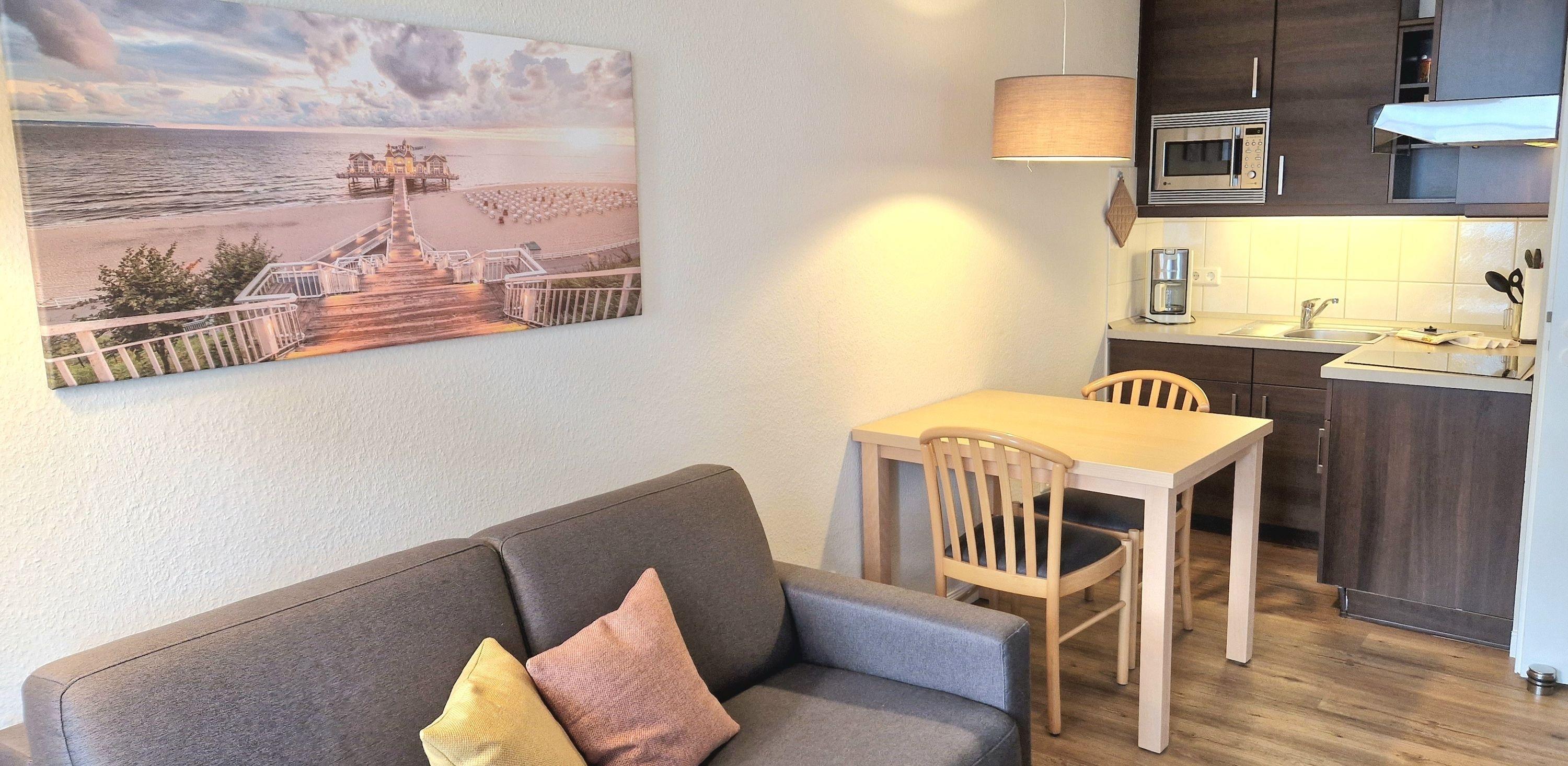 Die Ferienwohnung "Fewo 308, Seepark Sellin" bietet auf 32 m² Platz für maximal 3 Personen. Sie befindet sich in der 1. Etage des Hauses "Haus Having" und ist bequem mit einem Fahrstuhl zu erreichen. Die Ausstattung umfasst einen Flachbildfernseher, eine Filterkaffeemaschine, eine Mikrowelle, sowie Bettwäsche inklusive. Auch Haustiere sind herzlich willkommen. Außerdem verfügt die Wohnung über einen Balkon und eine offene Wohnküche.