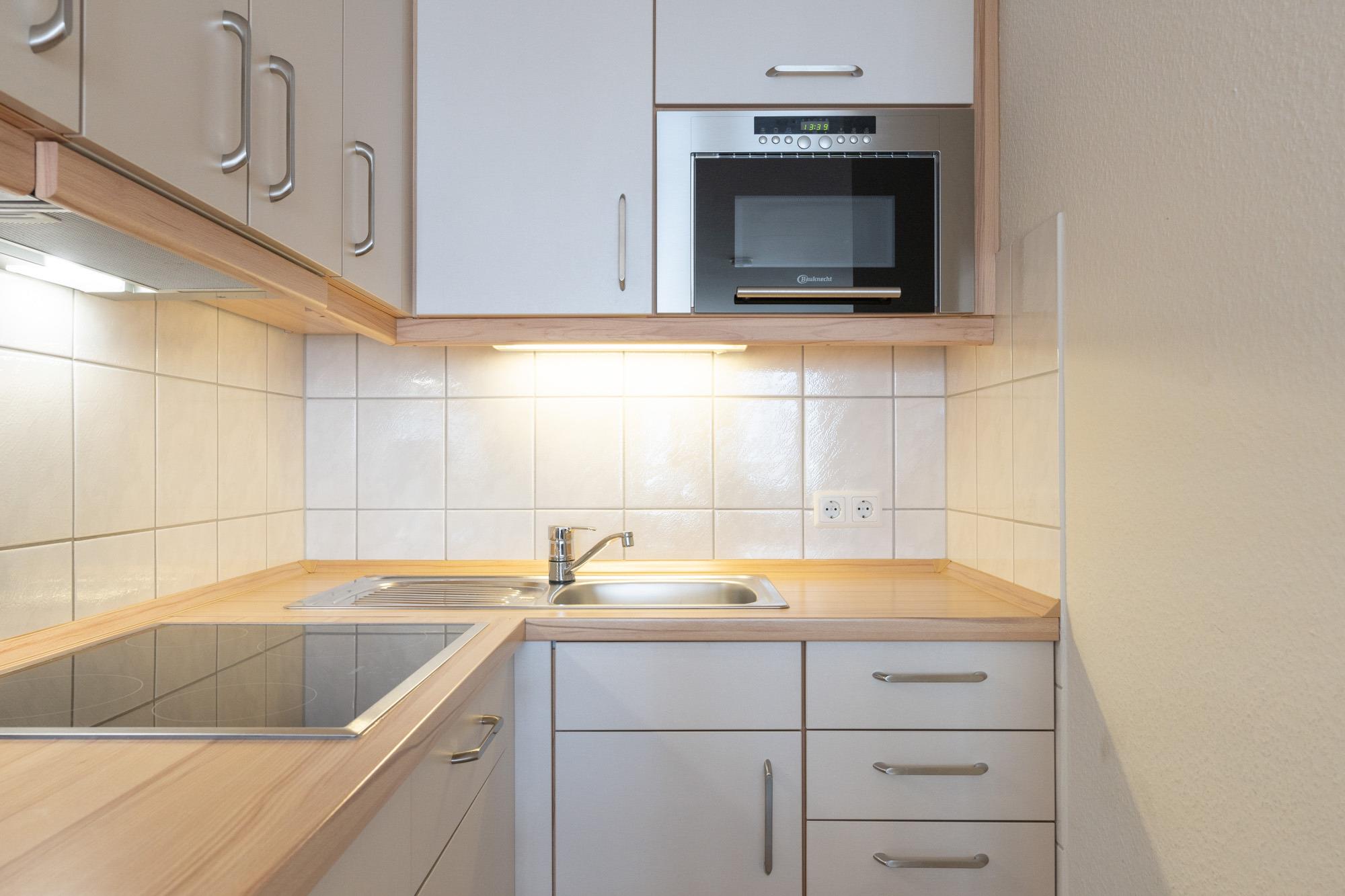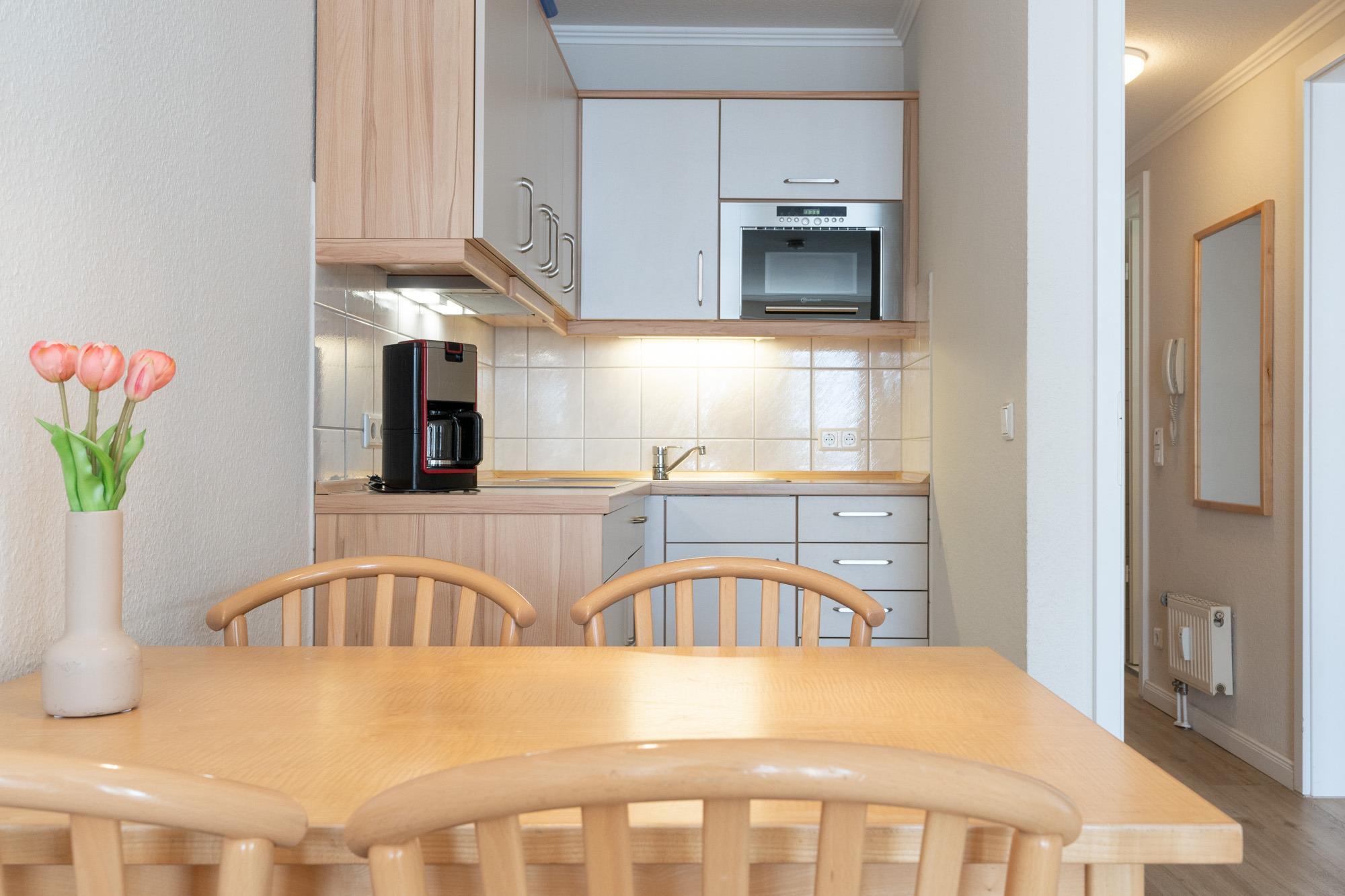 Sie verfügt über ein Schlafzimmer und ein Badezimmer. Die Ausstattung umfasst einen Flachbildfernseher, eine Kaffeemaschine (Filter), eine Mikrowelle sowie Bettwäsche, die bereits im Preis inkludiert ist. Vom Balkon aus genießen Sie einen schönen Ausblick auf die Umgebung. Die offene Wohnküche bietet ausreichend Platz zum Kochen und Essen. Im Fahrradkeller können Sie Ihre Fahrräder sicher abstellen.