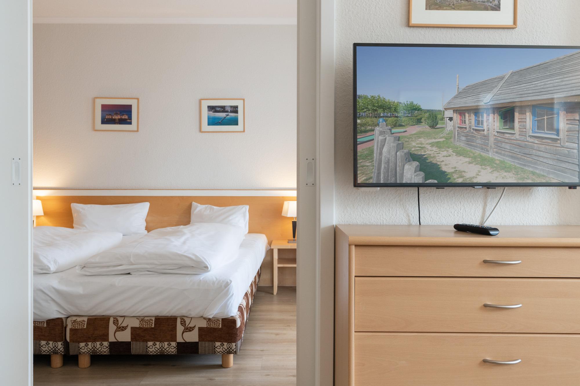 Der WLAN-Anschluss sowie der TV mit Sky-Sender sorgen für Unterhaltung. Ein Tiefgaragenstellplatz steht ebenfalls zur Verfügung. Für einen stressfreien Start in den Tag können Sie den Brötchenservice nutzen. Einkaufsmöglichkeiten befinden sich nur 50 m entfernt, der Strand ist ca. 900 m entfernt. Auch ein Bäcker, Minigolf, ein Restaurant sowie die AHOI! Bade- [&] Erlebniswelt sind in unmittelbarer Nähe. Die Seebrücke und der Schiffsanleger sind ca. 900 m bzw. 500 m entfernt. Die Bushaltestelle ist etwa 100 m entfernt.