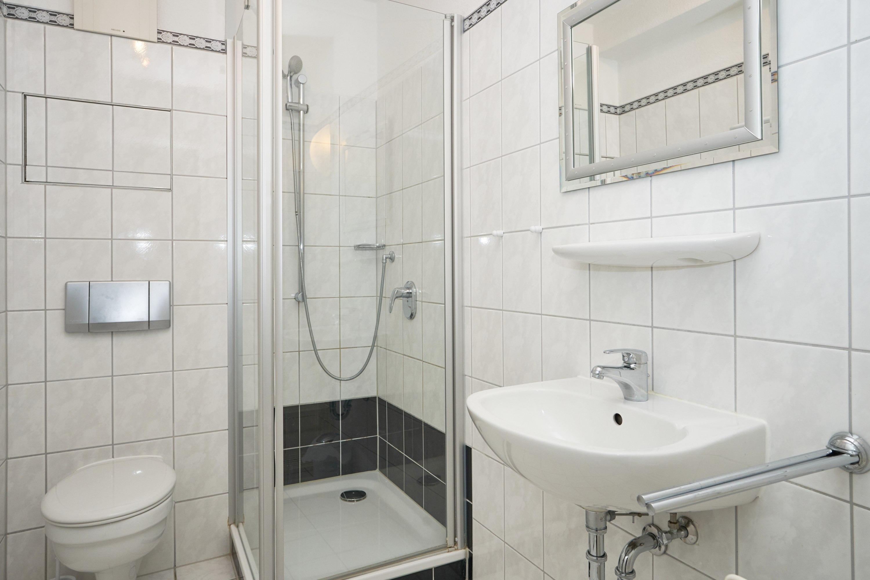 Die Wohnung verfügt über ein gemütliches Schlafzimmer und ein Badezimmer mit Dusche.