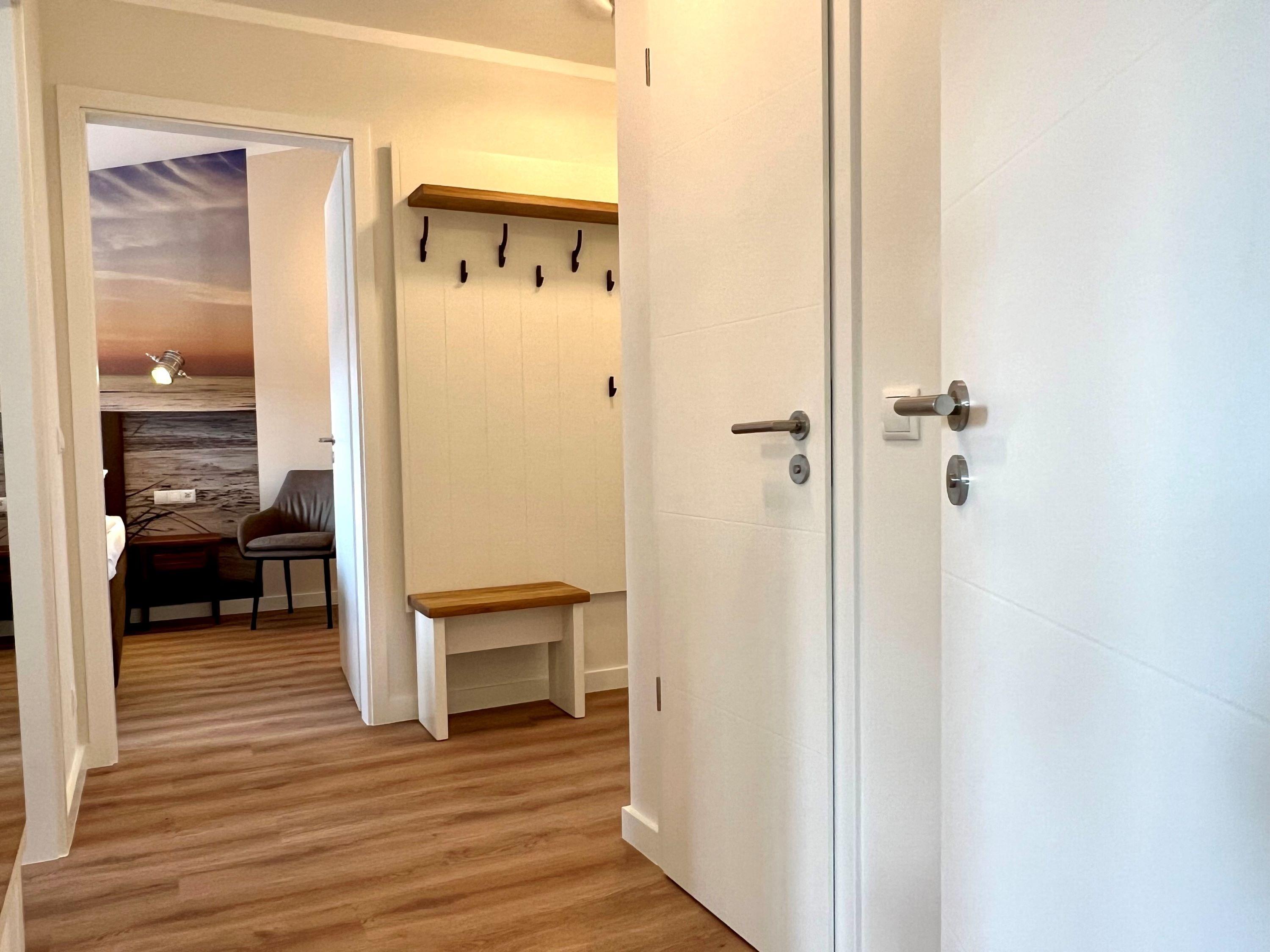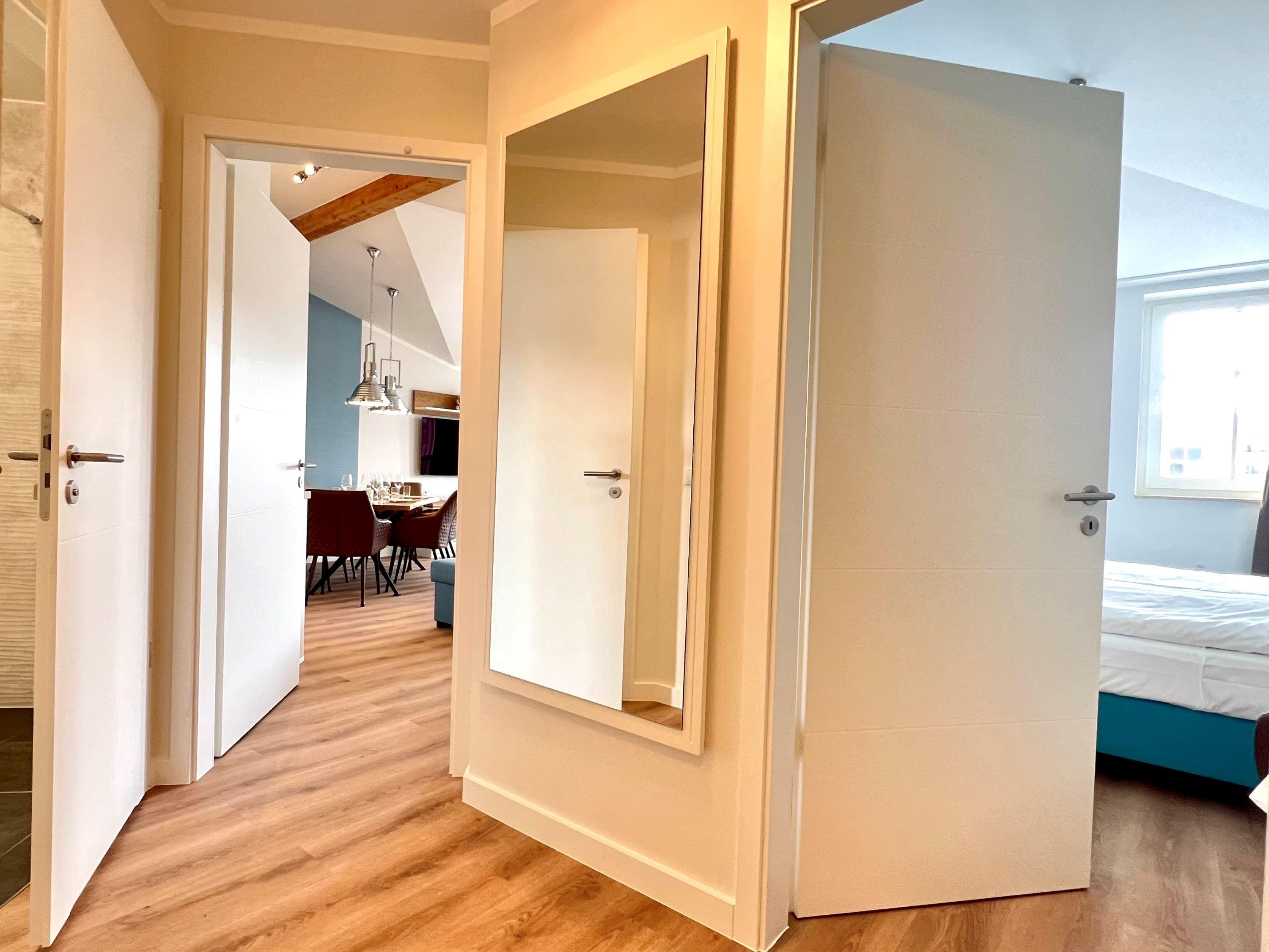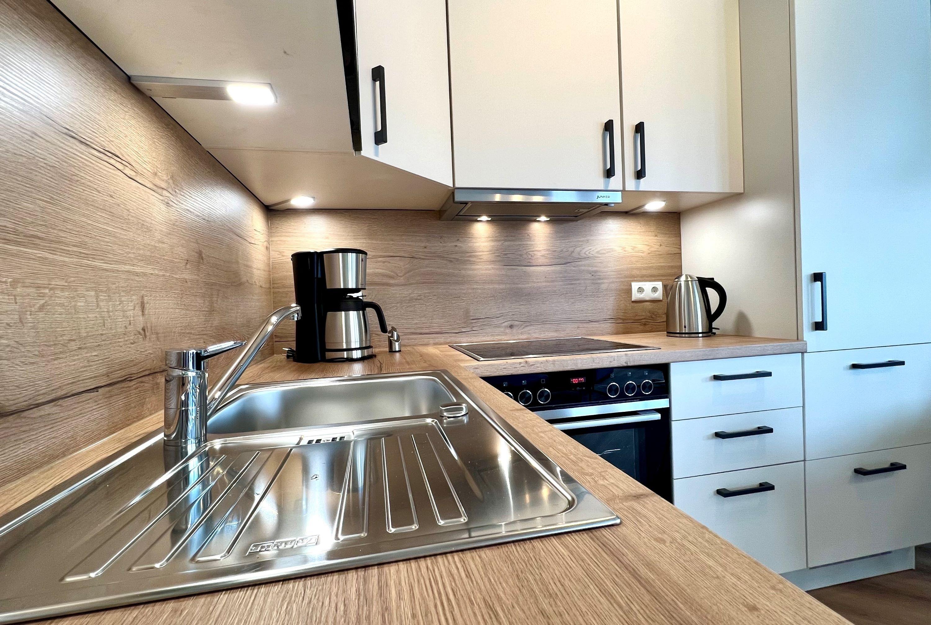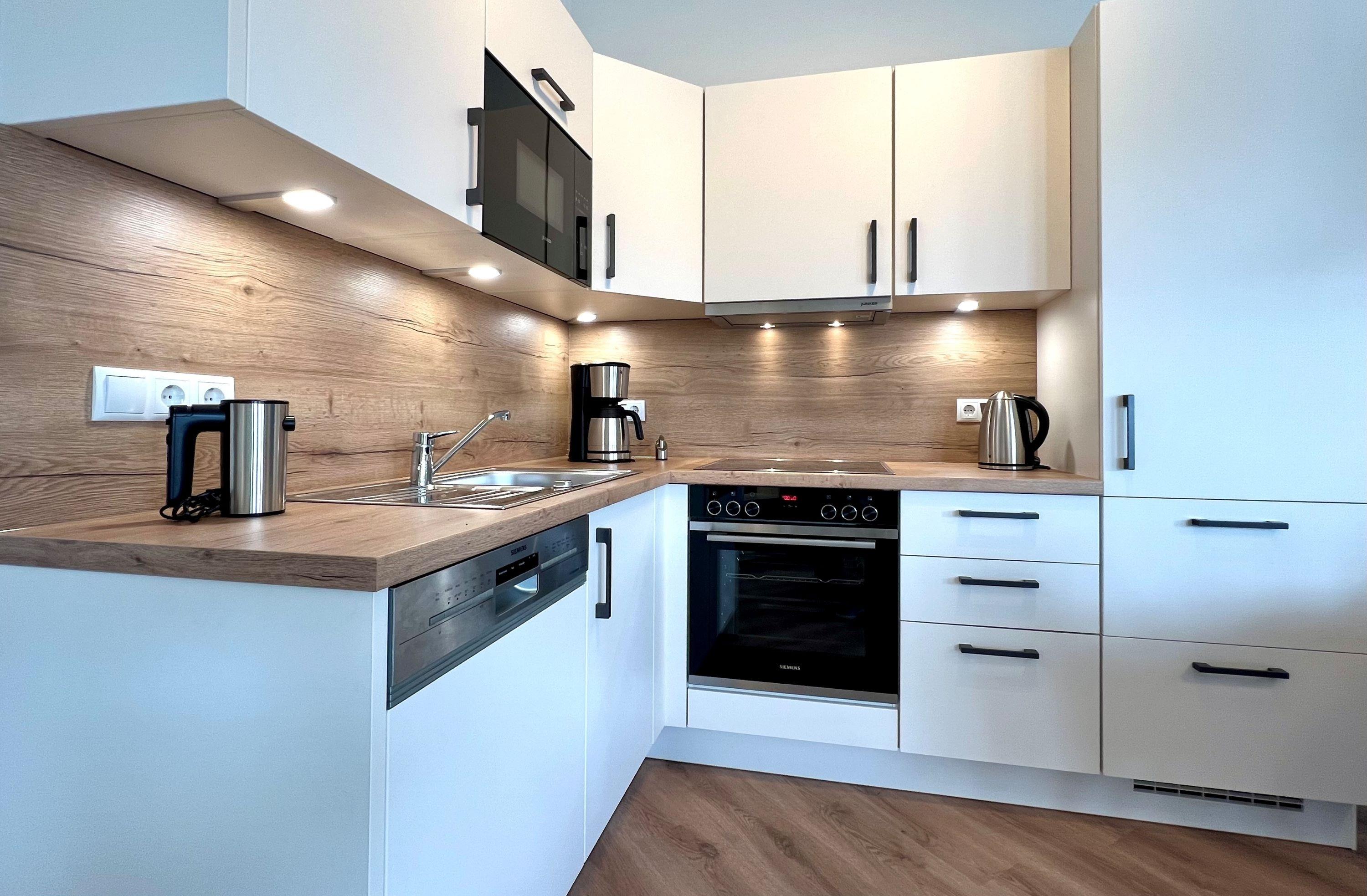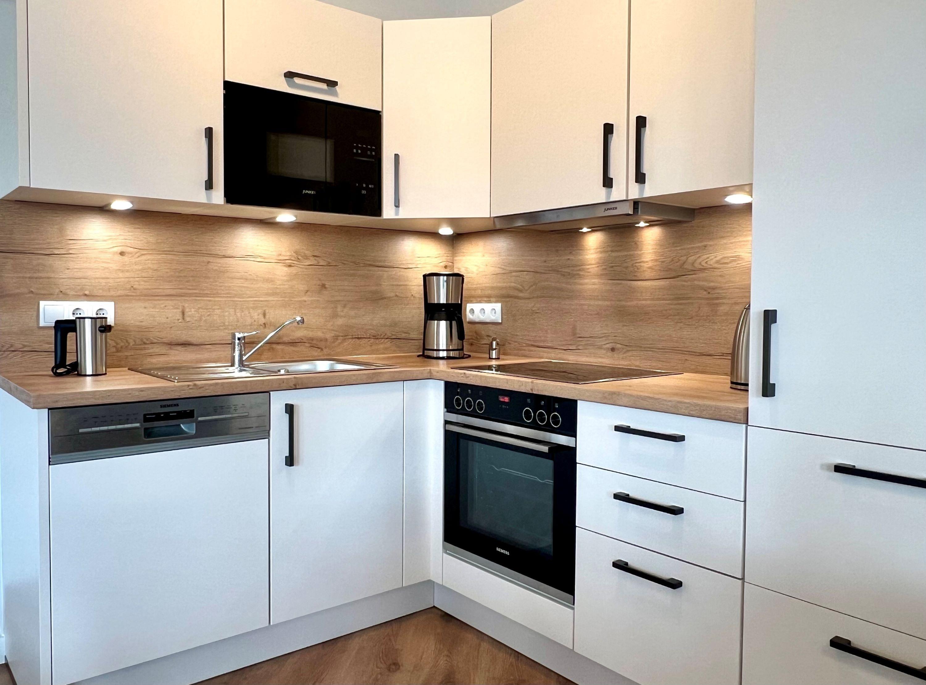 Die offene Küche ist mit hochwertigen Elektrogeräten wie Backofen, Geschirrspüler, Kaffeemaschine, Toaster, Wasserkocher und Rührgerät ausgestattet. Im geräumigen Badezimmer stehen eine ebenerdige Dusche, Fußbodenerwärmung, Föhn und Kosmetikspiegel zur Verfügung. Zudem gibt es ein separates WC und ein kleines Waschbecken.