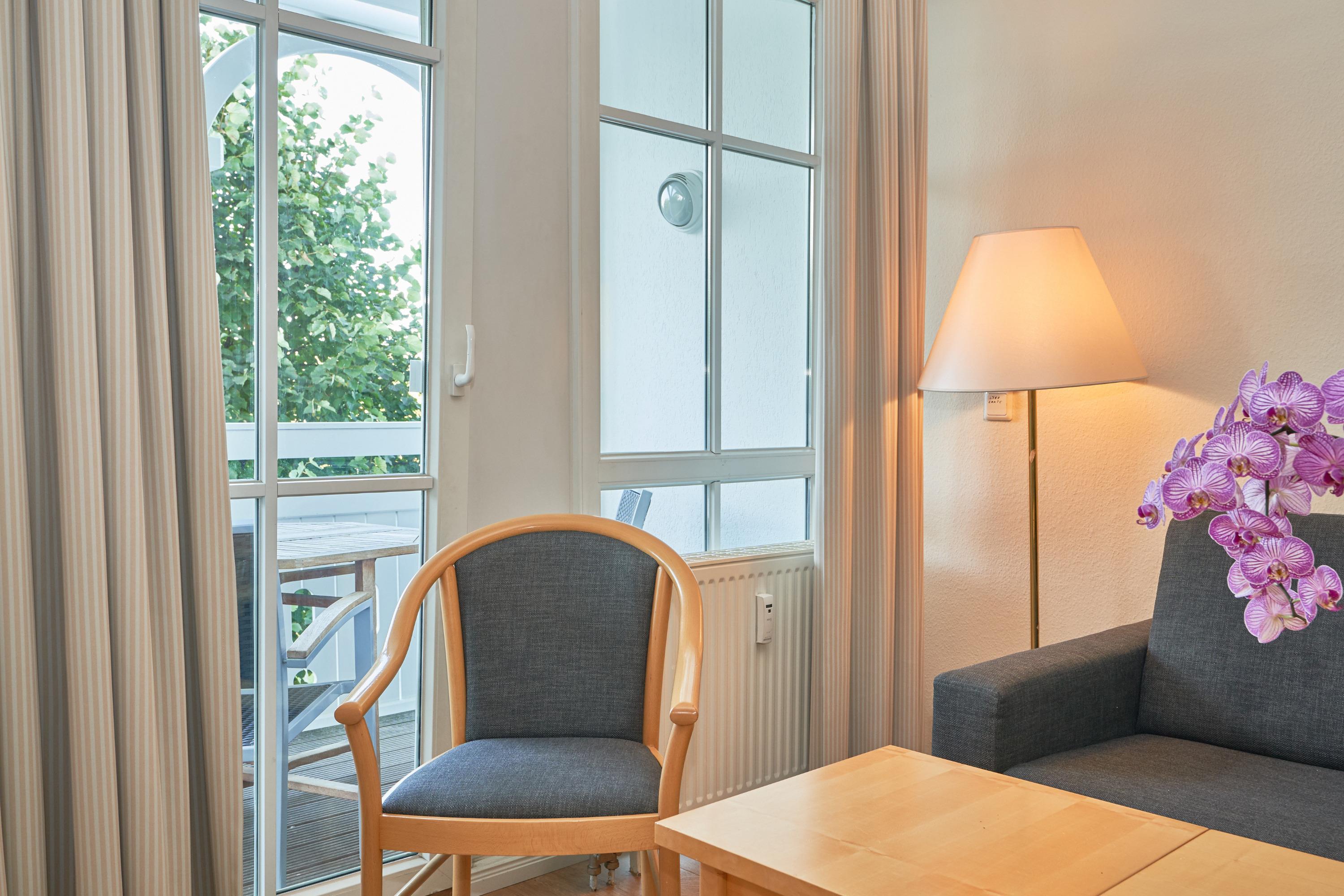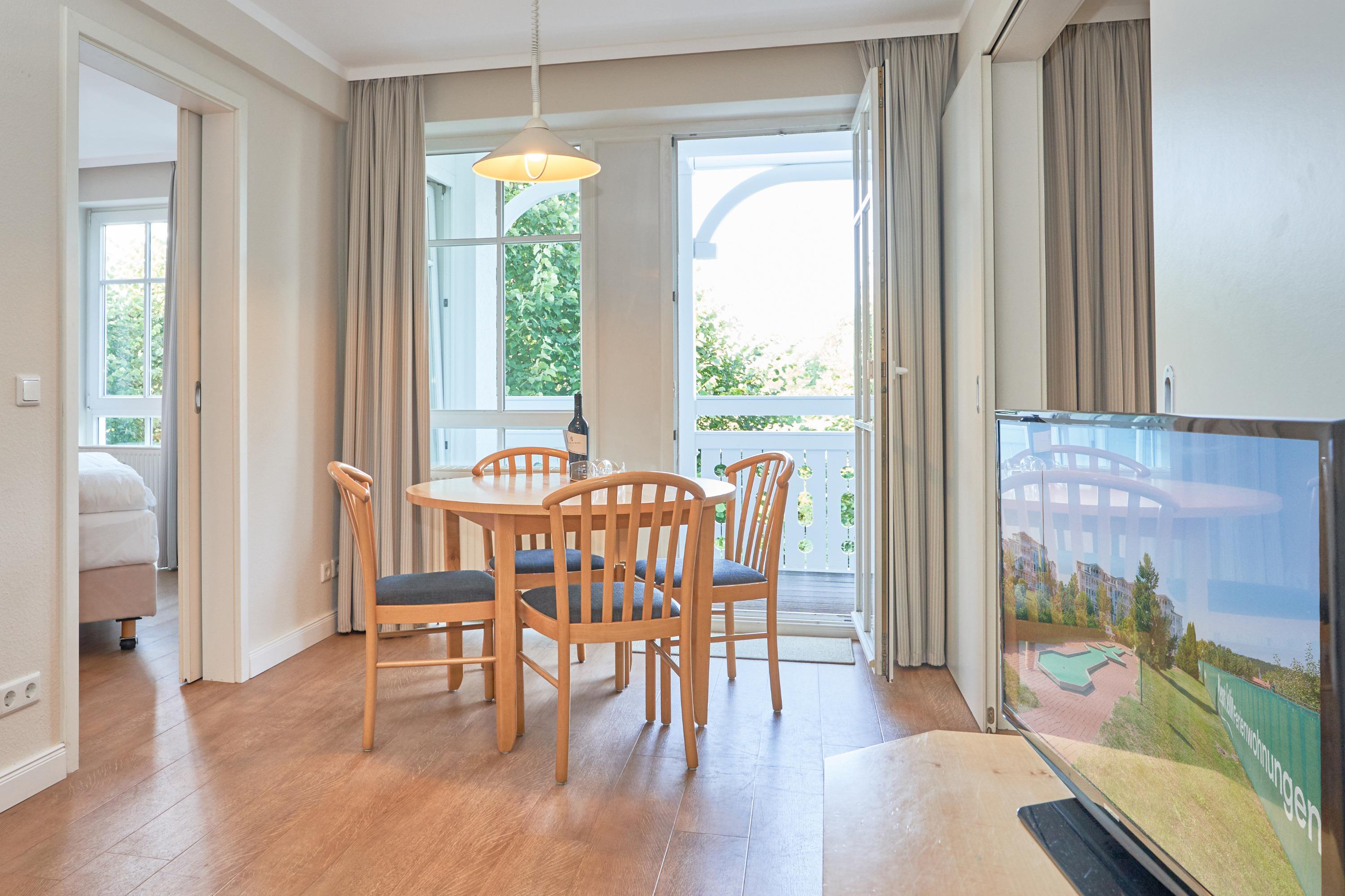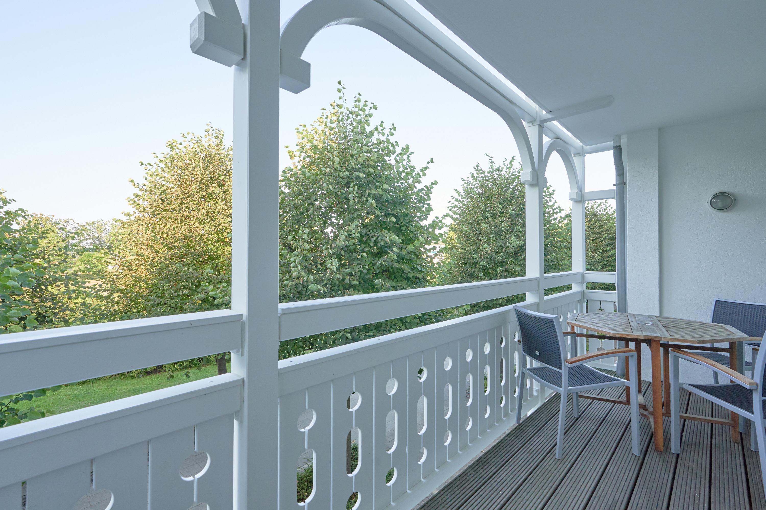 Auf dem Balkon in Südwestlage können Sie den Ausblick und die Sitzgruppe genießen und entspannte Stunden verbringen. In dieser Nichtraucher-Ferienwohnung sind keine Haustiere gestattet.