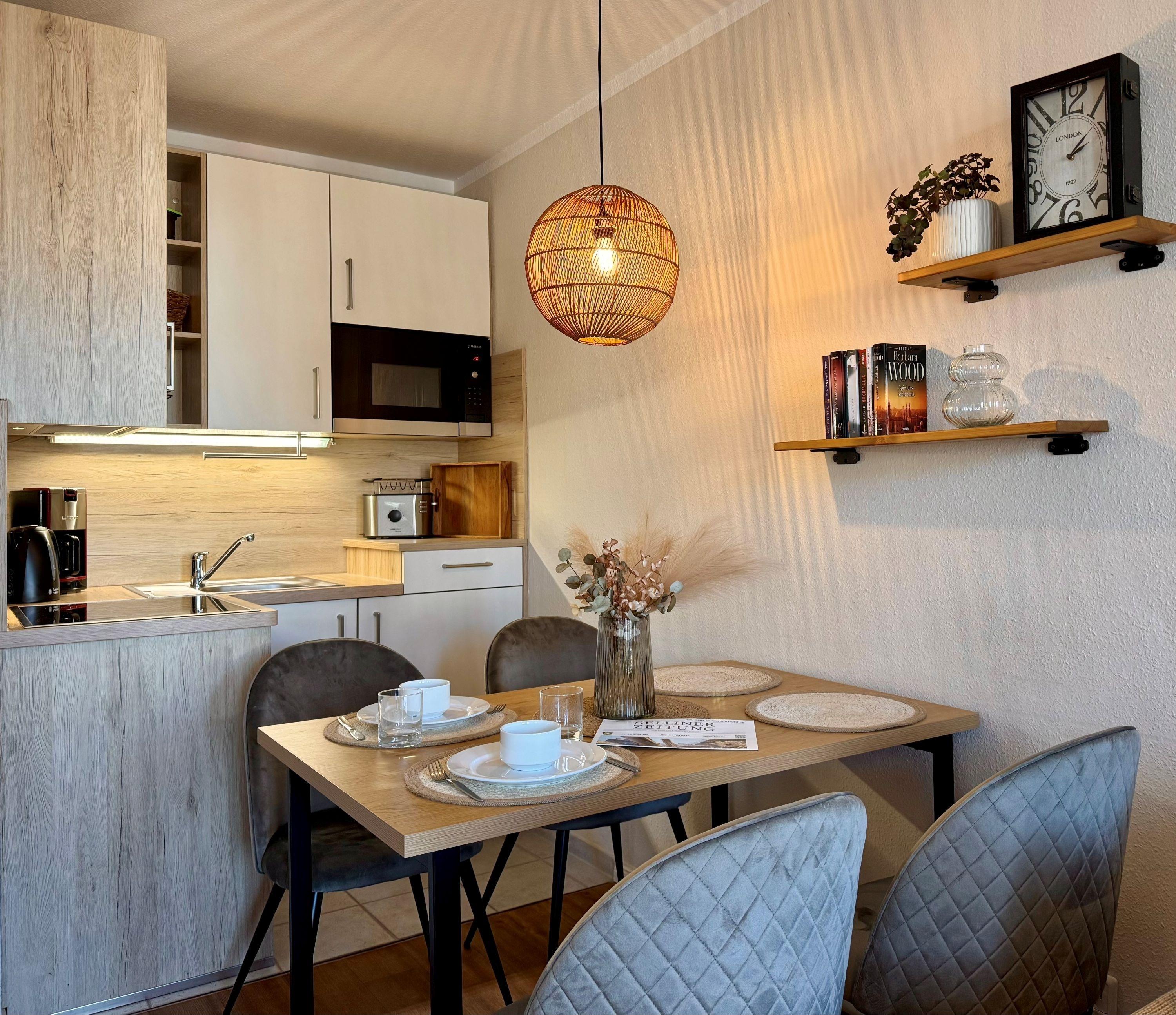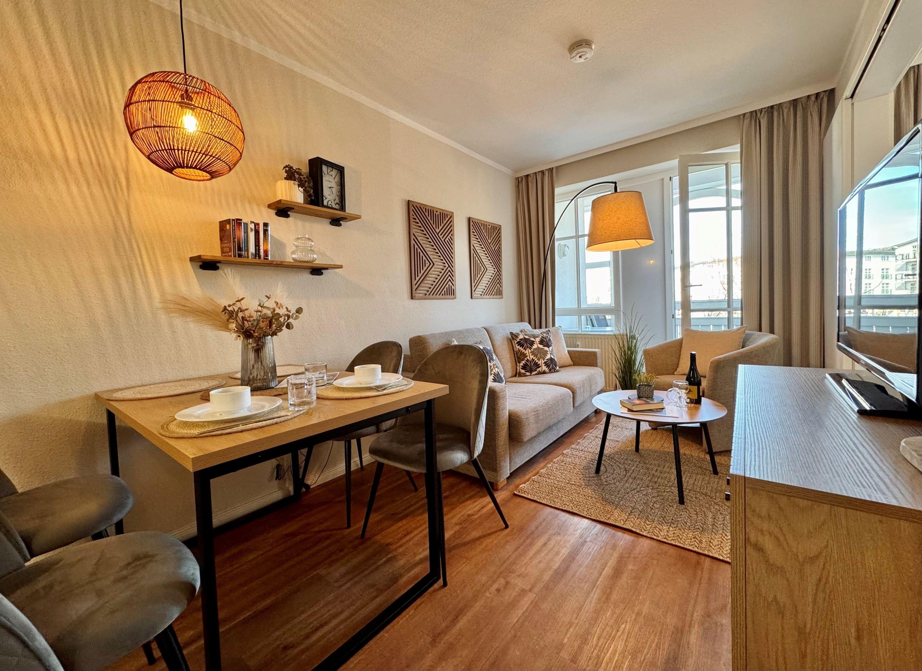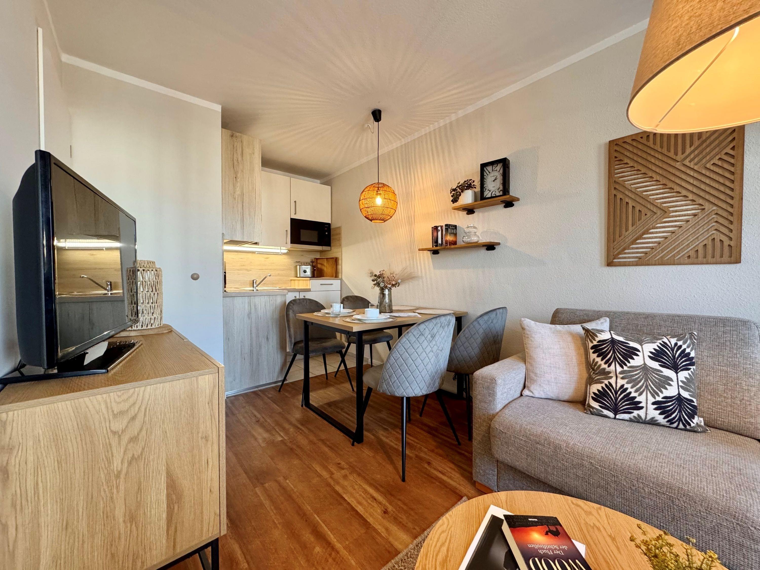Die Ferienwohnung verfügt über kostenfreies WLAN und die Erstausstattung an Bettwäsche ist inklusive. Das Schlafzimmer mit Verdunklung verfügt über ein Doppelbett, im Wohnzimmer befindet sich zusätzlich eine Doppelschlafcouch. Darüber hinaus verfügt die Ferienwohnung über ein Bad mit Dusche/WC, Föhn sowie einem Kosmetikspiegel. Die voll ausgestattete, offene Küche mit Geschirrspüler, Mikrowelle, Kaffeemaschine und Toaster lässt keine Wünsche offen. Ein Fernseher inkl. 3 Sky-Sender rundet die hochwertige Einrichtung ab. Nach einem erlebnisreichen Urlaubstag können Sie auf dem Balkon in Nordostlage Platz nehmen. Der Ausblick und die Sitzgruppe sorgen hier für ein wunderbares Urlaubsgefühl. Im Nichtraucher-Apartment ist ein mitreisendes Haustier gestattet.