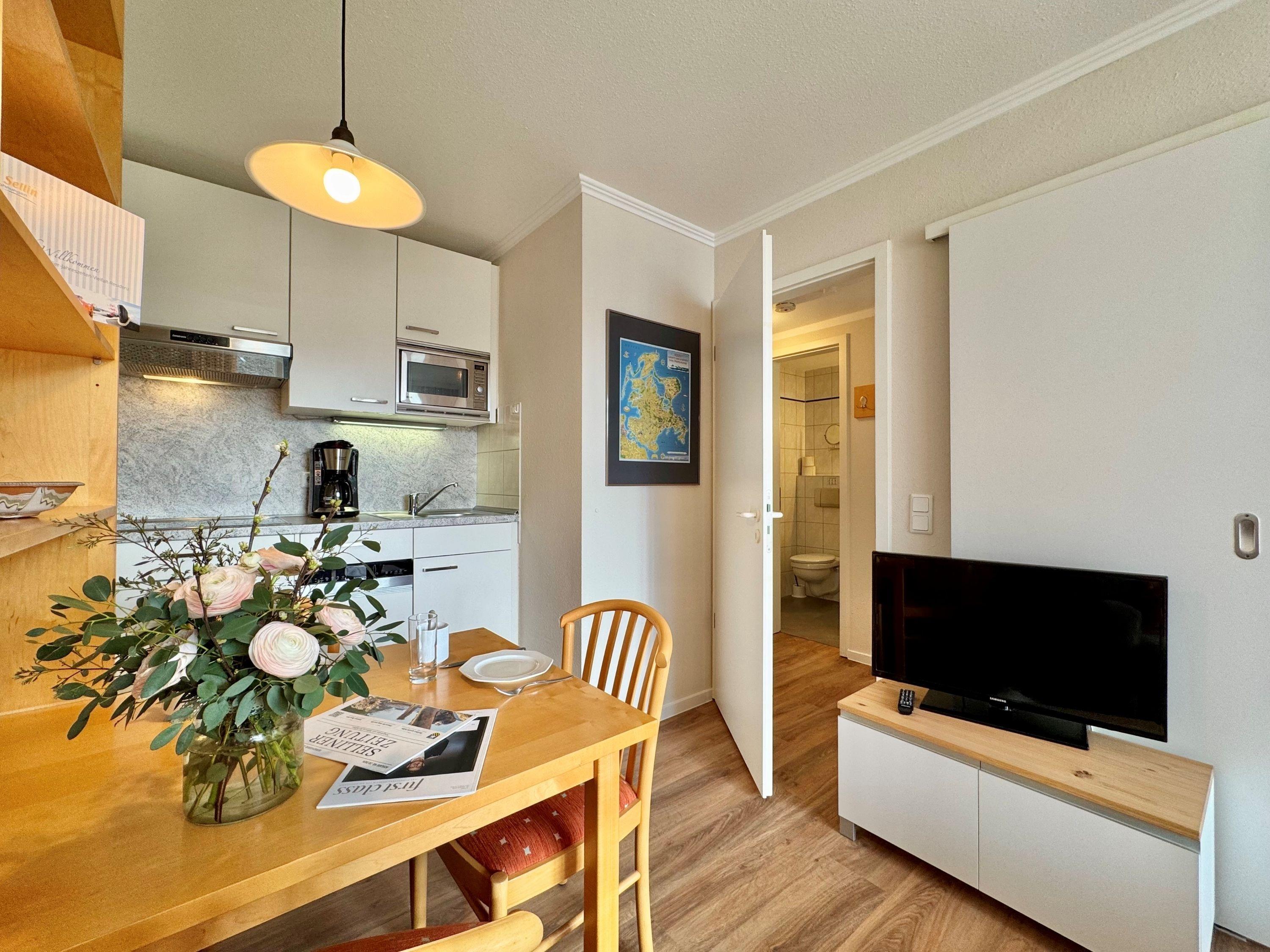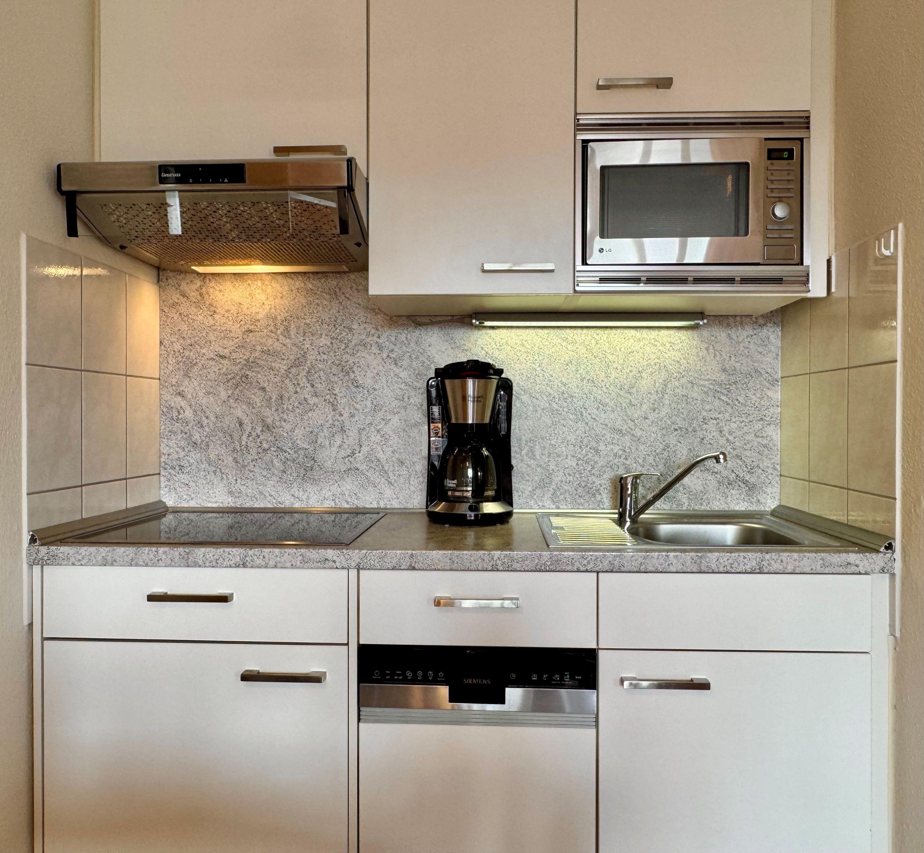 Die Ferienwohnung verfügt über kostenfreies WLAN und die Erstausstattung an Bettwäsche ist inklusive. Das Schlafzimmer mit Verdunklung verfügt über ein Doppelbett, im Wohnzimmer befindet sich zusätzlich eine Doppelschlafcouch. Darüber hinaus verfügt die Ferienwohnung über ein Bad mit Dusche/WC, Föhn sowie einem Kosmetikspiegel. Die voll ausgestattete, offene Küche mit Geschirrspüler, Mikrowelle, Kaffeemaschine und Toaster lässt keine Wünsche offen. Ein Fernseher inkl. 3 Sky-Sender rundet die hochwertige Einrichtung ab. Nach einem erlebnisreichen Urlaubstag können Sie auf dem Balkon in Südostlage Platz nehmen. Der Ausblick und die Sitzgruppe sorgen hier für ein wunderbares Urlaubsgefühl. Im Nichtraucher-Apartment ist ein mitreisendes Haustier gestattet.