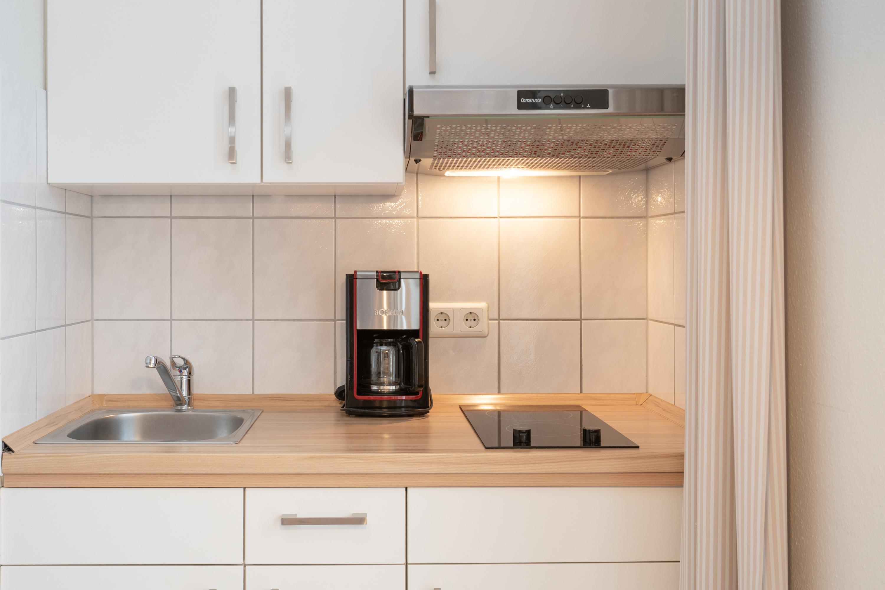 Die Ferienwohnung verfügt über kostenfreies WLAN und die Erstausstattung an Bettwäsche ist inklusive. Der kombinierte Wohn-/Schlafbereich mit Verdunklung verfügt über ein Doppelbett als Schrankbett. Darüber hinaus verfügt die Ferienwohnung über ein Bad mit Dusche/WC. Die voll ausgestattete Pantry mit Kaffeemaschine und Toaster lässt keine Wünsche offen. Ein Fernseher inkl. 3 Sky-Sender rundet die gute Einrichtung ab.