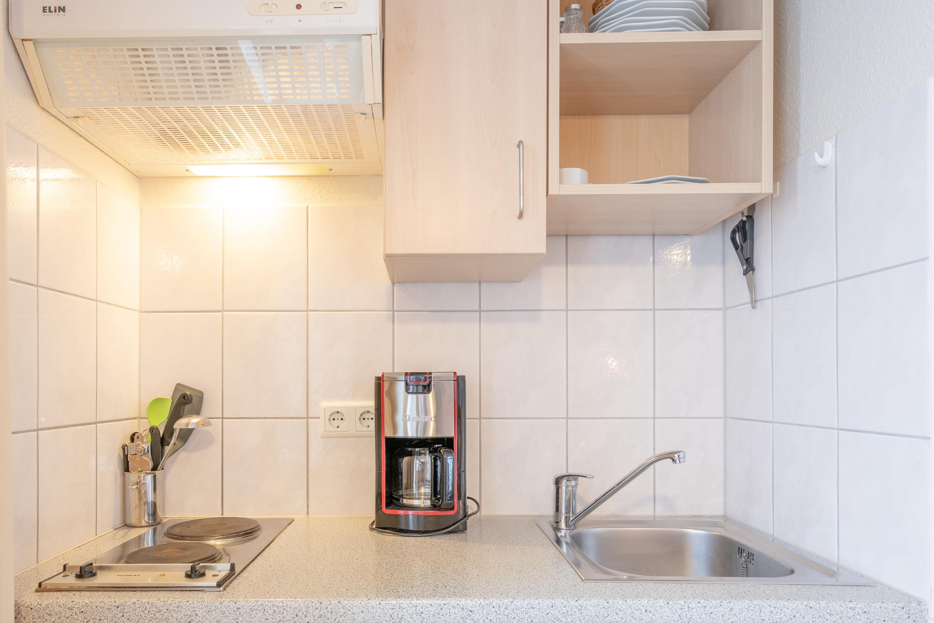 Die Ferienwohnung verfügt über kostenfreies WLAN und die Erstausstattung an Bettwäsche ist inklusive. Der kombinierte Wohn-/Schlafbereich mit Verdunklung verfügt über ein Schlafsofa. Darüber hinaus verfügt die Ferienwohnung über ein Bad mit Dusche/WC und Föhn. Die voll ausgestattete Pantry mit Kaffeemaschine und Toaster lässt keine Wünsche offen. Ein Fernseher inkl. 3 Sky-Sender rundet die gute Einrichtung ab.
