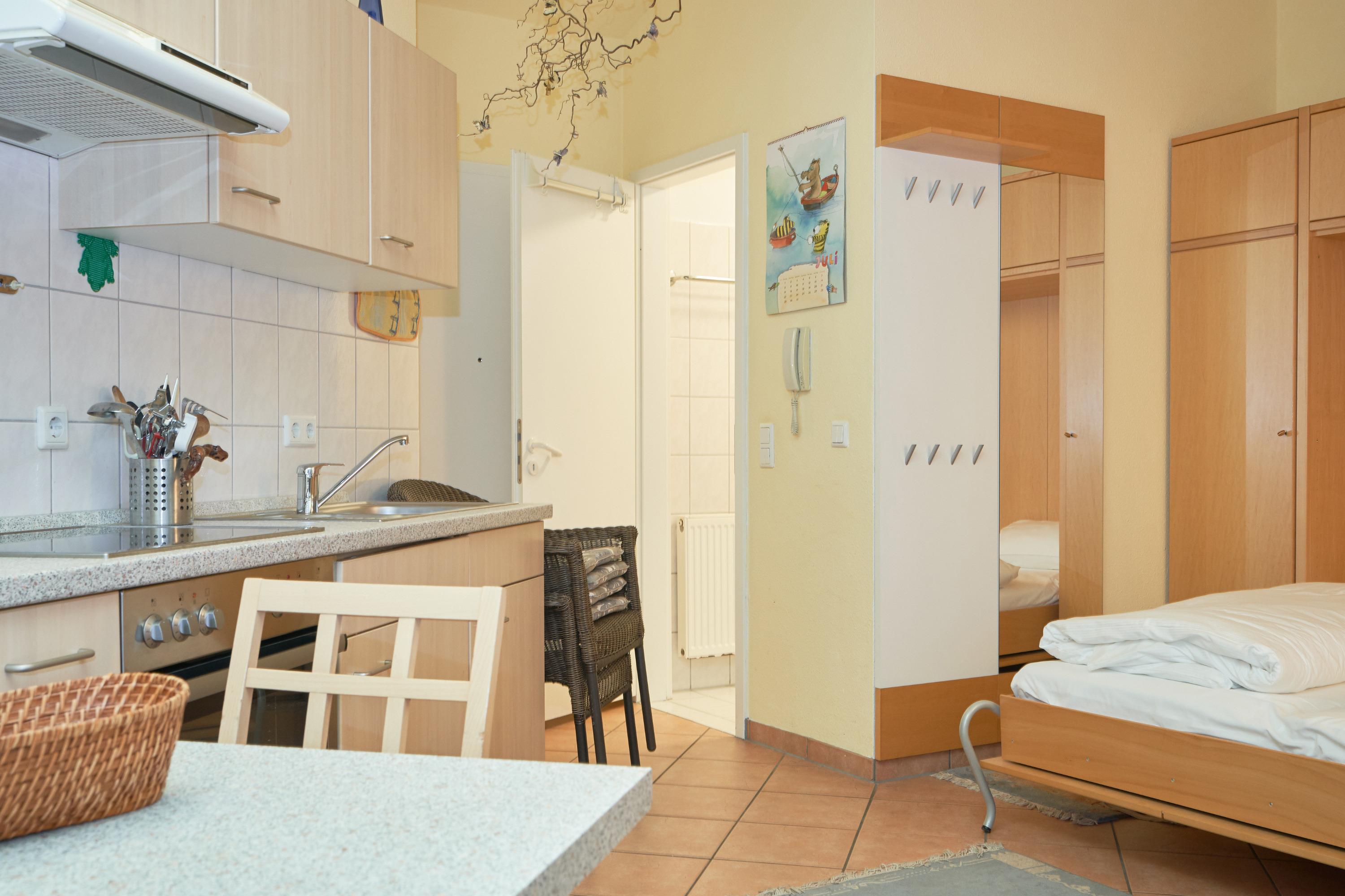 Die Ferienwohnung verfügt über kostenfreies WLAN und die Erstausstattung an Bettwäsche ist inklusive. Der kombinierte Wohn-/Schlafbereich mit Verdunklung verfügt über ein Schrankbett. Darüber hinaus verfügt die Ferienwohnung über ein Bad mit Dusche/WC. Die voll ausgestattete Pantry mit Kaffeemaschine und Toaster lässt keine Wünsche offen. Ein Fernseher inkl. 3 Sky-Sender rundet die gute Einrichtung ab. Im Nichtraucher-Apartment ist ein mitreisendes Haustier gestattet.