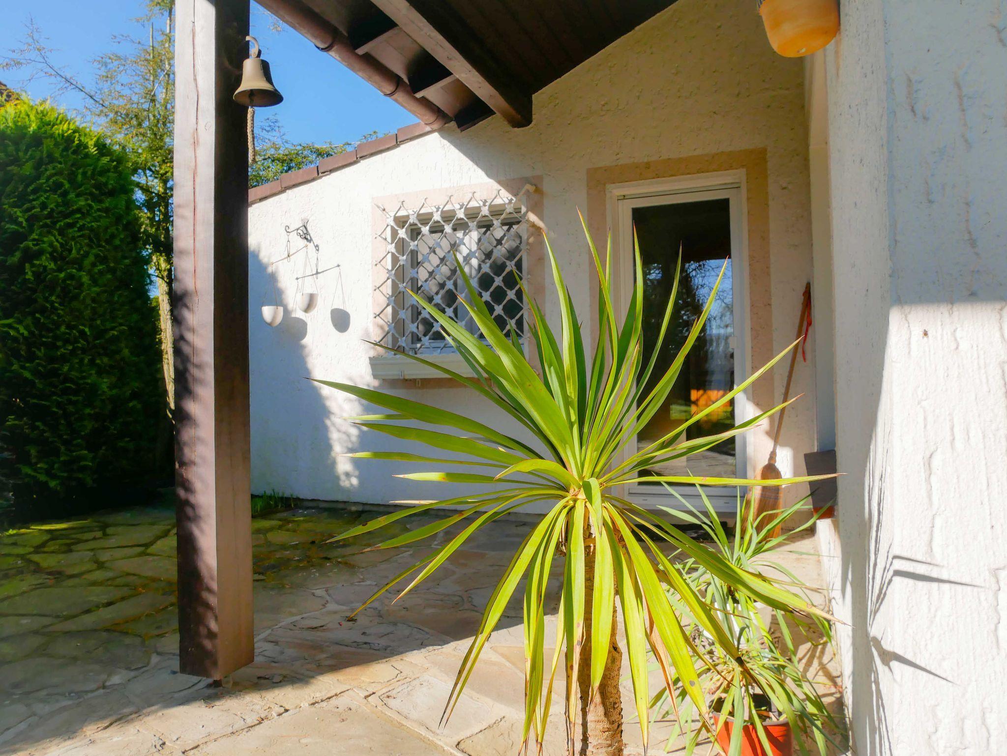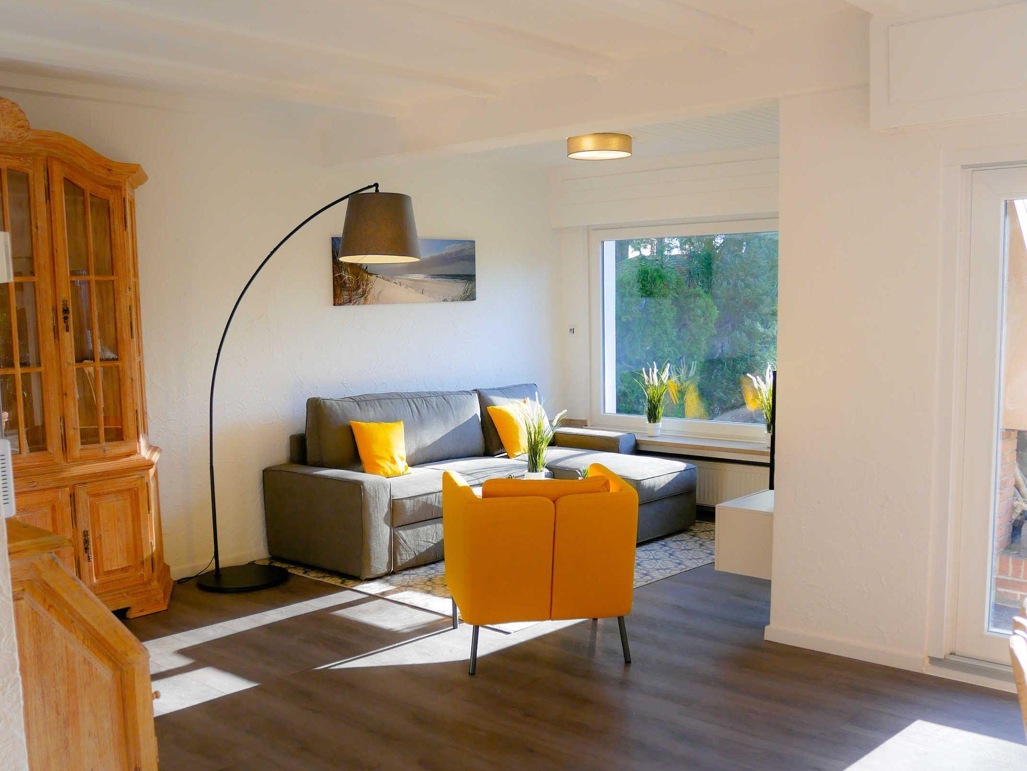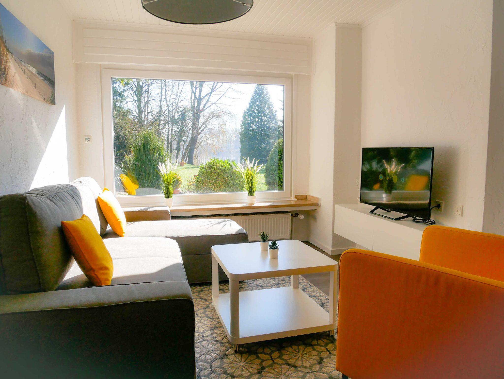 jedoch für sich. Das Schlafzimmer, mit direktem Zugang zur Terrasse und dem Garten, verfügt über ein gemütliches Boxspringbett (1,8 m x 2,0 m). Eine voll ausgestattete Küche, ein großer Esstisch, ein bequemes Sofa im Wohnbereich samt Smart-TV und ein Bad mit Dusche bescheren ein Zuhause-Gefühl. Das Schlafsofa bietet 2 weiteren Personen eine angenehme Übernachtungsmöglichkeit.