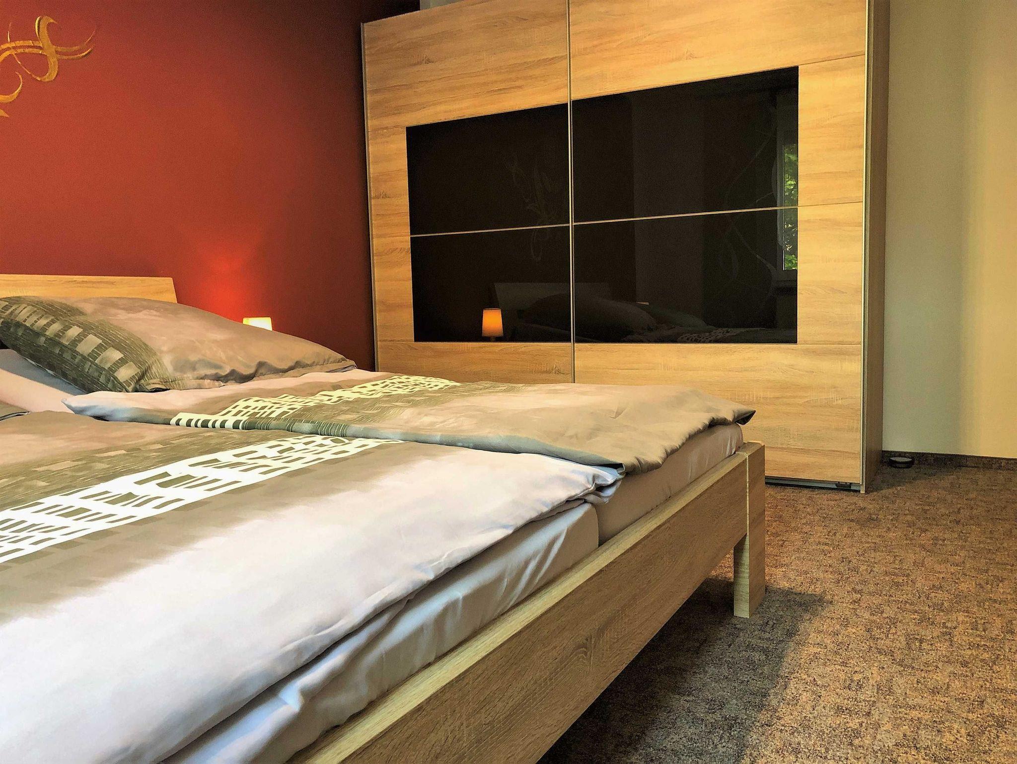 Bitte beachten: Bei einer Buchung für bis zu 4 Personen stehen Ihnen ein Schlafzimmer mit Doppelbett und ein kombinierter Wohnschlafraum mit französischen Bett und TV zur Verfügung. Bei einer Buchung ab 5 Personen können Sie auch den zweiten Wohn-Schlafraum mit Doppelbett, Kamin und TV nutzen.