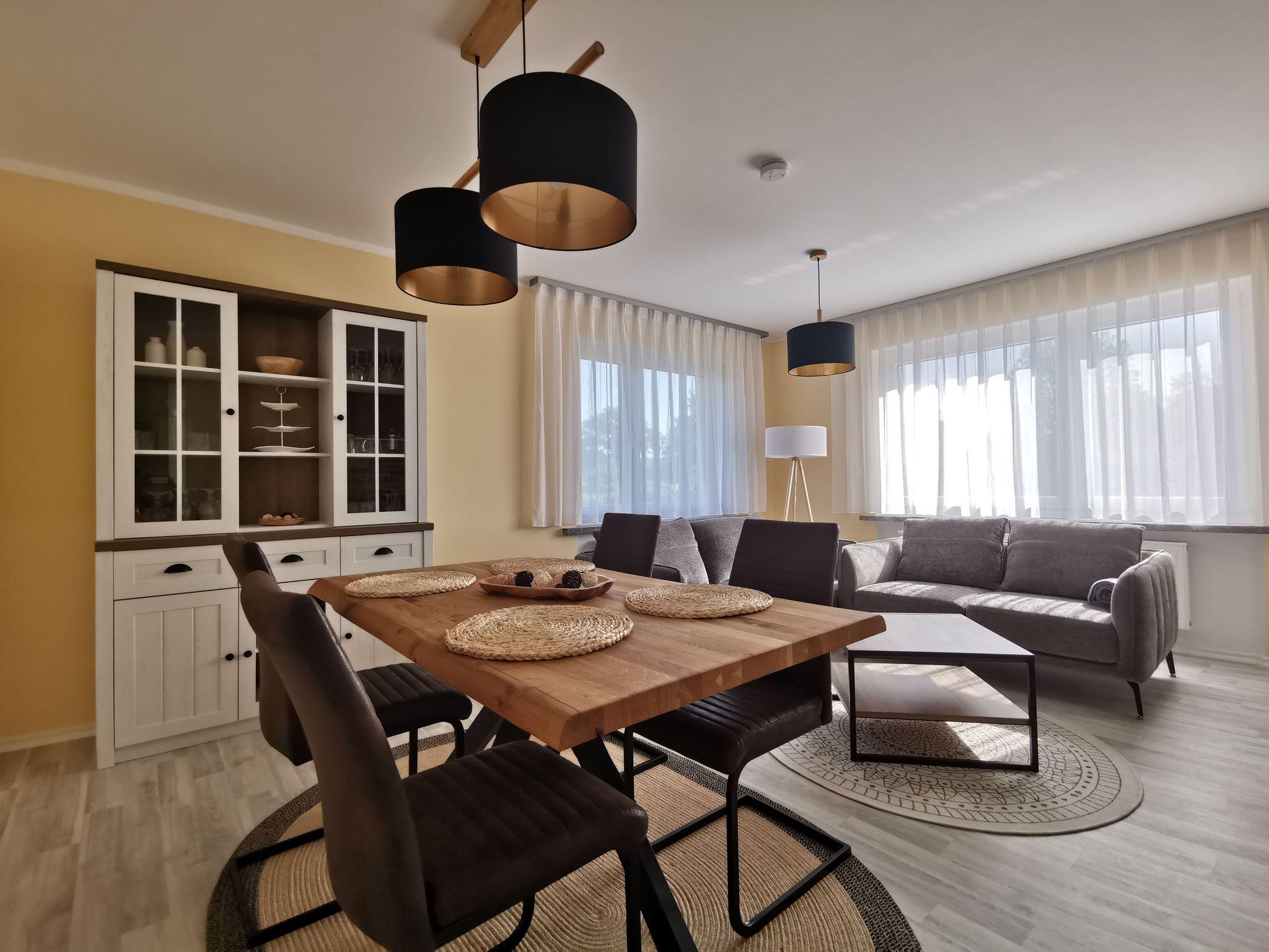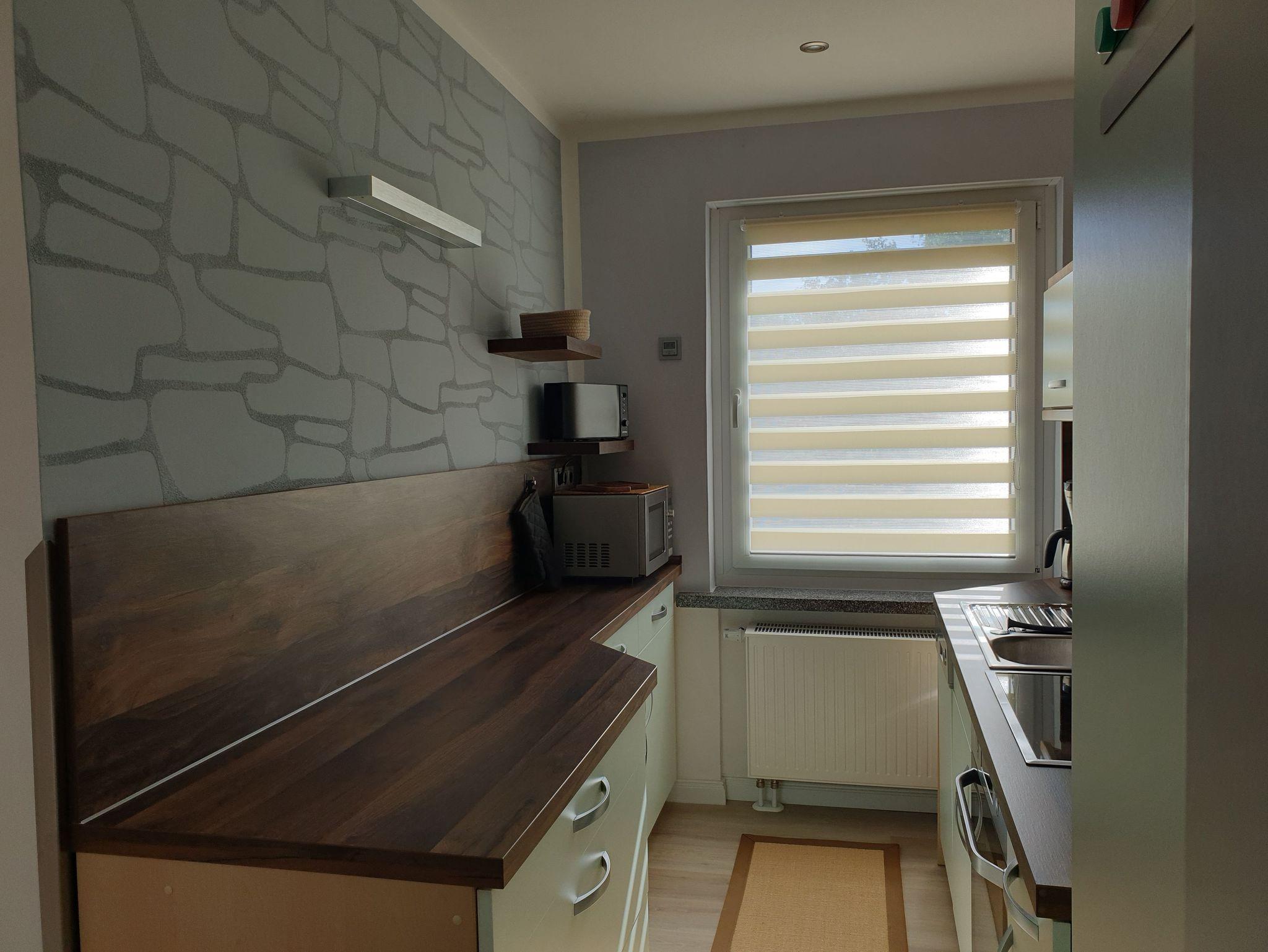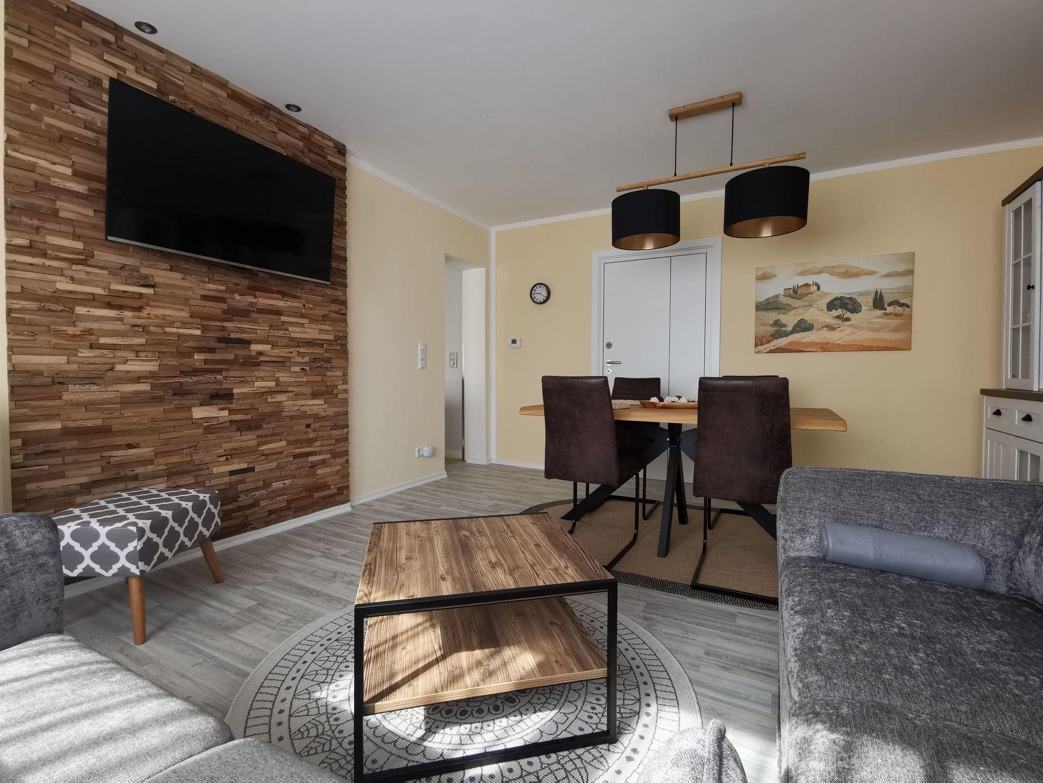 In der Ferienwohung ist ein Wohnraum mit TV, Esstisch und gemütlichen Sitzmöglichkeiten, ein separater Schlafraum mit TV und einem Doppelbett (1,80 x2,00) und einem Etagenbett. Die Einbauküche ist separat und komplett ausgestattet mit Mikrowelle, Geschirrspüler und Backofen, der Esstisch befindet sich im Wohnzimmer. Das Bad ist ausgesttattet mit ebenerdiger großer Dusche, WC und Waschbecken. Im Wohnraum ist eine Musikanlage vorhanden. WLAN ist für die Gäste verfügbar.