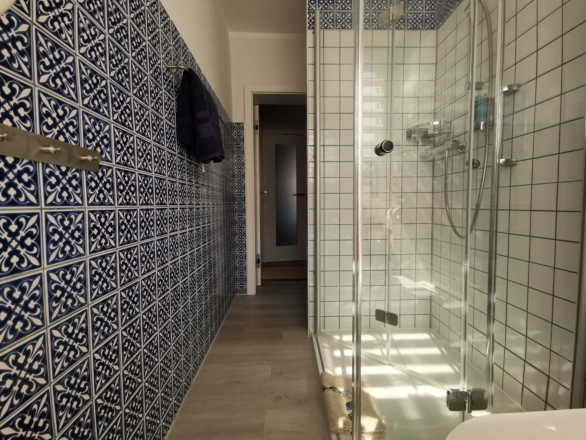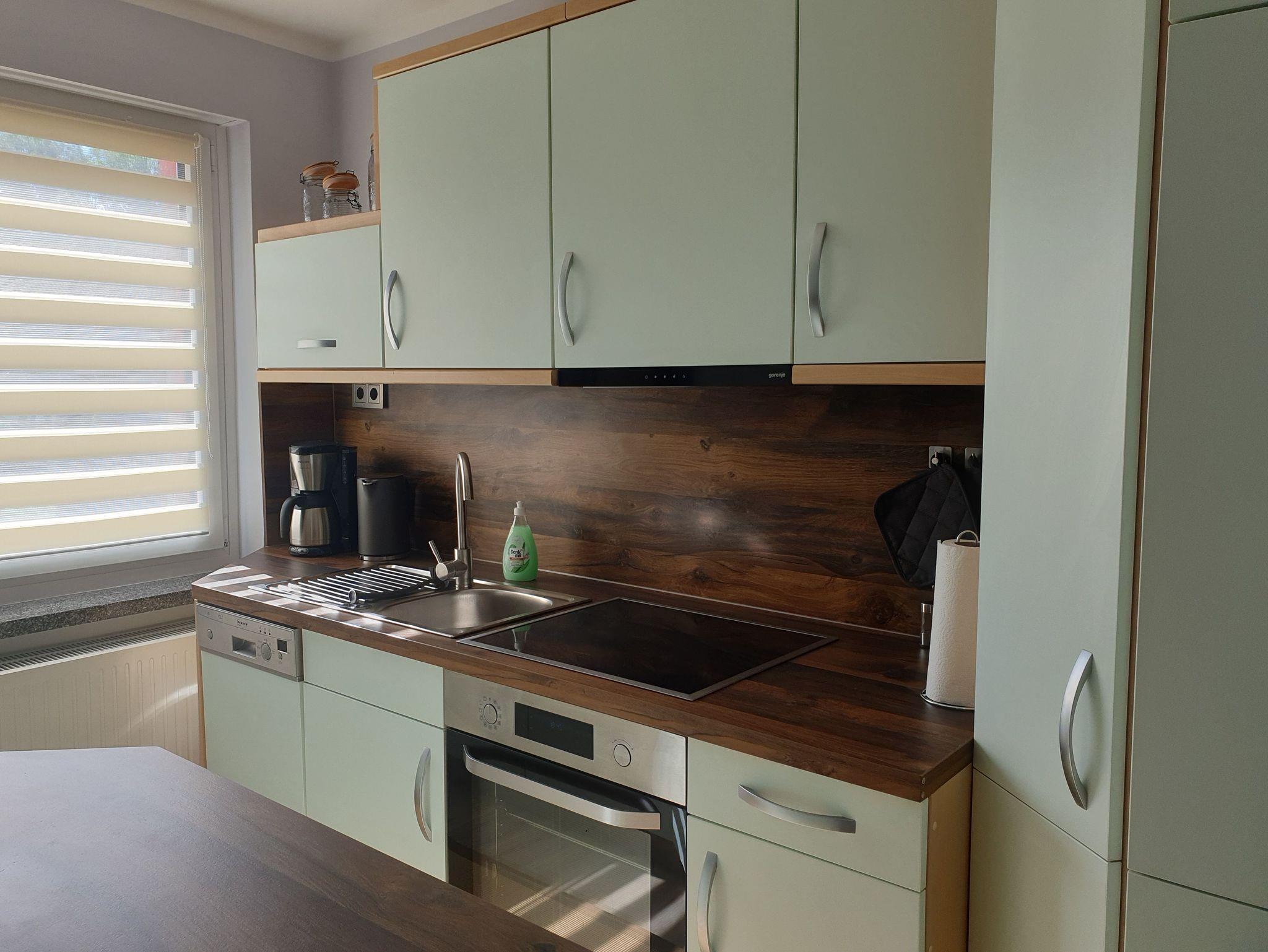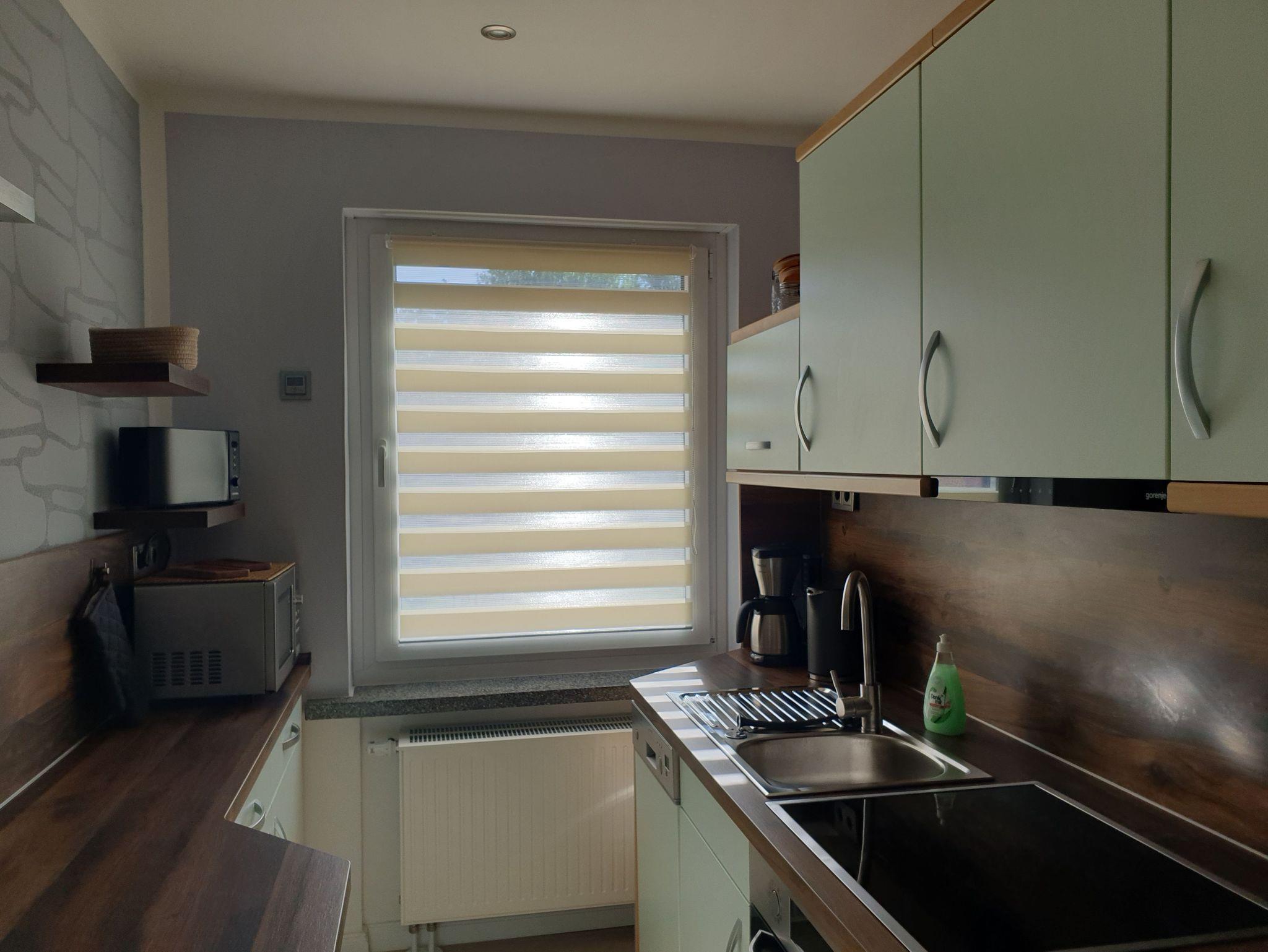 In der Ferienwohung ist ein Wohnraum mit TV, Esstisch und gemütlichen Sitzmöglichkeiten, ein separater Schlafraum mit TV und einem Doppelbett (1,80 x2,00) und einem Etagenbett. Die Einbauküche ist separat und komplett ausgestattet mit Mikrowelle, Geschirrspüler und Backofen, der Esstisch befindet sich im Wohnzimmer. Das Bad ist ausgesttattet mit ebenerdiger großer Dusche, WC und Waschbecken. Im Wohnraum ist eine Musikanlage vorhanden. WLAN ist für die Gäste verfügbar.