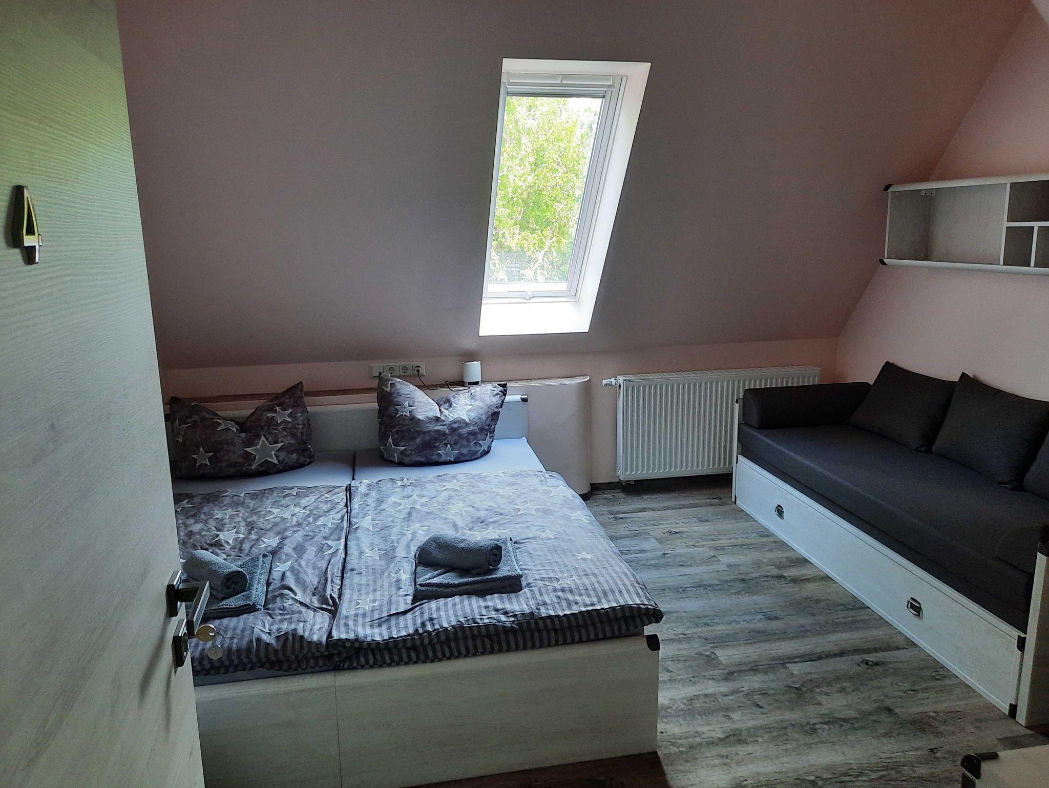 Das Zimmer verfügt über 1 Doppelbett mit einer ausziehbaren Schlafcouch, TV und Schrank.