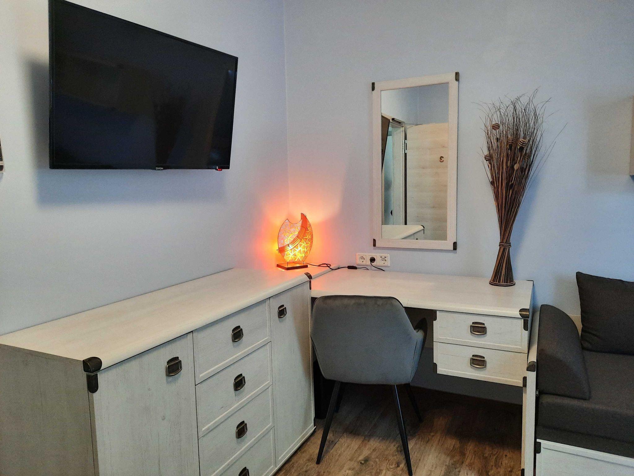 Das Zimmer verfügt über 1 Doppelbett mit einer ausziehbaren Schlafcouch, TV und Schrank.